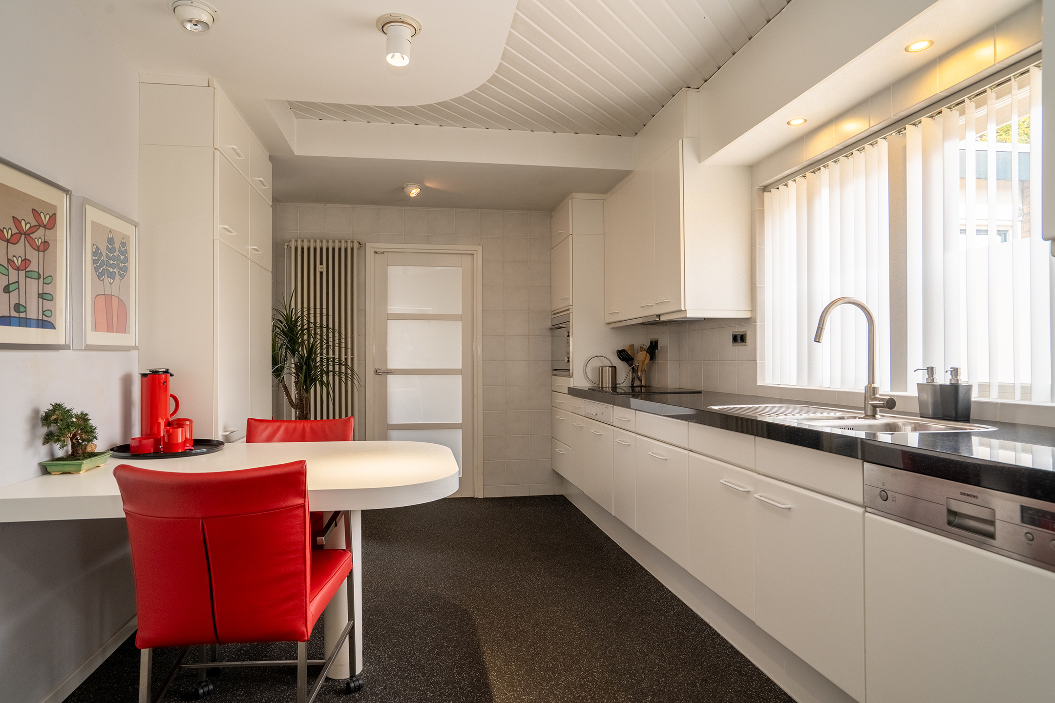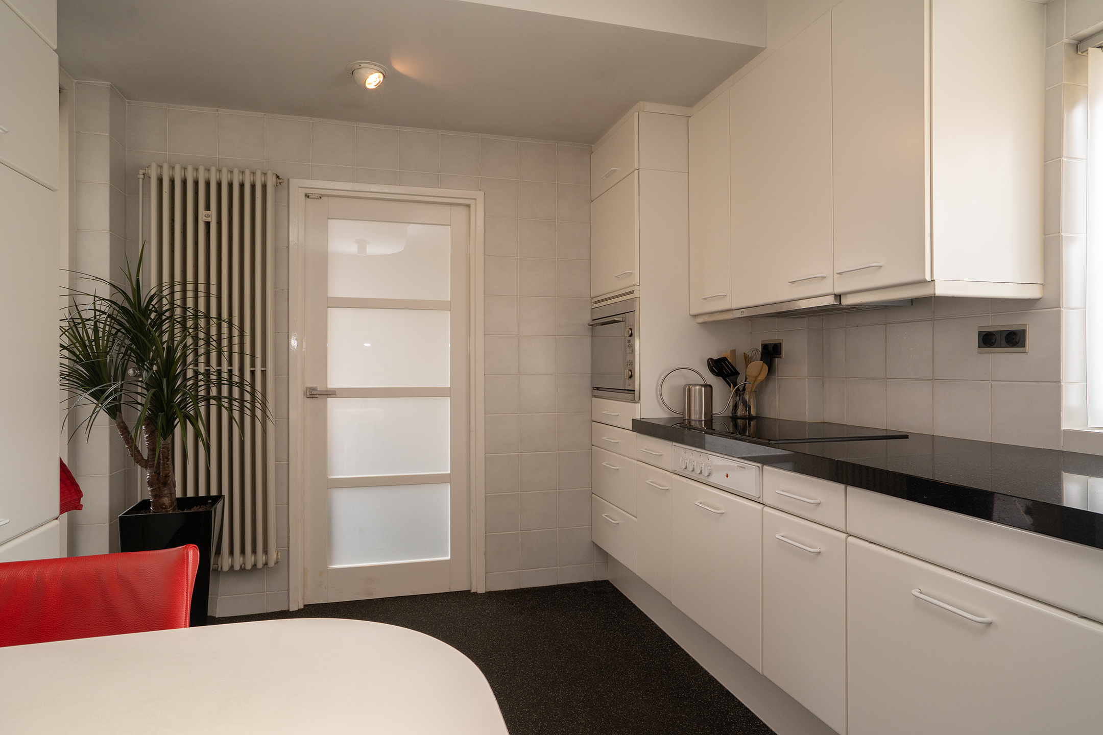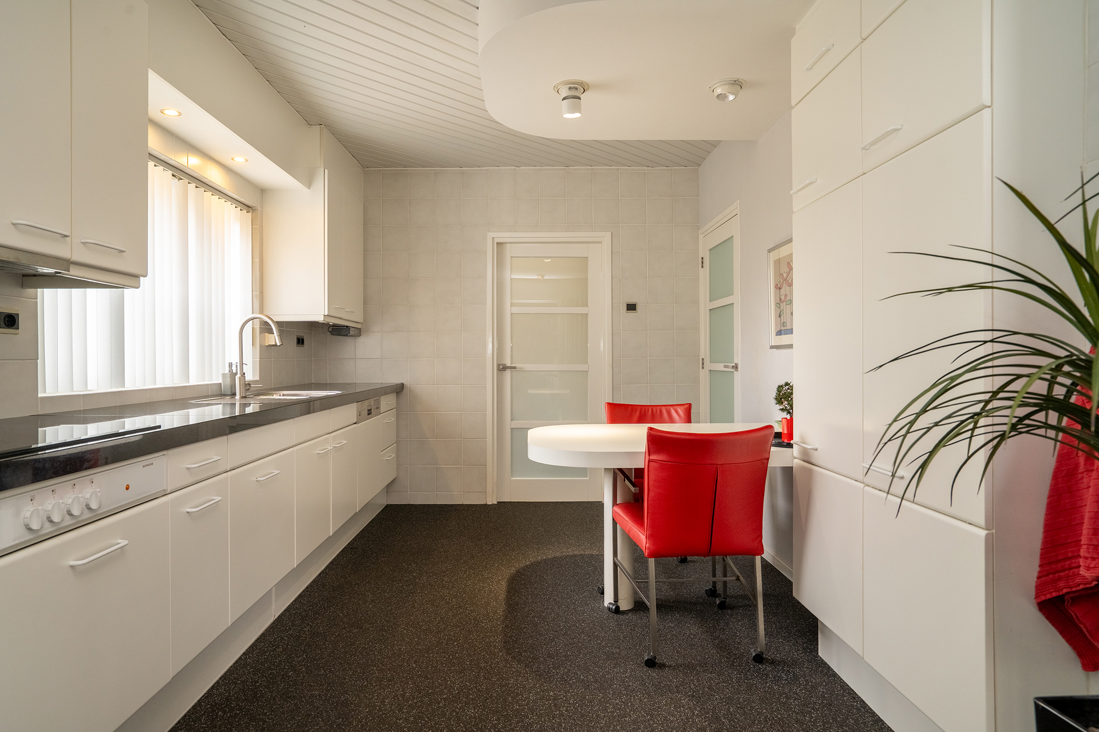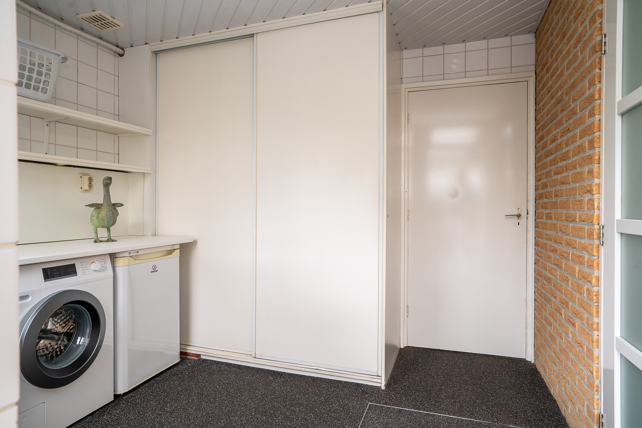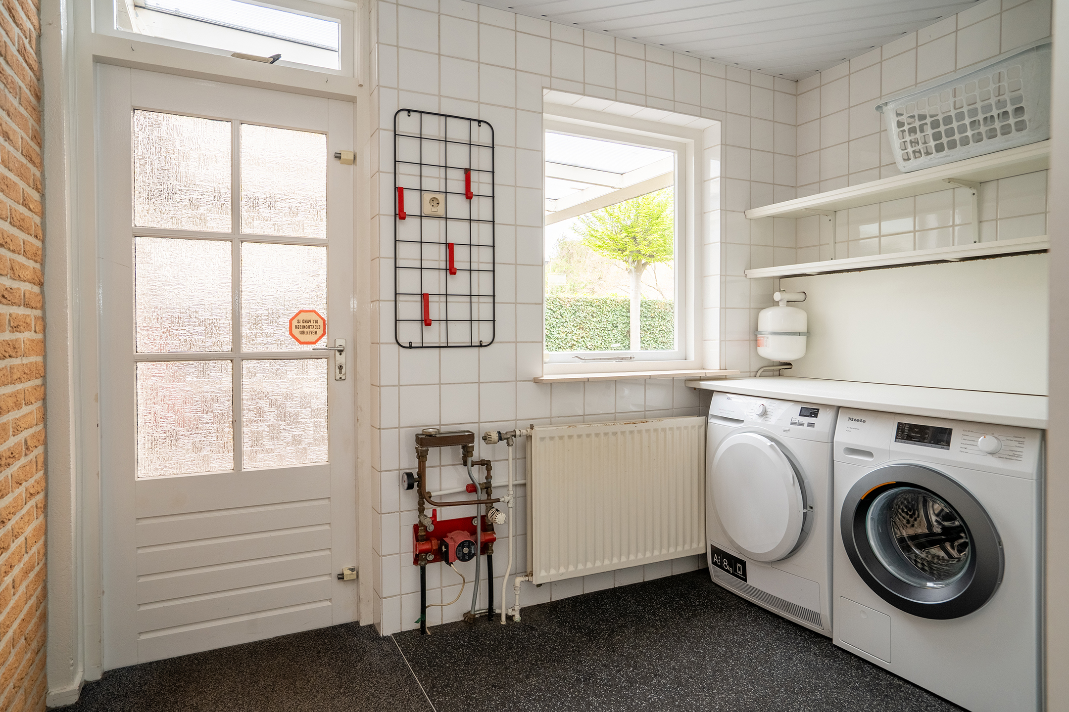 Achter de keuken bevindt zich de praktische bijkeuken met aansluitingen voor de wasmachine en droger, evenals ruimte voor bijvoorbeeld een extra koelkast of vriezer. Vanuit hier is er tevens toegang tot de achtertuin.