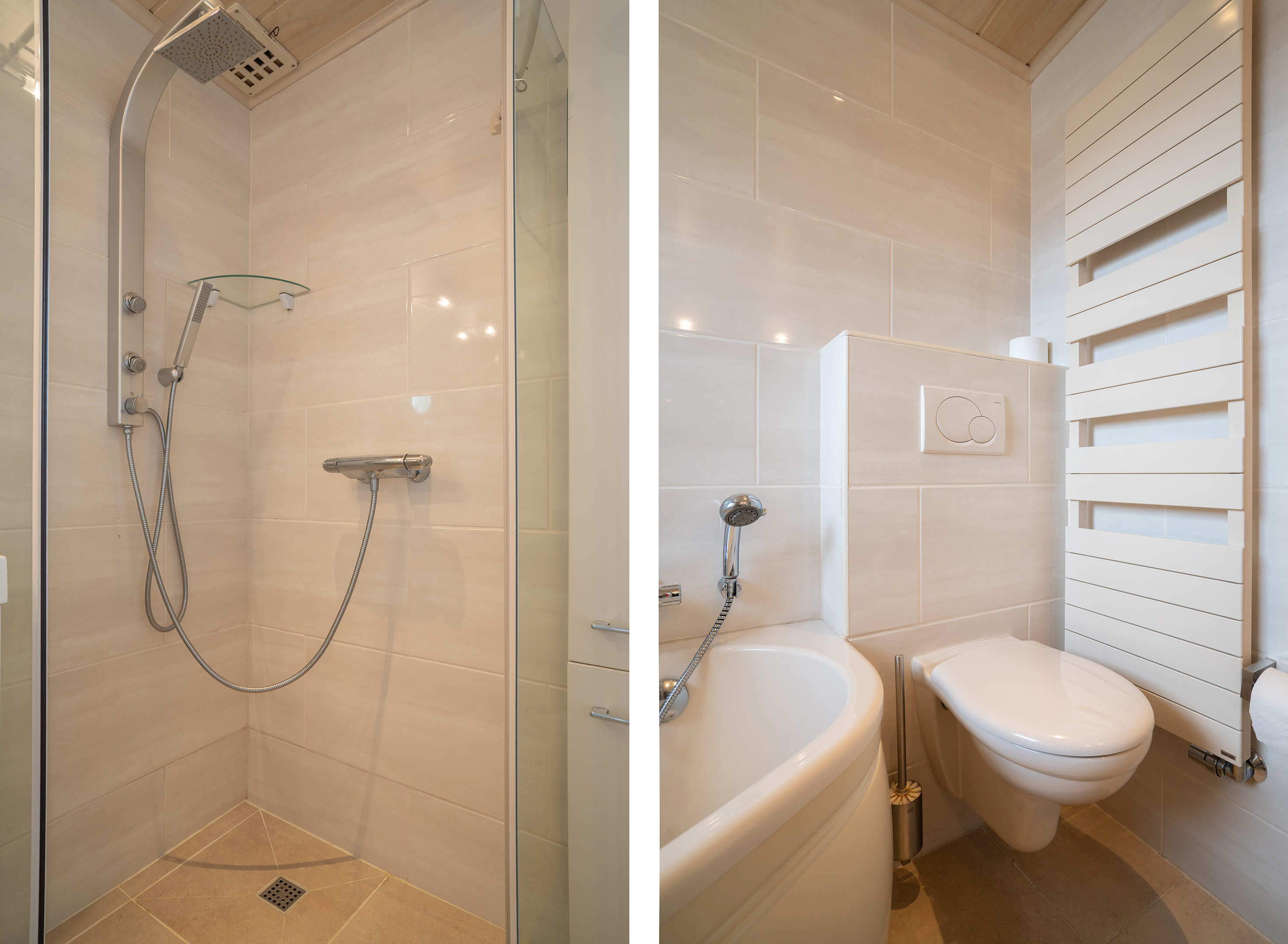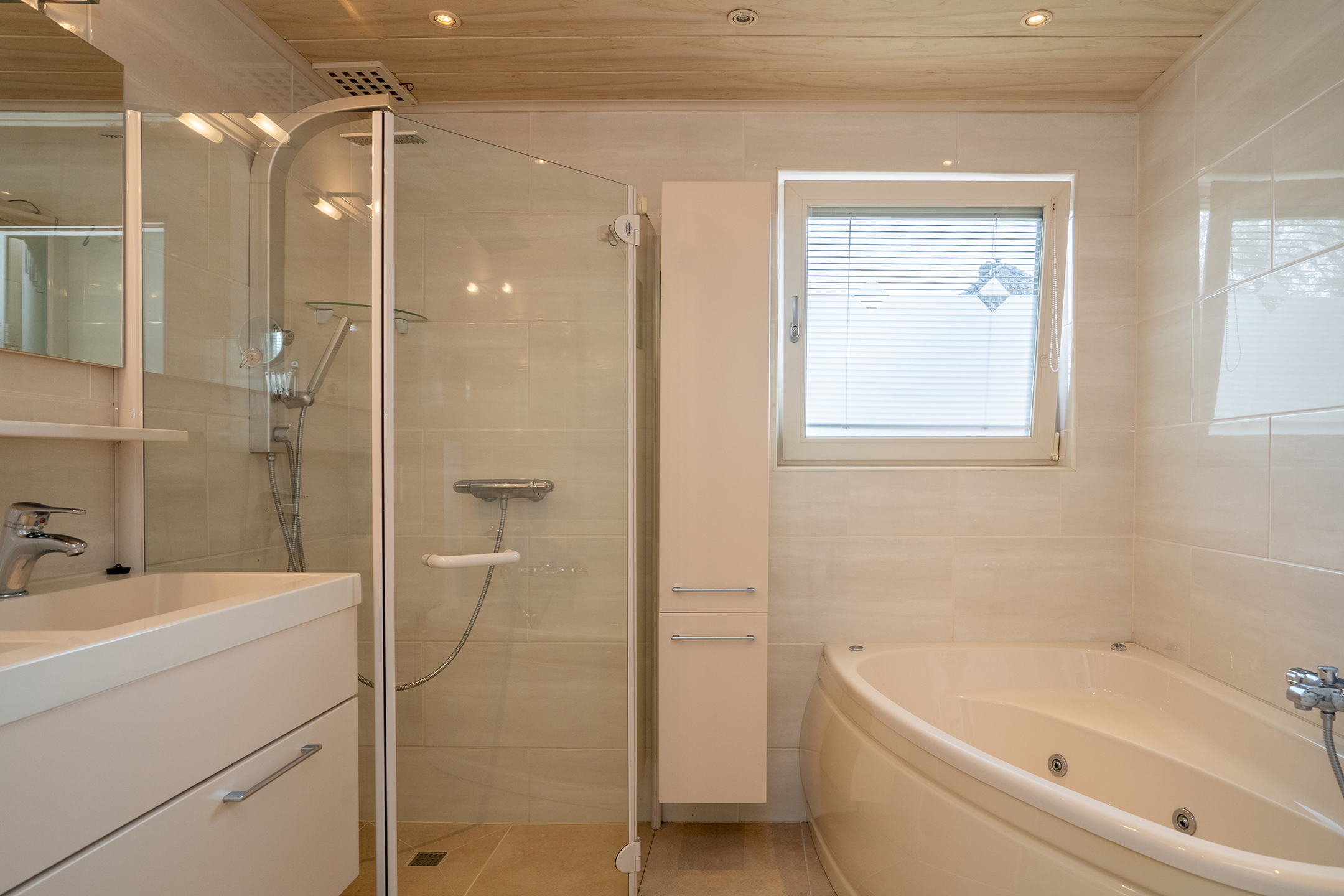 De badkamer is volledig betegeld en verzorgd uitgevoerd. Deze is voorzien van een raam voor natuurlijke ventilatie, een ligbad met jets, een douche met zowel een stortdouche als handdouche, een dubbele wastafel met spiegel, een hangcloset en een radiator.