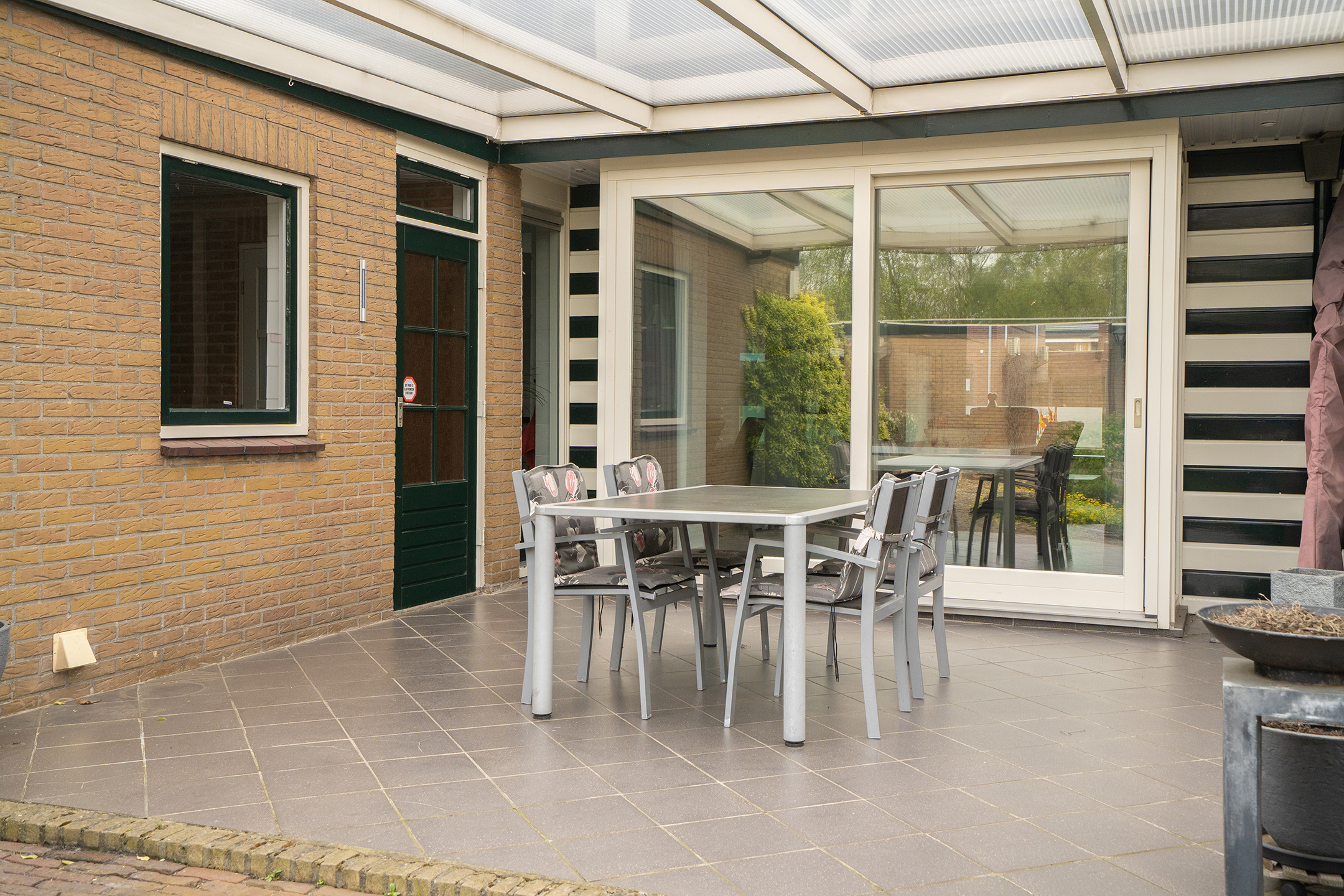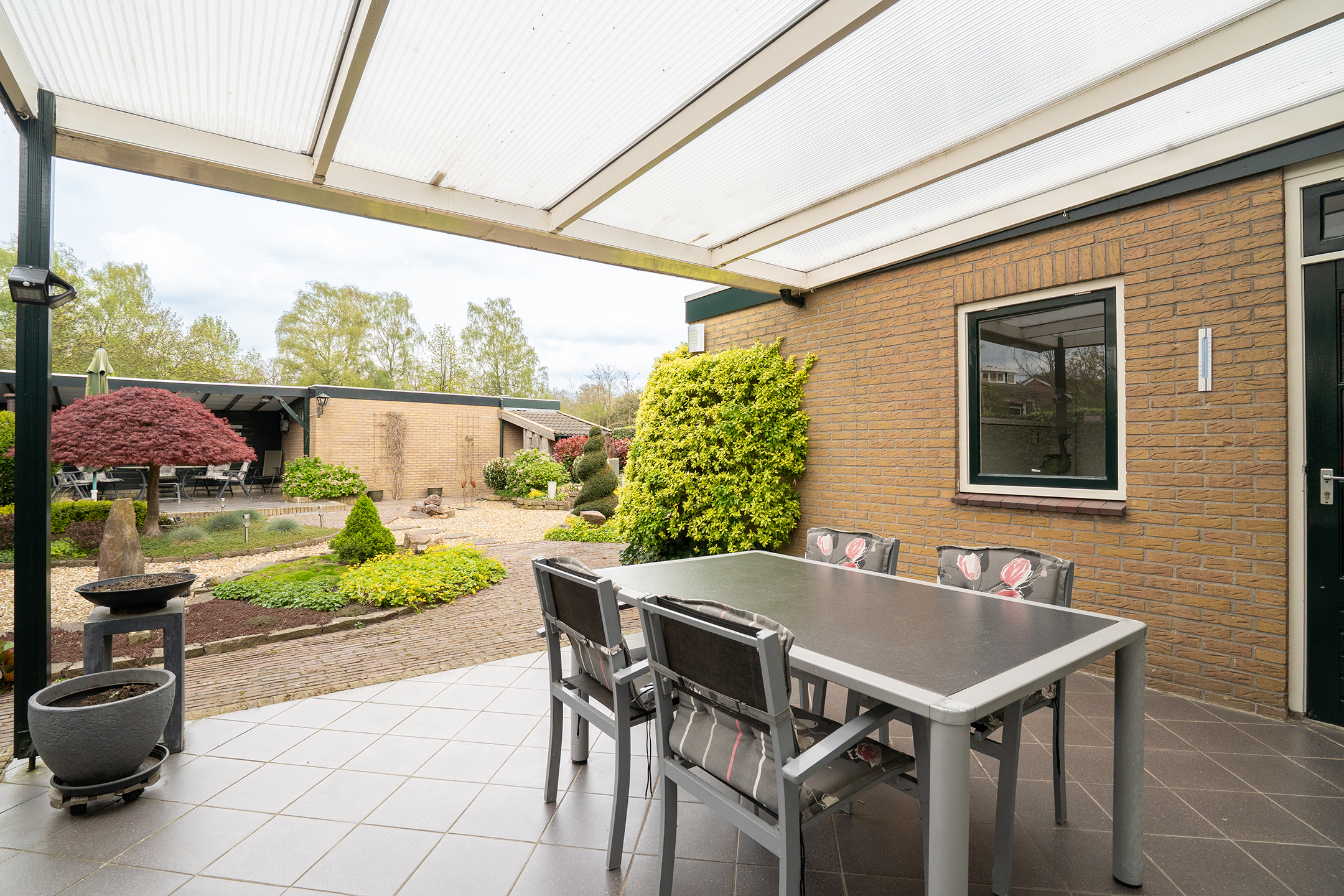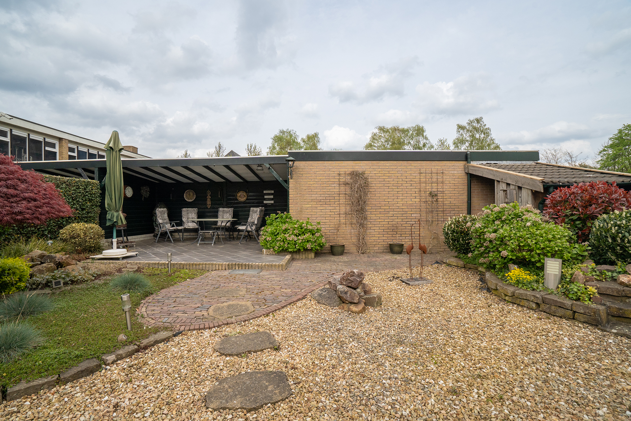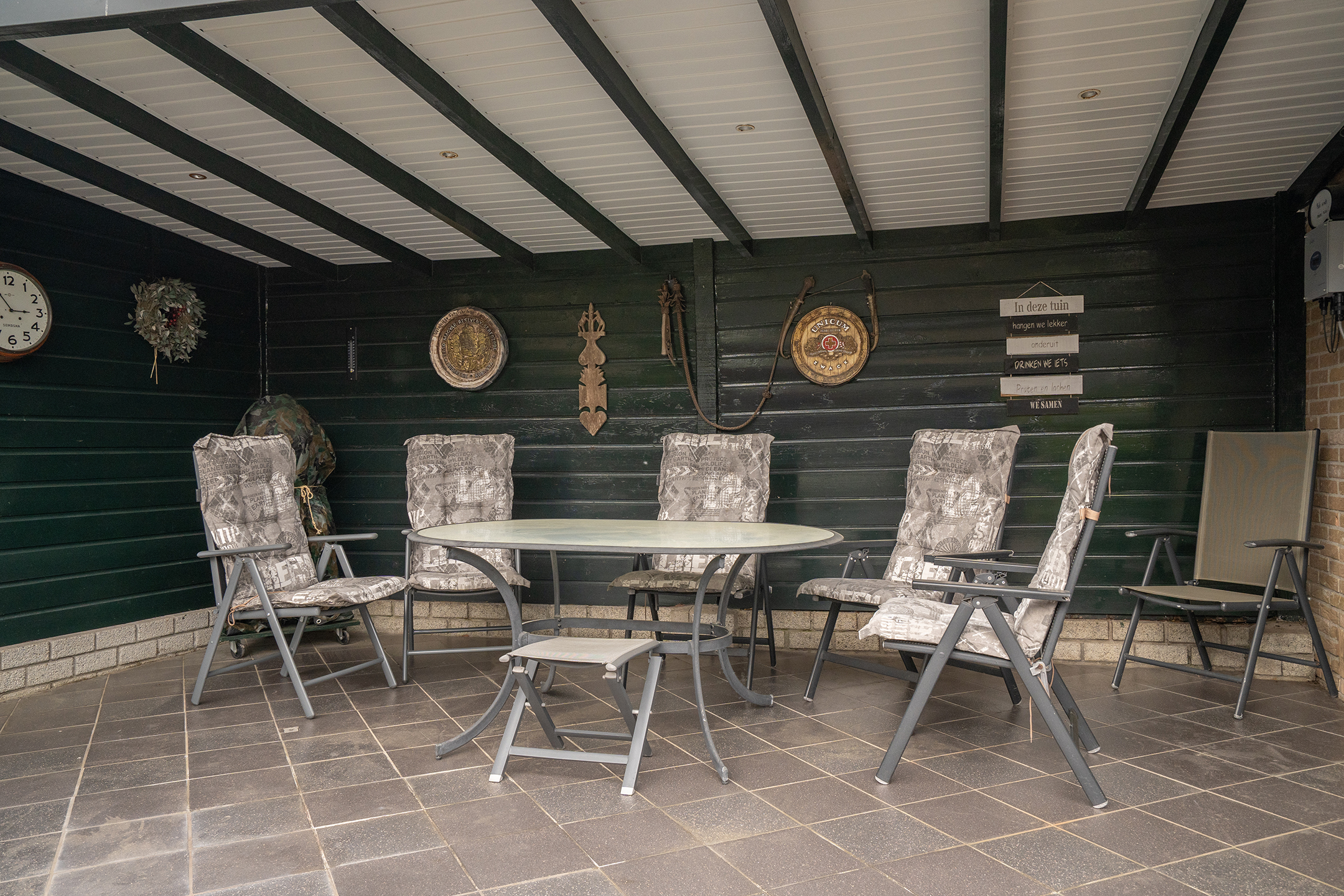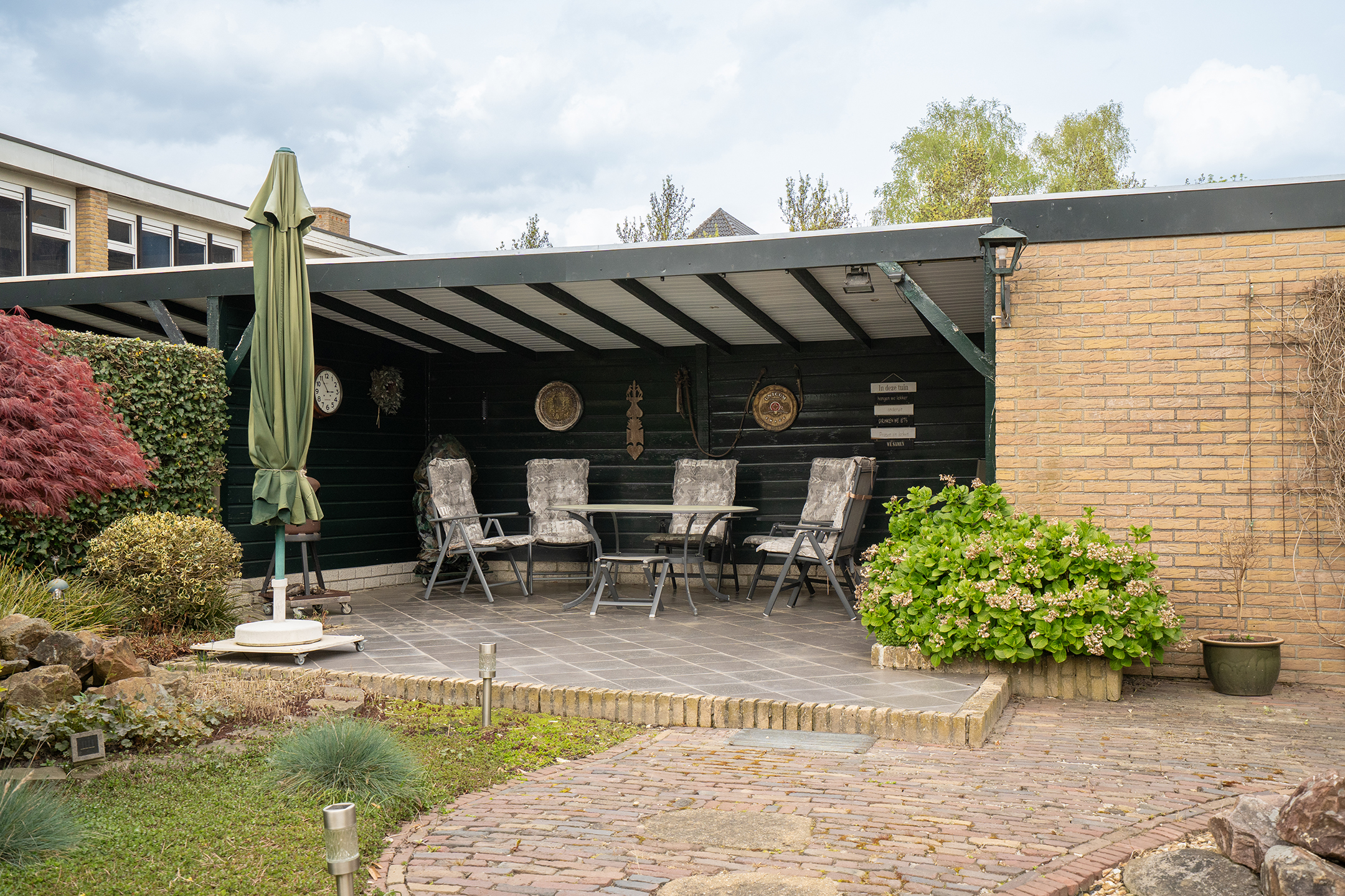 Verspreid over de tuin bevinden zich meerdere terrassen, waardoor er altijd wel een fijne plek in de zon of schaduw te vinden is. Direct aan de woning is een ruime overkapping gerealiseerd, ideaal om het hele jaar door comfortabel buiten te zitten. Daarnaast is er aan de zijkant van de woning een extra overdekte ruimte, perfect voor bijvoorbeeld het stallen van containers of als praktische bergruimte.
