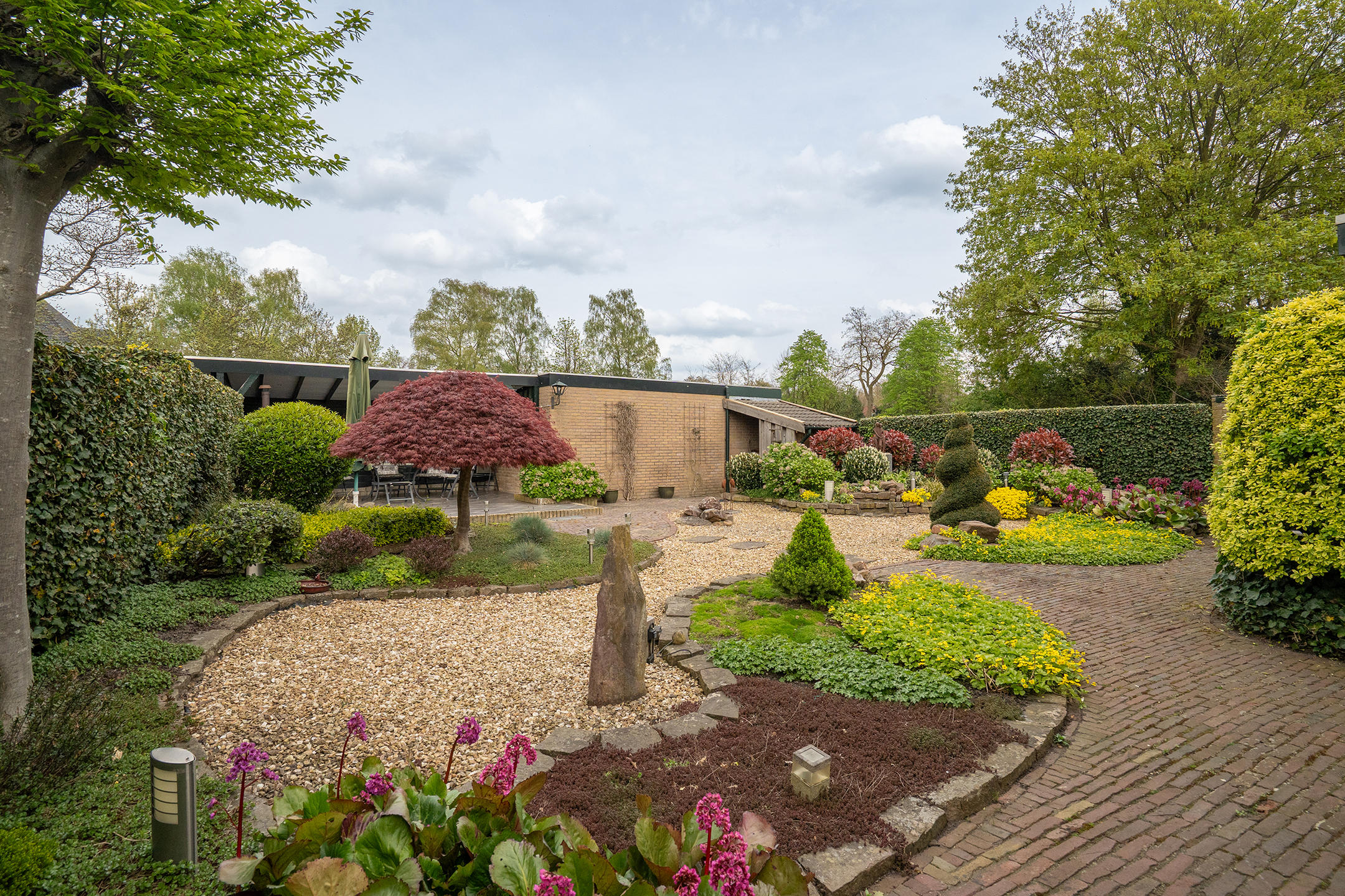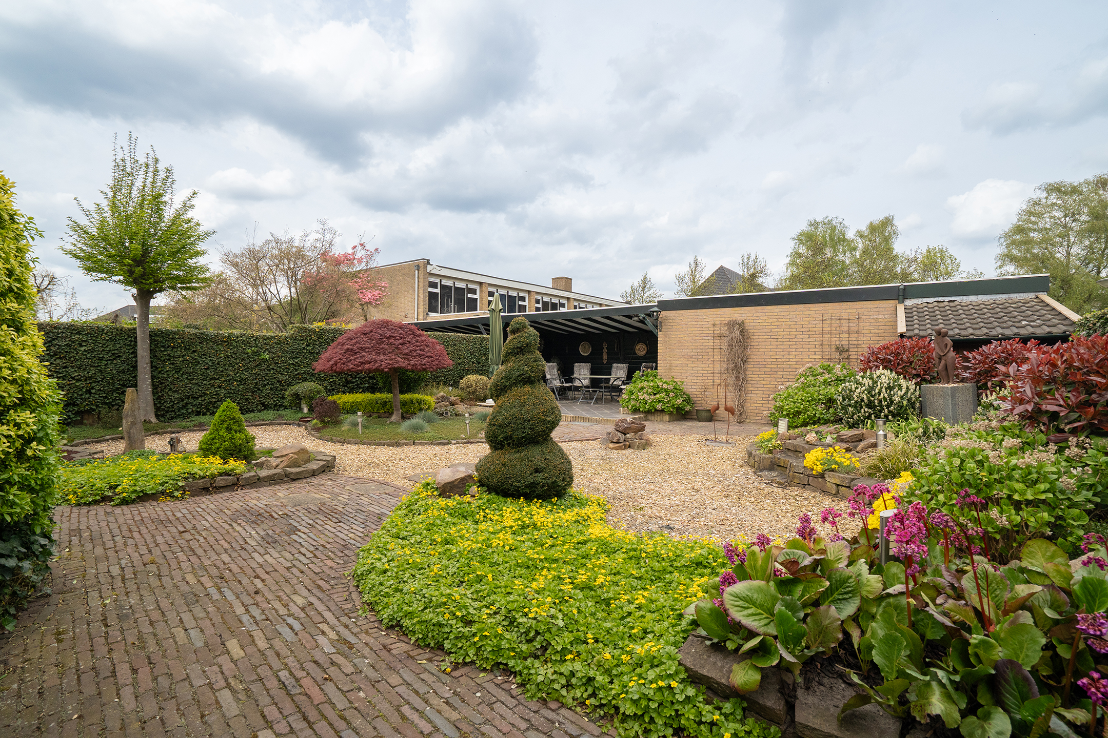 Tuin: De prachtig aangelegde en uitstekend onderhouden achtertuin is een van de grote pluspunten van deze woning. De tuin is verrassend diep en biedt volop privacy, waardoor u hier in alle rust kunt genieten van het buitenleven. De speelse indeling met sierbestrating, borders en volwassen beplanting zorgt voor een groene en sfeervolle uitstraling.