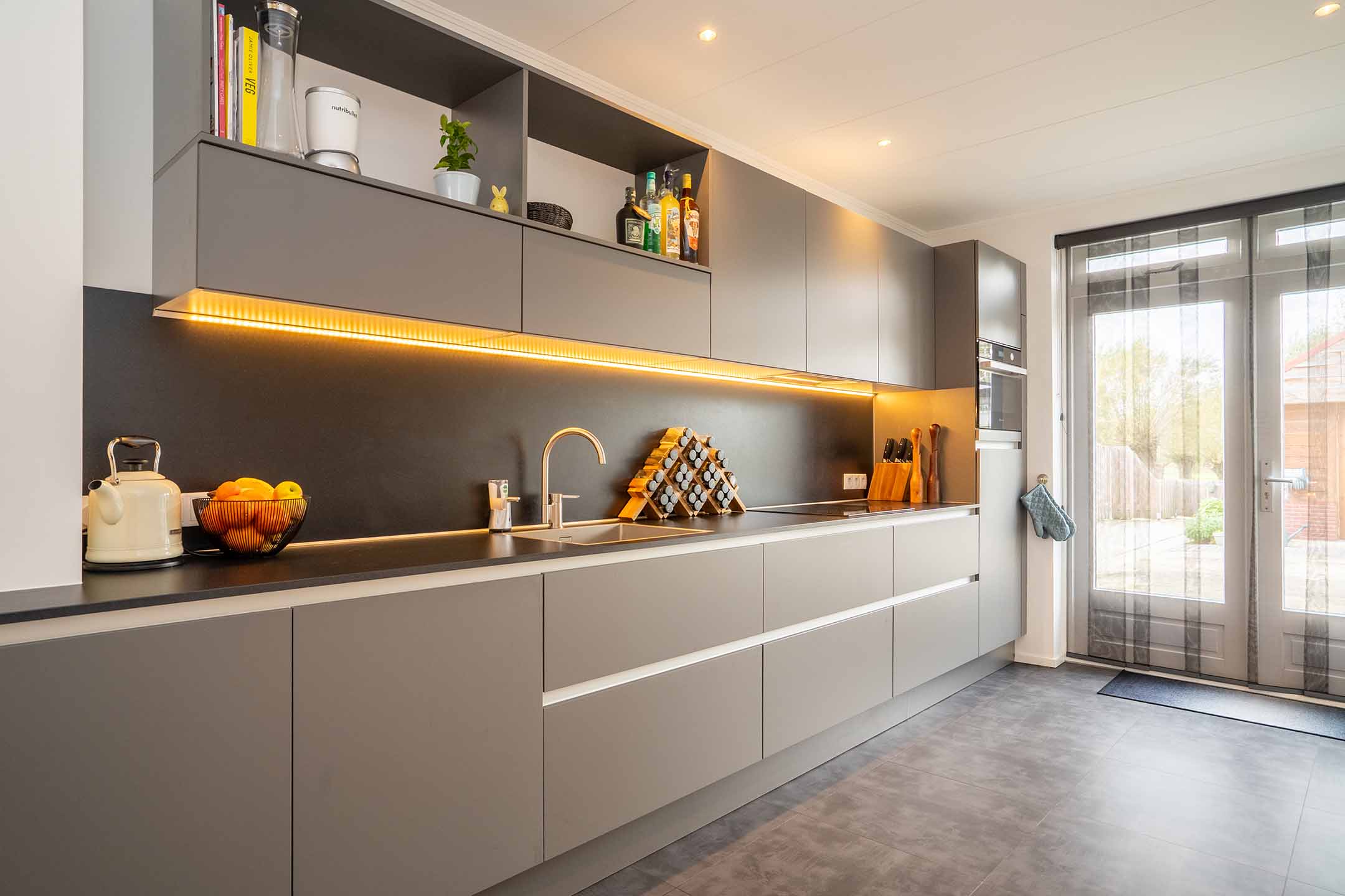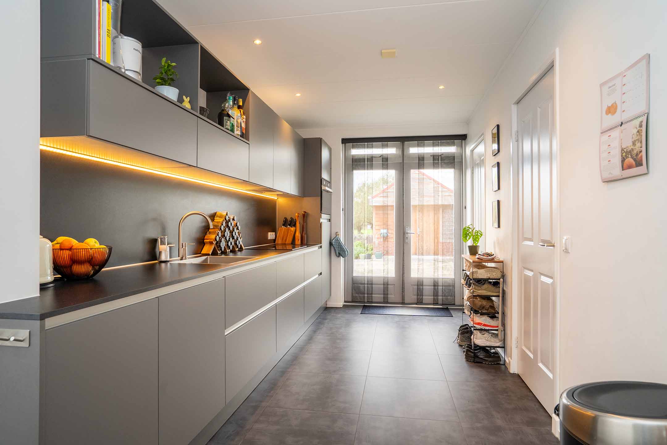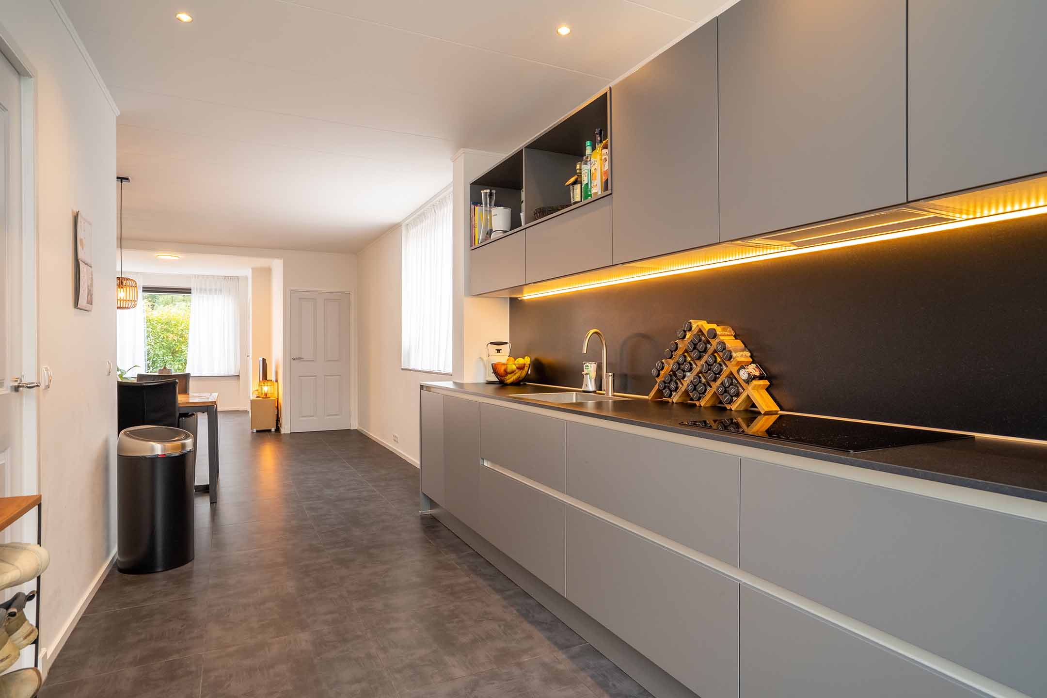 Begane grond: De lichte woonkamer vormt het hart van het huis. Dankzij de open indeling en de grote raampartijen is het er heerlijk ruim en aangenaam licht. De afwerking is modern, met een mooie tegelvloer voorzien van vloerverwarming die zorgt voor optimaal wooncomfort in elk seizoen. De eethoek sluit naadloos aan op de keuken, waardoor je een gezellige leefruimte hebt om samen te koken, te eten en te ontspannen. De moderne keuken is een echte blikvanger – strak vormgegeven, voorzien van inbouwapparatuur en afgewerkt met hoogwaardige materialen. De ingebouwde verlichting onder de kasten geeft niet alleen sfeer, maar ook functioneel licht op het werkblad.