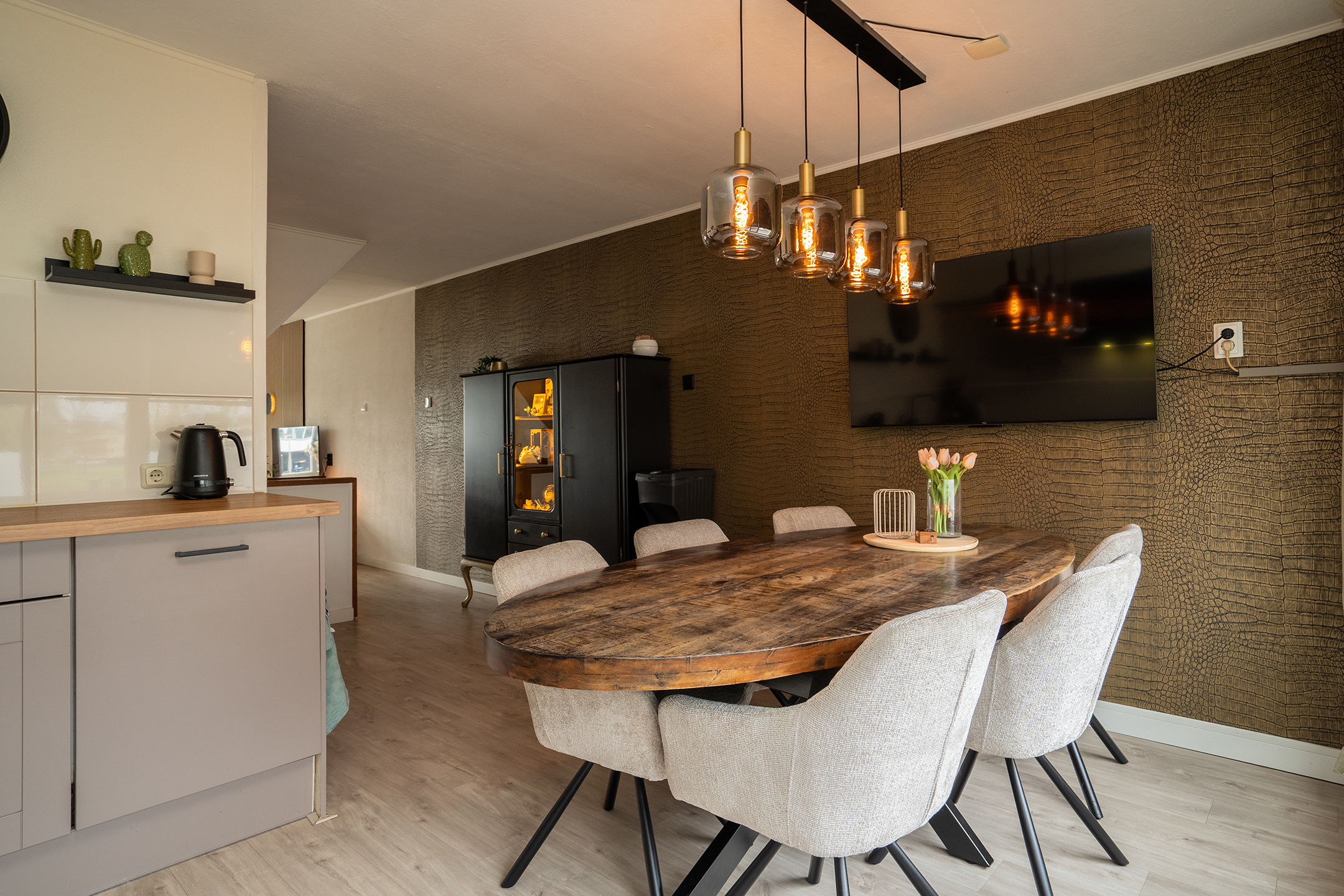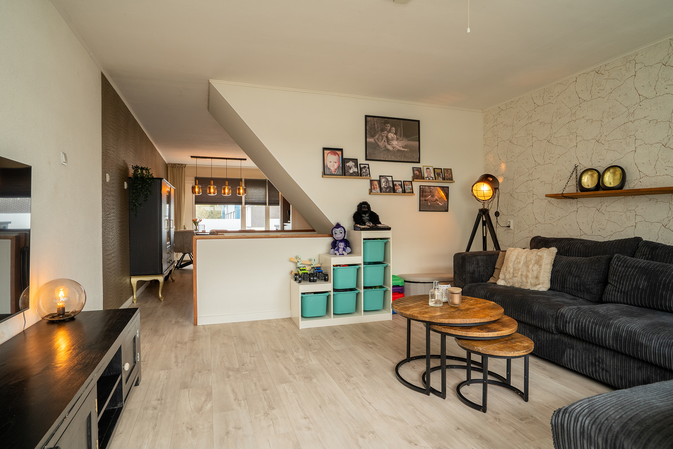 1e Verdieping: Overloop met open verbinding tussen enerzijds de achtergelegen woonkamer en de luxe woonkeuken, welke aan de voorzijde is gesitueerd. Bij de open trapopgang naar de tweede verdieping is tevens de vernieuwde (2023) toiletruimte te vinden.