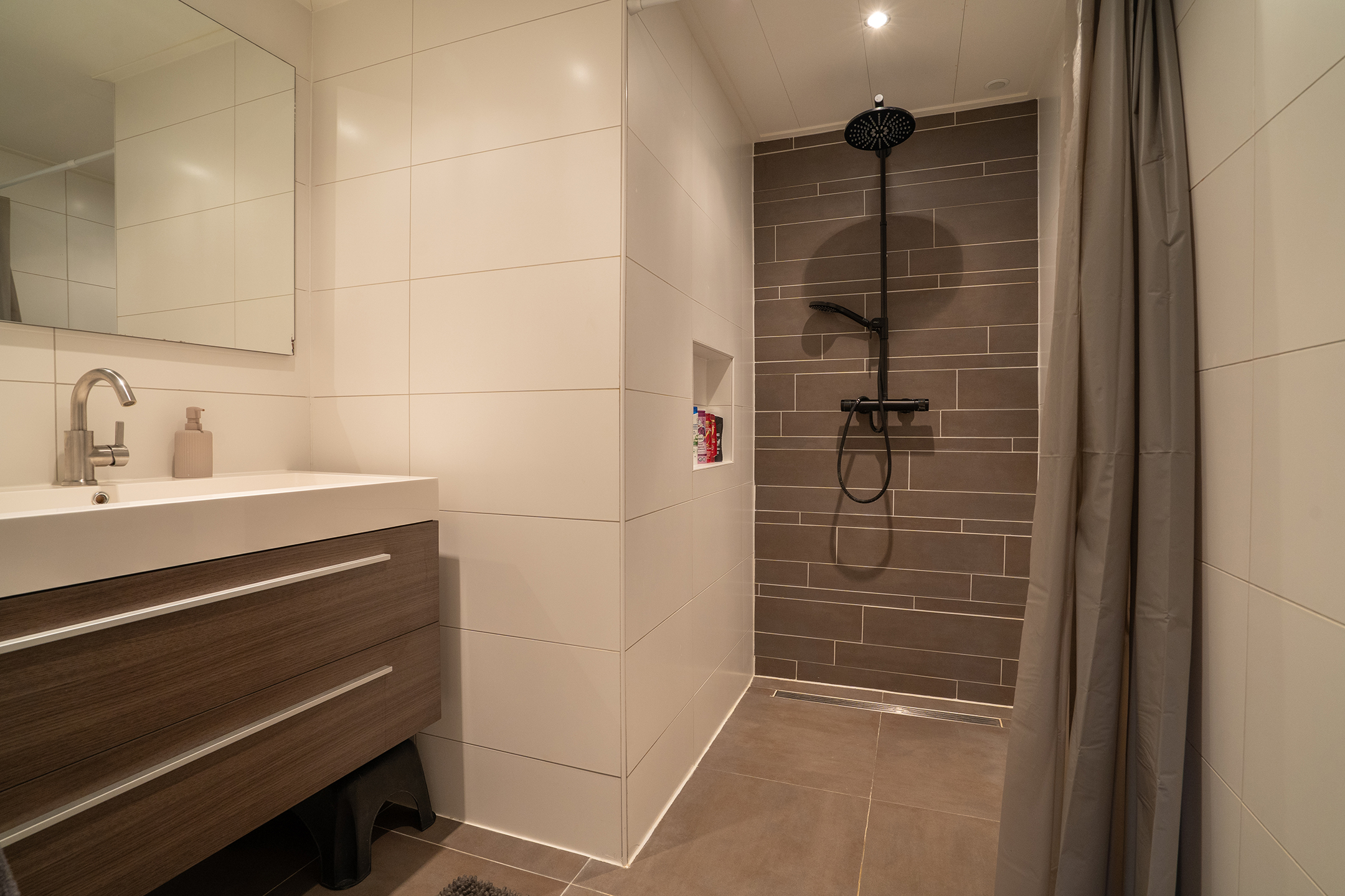 2e Verdieping: Overloop, verruimde luxe badkamer uit 2023 v.v. inloopdouche, groot wastafelmeubel.
