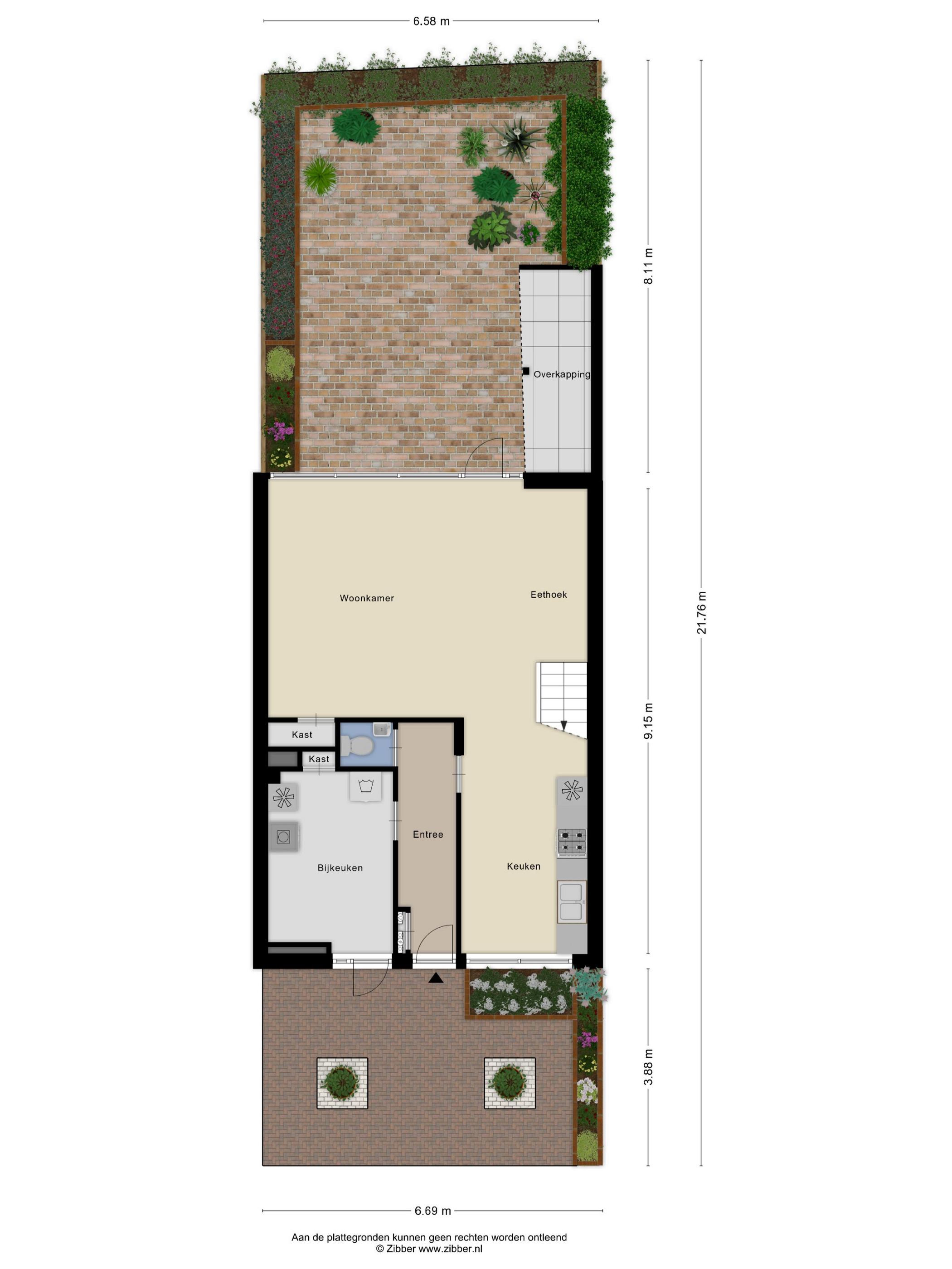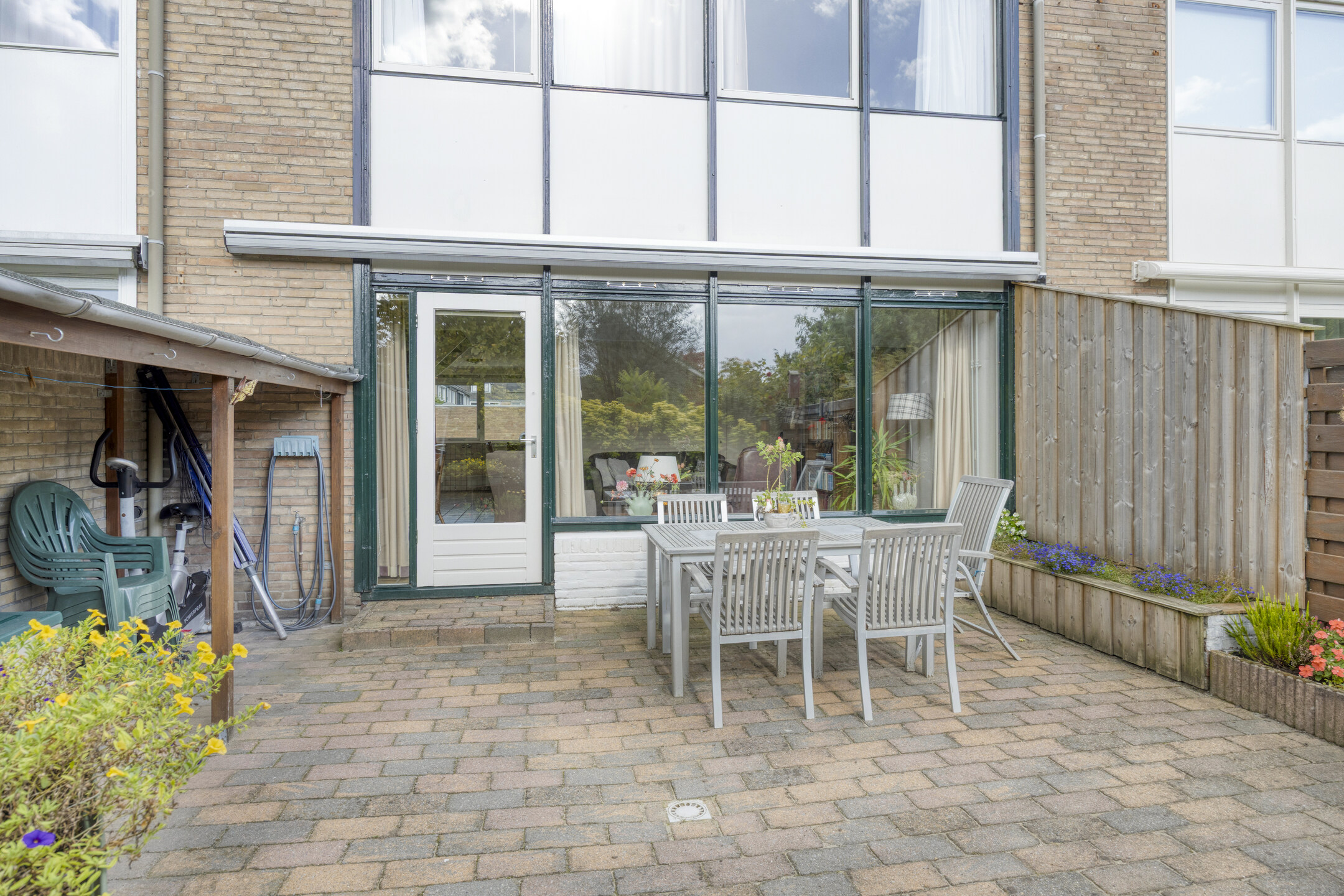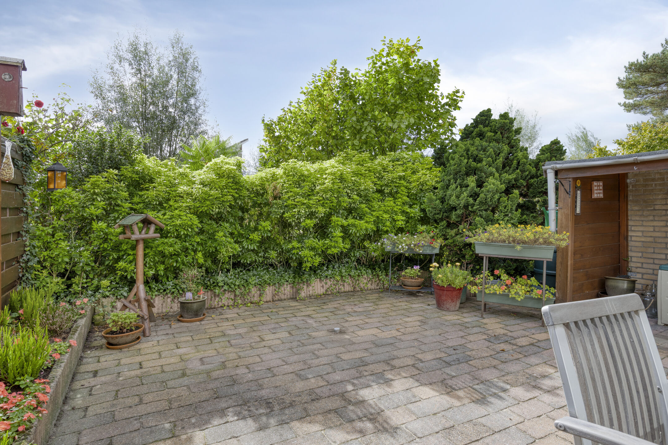 De tuin is volledig betegeld maar toch sfeervol dankzij de groene plantenborders. Het zonnescherm zorgt ervoor dat je ook op warme dagen comfortabel buiten kunt zitten. Daarnaast beschikt de tuin over een kleine overkapping, ideaal voor extra opslag.