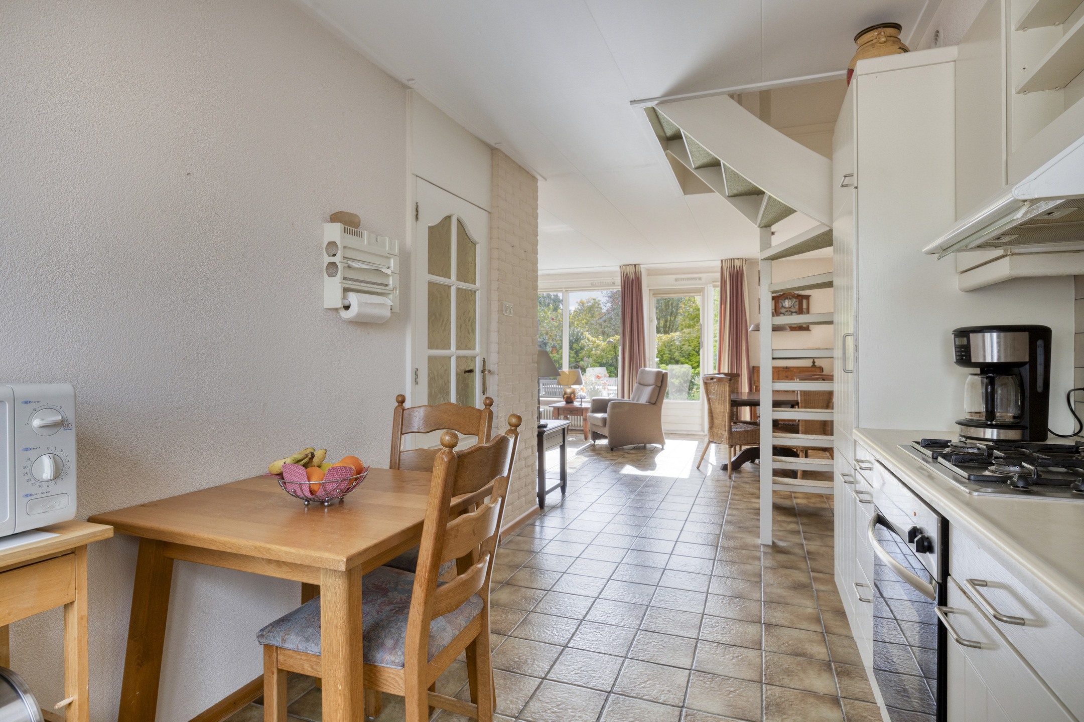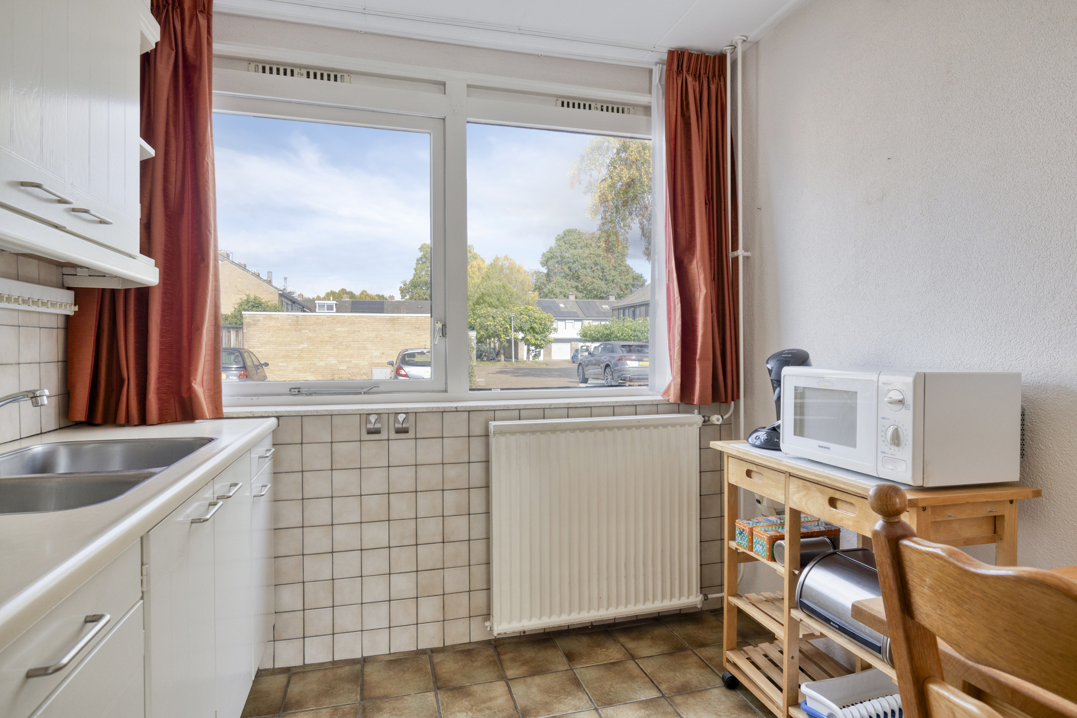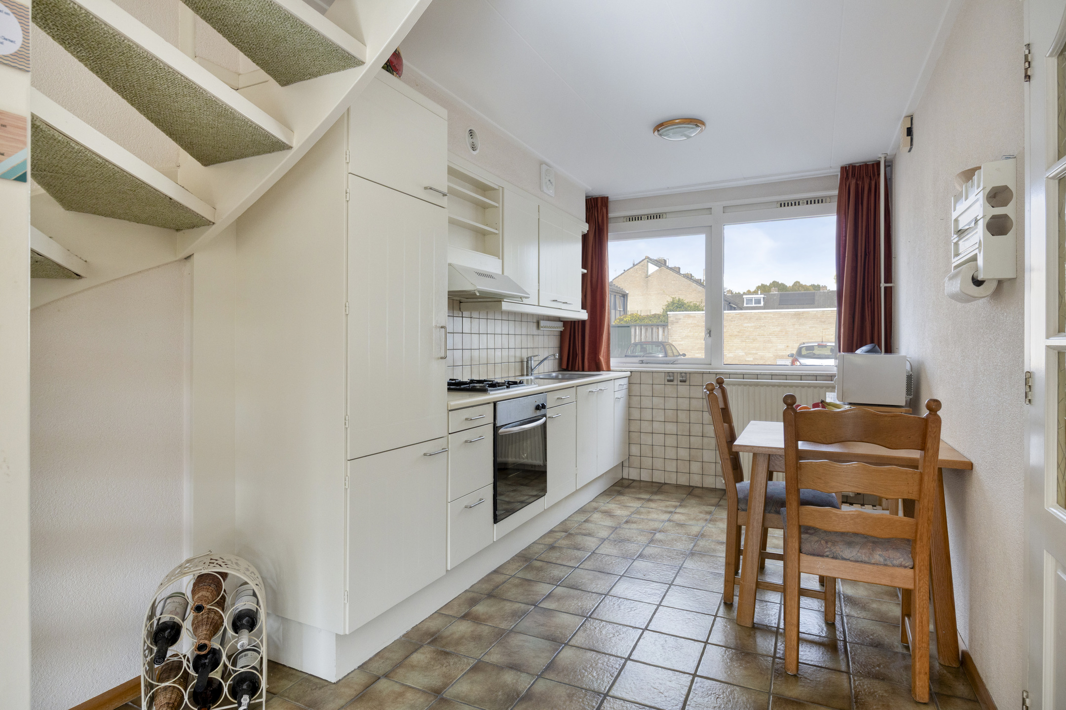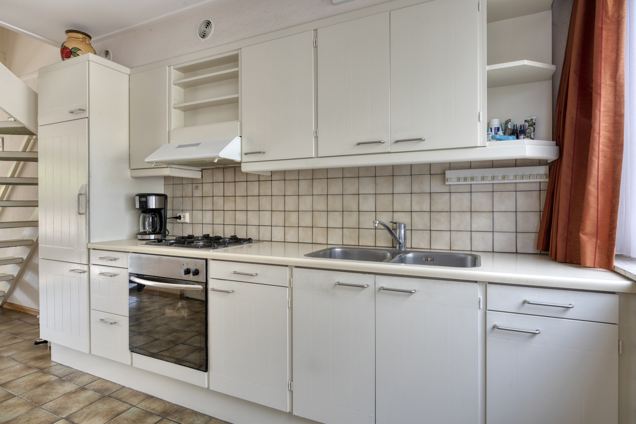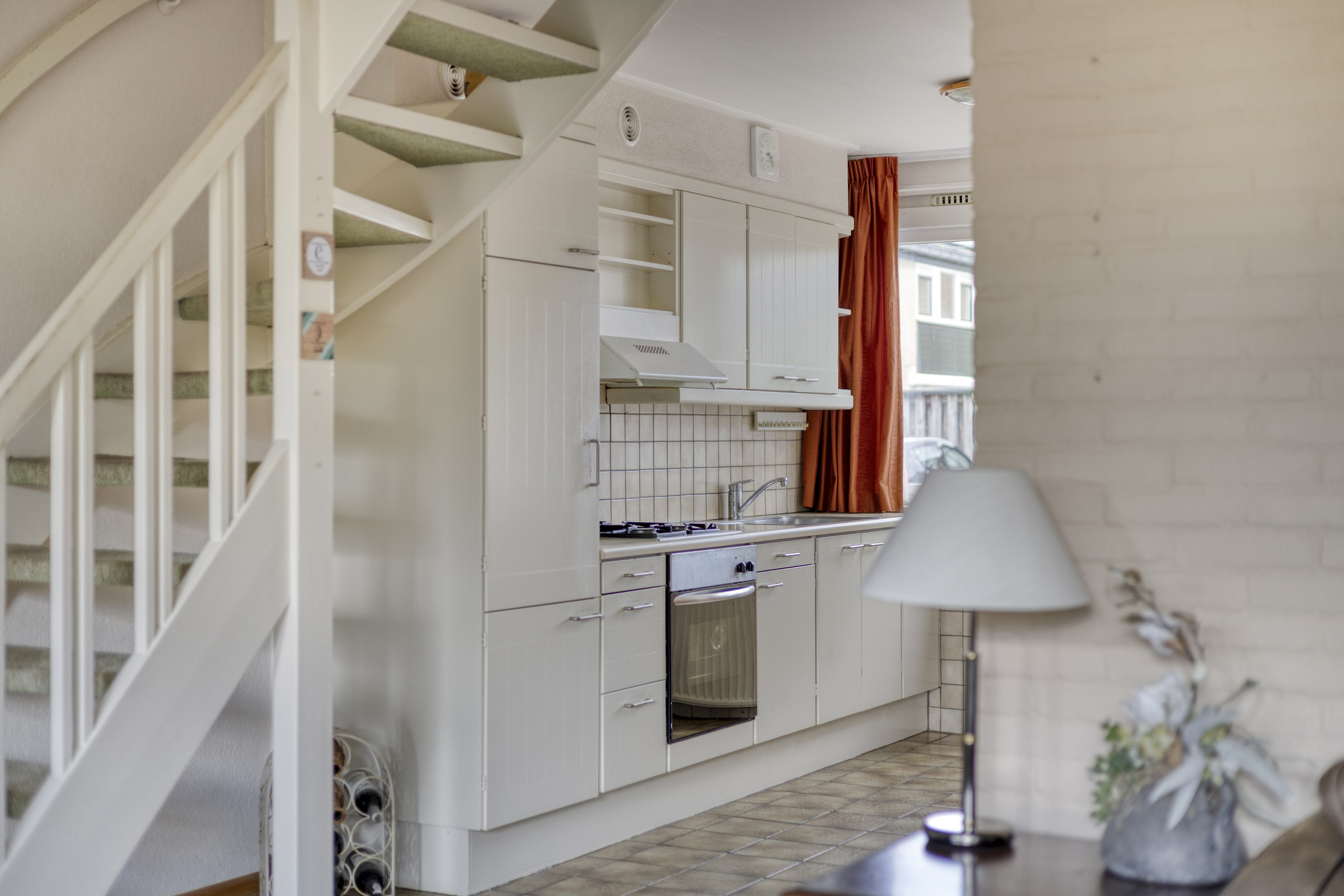 Aan de voorzijde van de woning bevindt zich de keuken, uitgevoerd in lichte kleurstelling en voorzien van een gaskookplaat, afzuigkap, koelkast en oven. Het grote raam aan de voorzijde zorgt voor prettig daglicht en een vrij uitzicht over het plein.