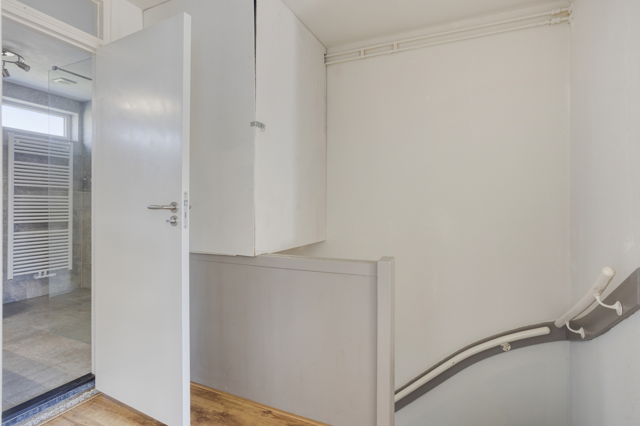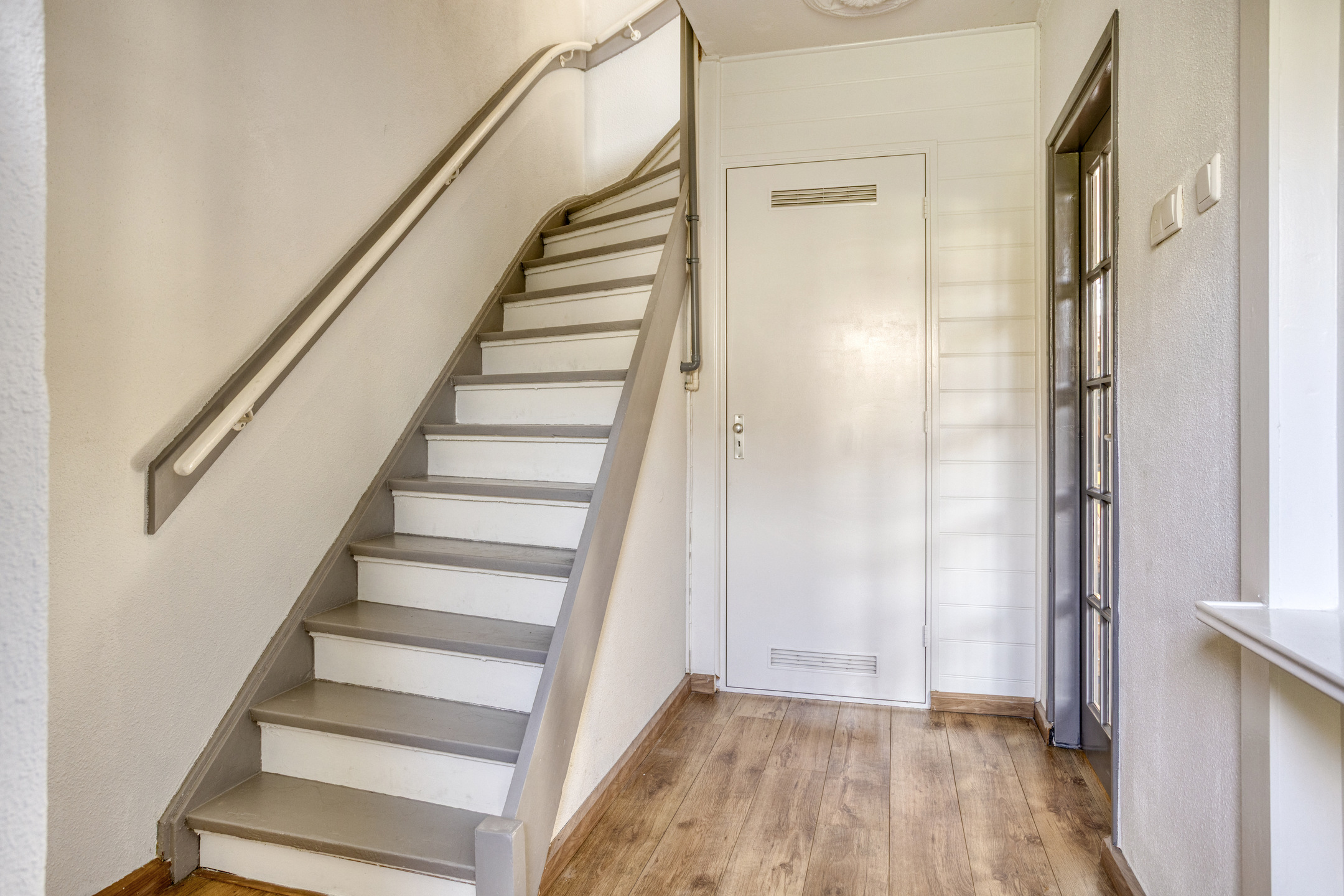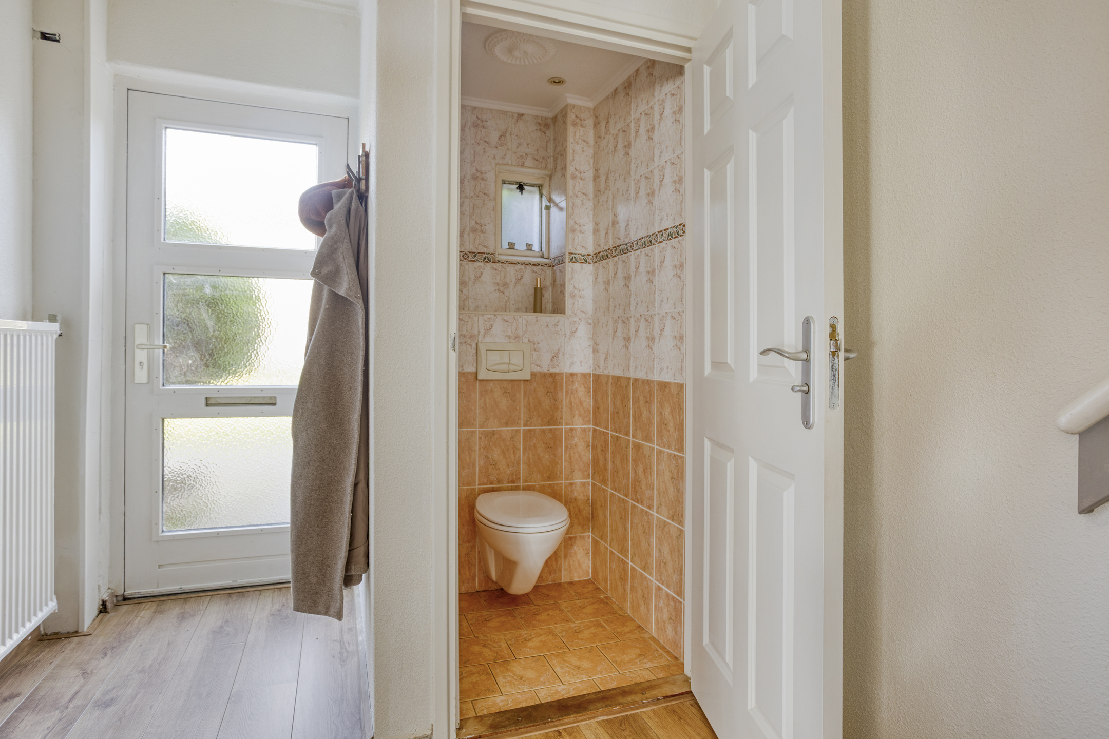 Begane grond: Entree/hal met links om de hoek het toilet en verder links de trapopgang. Voorheen kon je vanuit de gang rechtdoor naar de keuken. Die deur is dicht gemaakt en de ruimte voor die keukendeur is omgebouwd tot wasmachinekast, die nu ook de meters voor de nutsvoorzieningen herbergt. Net voor die handige kast leidt een deur naar de woonkamer. Meteen valt op hoe net deze woning is en hoe mooi het licht vanaf achteren binnenkomt. De eethoek kreeg een mooie grote plek en de zitkamer ligt aan de voorzijde met zicht op het groene plantsoen, waaraan deze woning ligt. De keuken ligt links achterin de woning, is al ouder, maar wel gewoon goed bruikbaar.