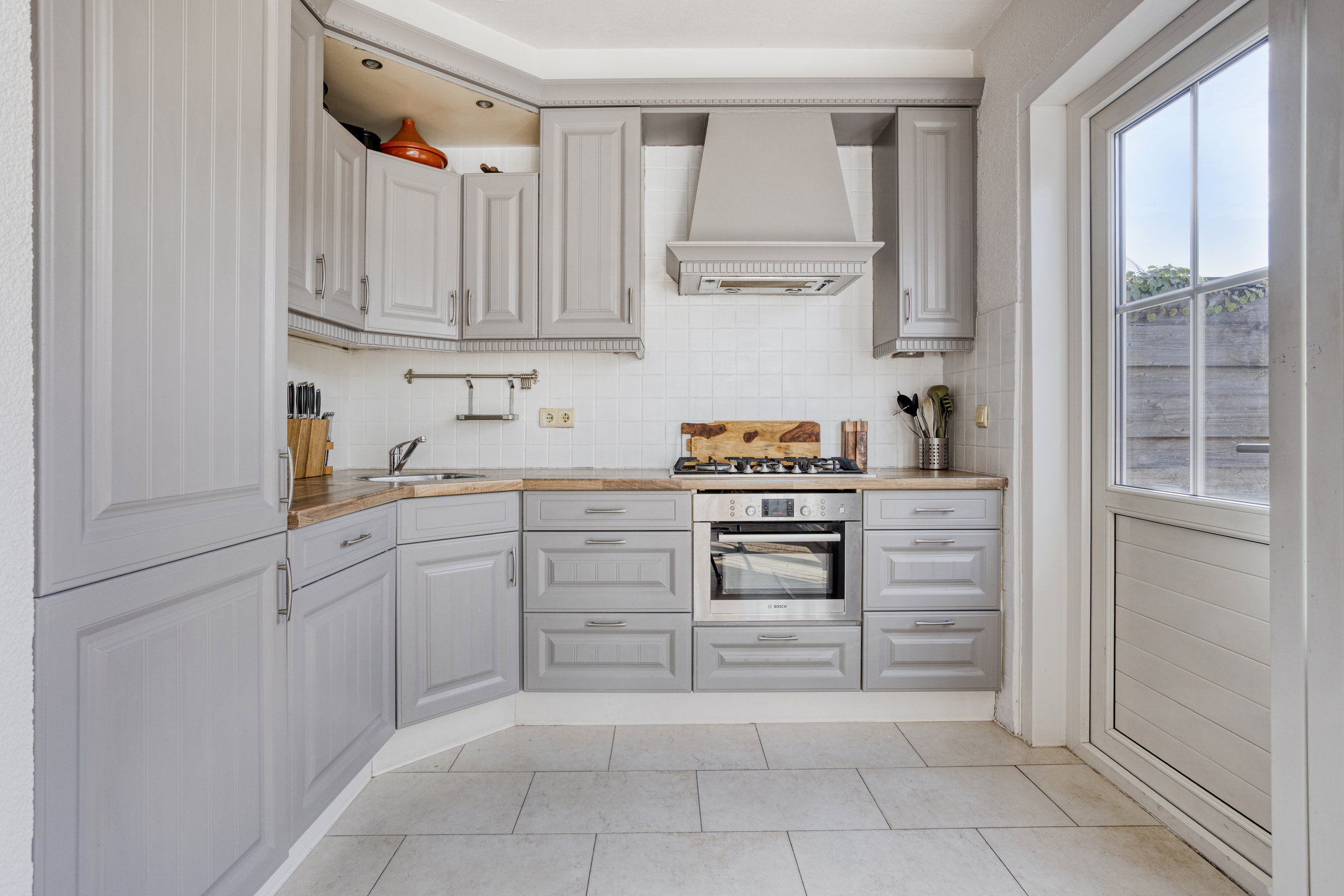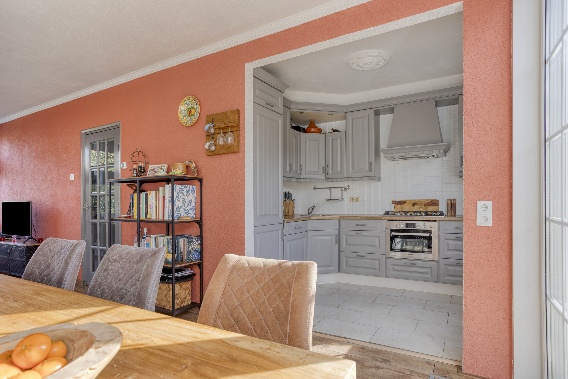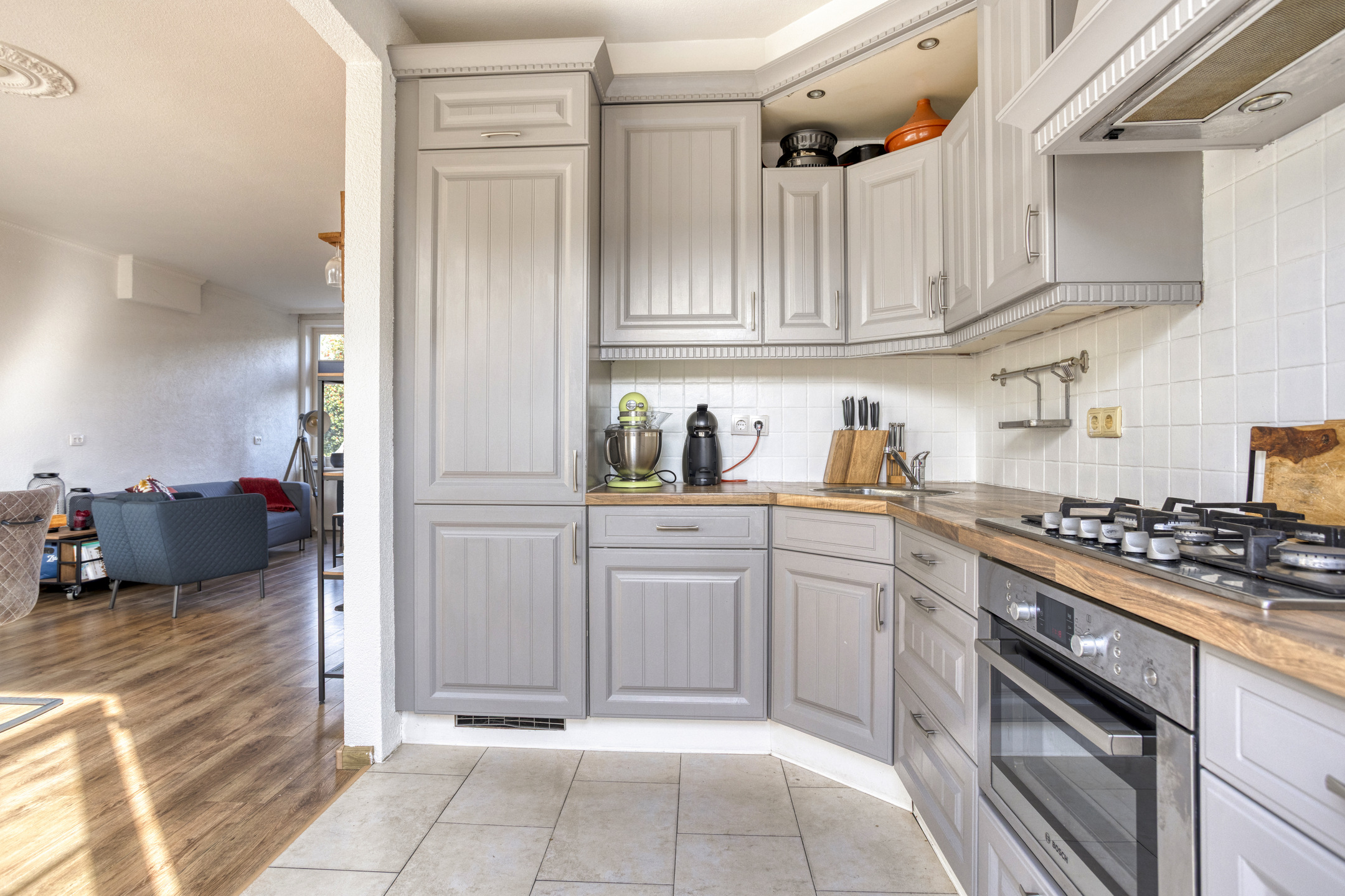 Begane grond: Entree/hal met links om de hoek het toilet en verder links de trapopgang. Voorheen kon je vanuit de gang rechtdoor naar de keuken. Die deur is dicht gemaakt en de ruimte voor die keukendeur is omgebouwd tot wasmachinekast, die nu ook de meters voor de nutsvoorzieningen herbergt. Net voor die handige kast leidt een deur naar de woonkamer. Meteen valt op hoe net deze woning is en hoe mooi het licht vanaf achteren binnenkomt. De eethoek kreeg een mooie grote plek en de zitkamer ligt aan de voorzijde met zicht op het groene plantsoen, waaraan deze woning ligt. De keuken ligt links achterin de woning, is al ouder, maar wel gewoon goed bruikbaar.