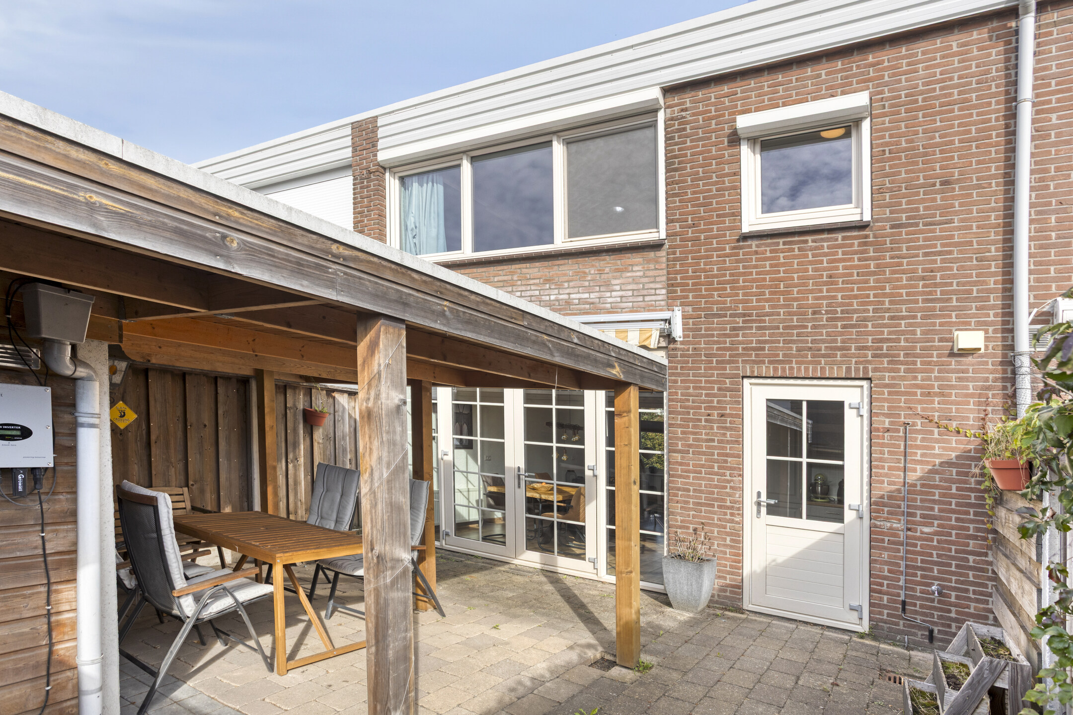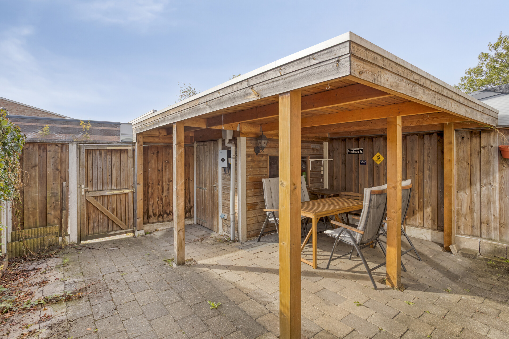 - Grotendeels verharde achtertuin met vrijstaande schuur en grote overkapping.