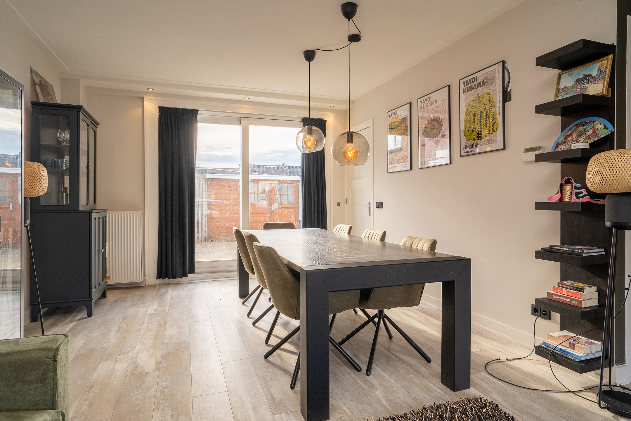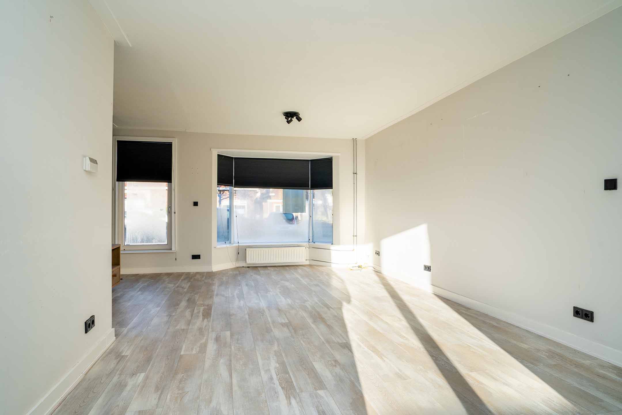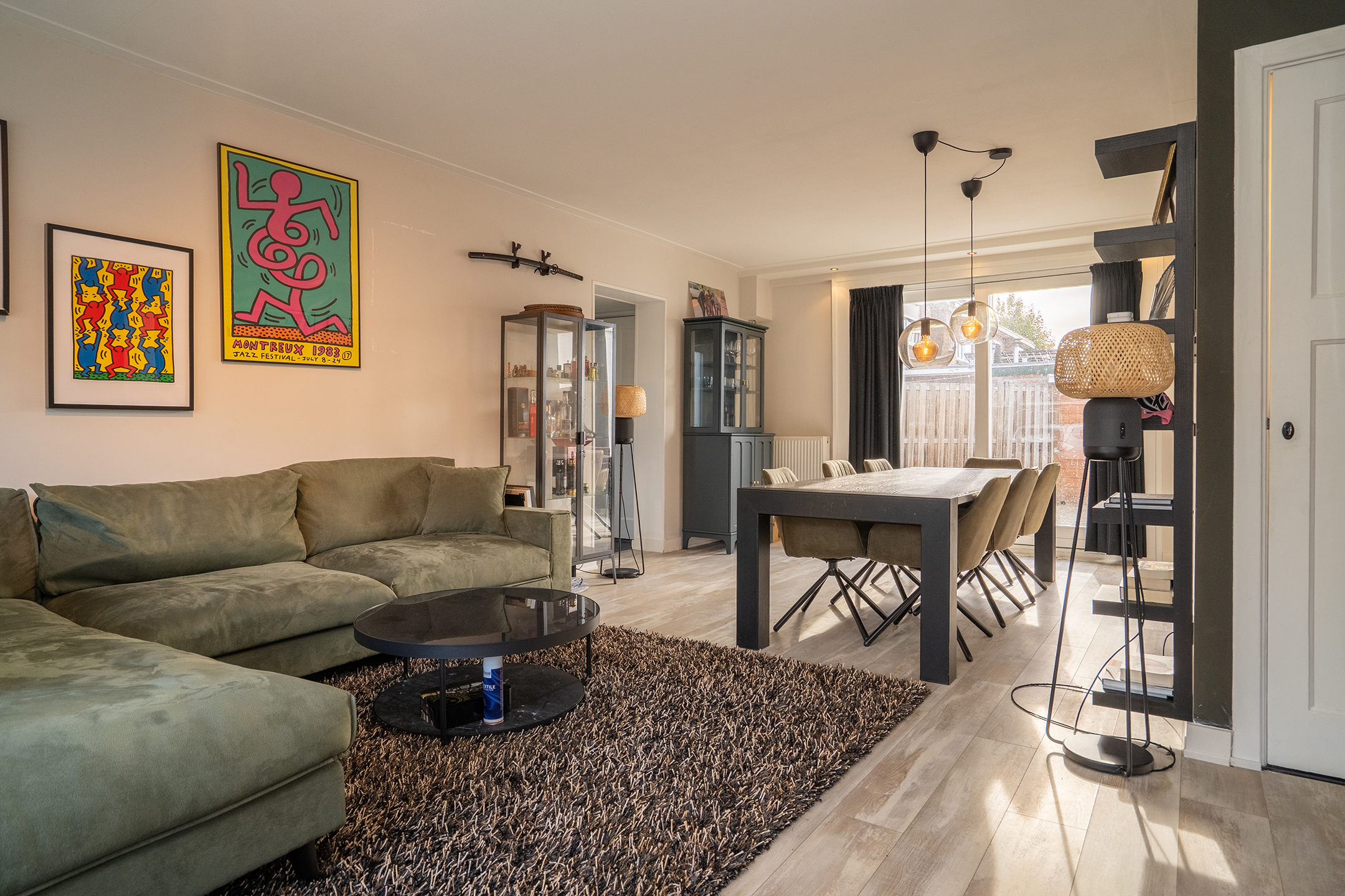 Vanuit de keuken is de woonkamer bereikbaar. Deze is ruim opgezet en geniet van veel lichtinval dankzij de grote ramen aan de voorzijde. De ruimte is sfeervol en biedt voldoende plaats voor zowel een zit- als eethoek.