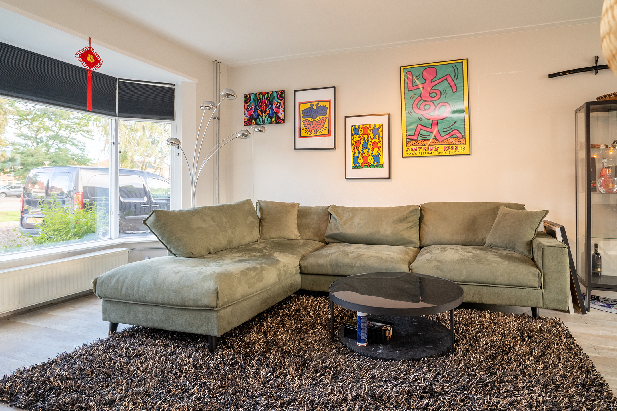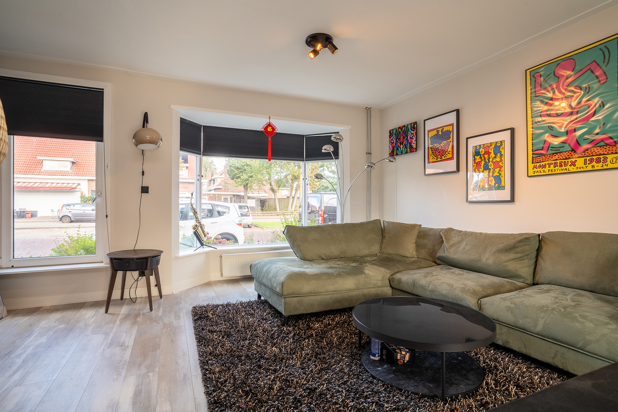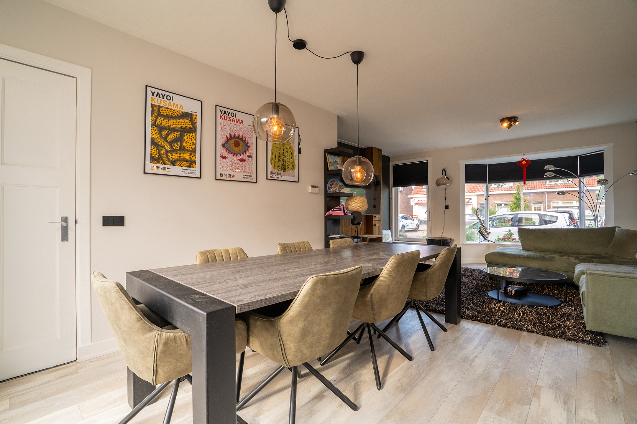 De oorspronkelijke hal aan de voorzijde is bij de woonkamer betrokken, wat zorgt voor extra leefruimte.