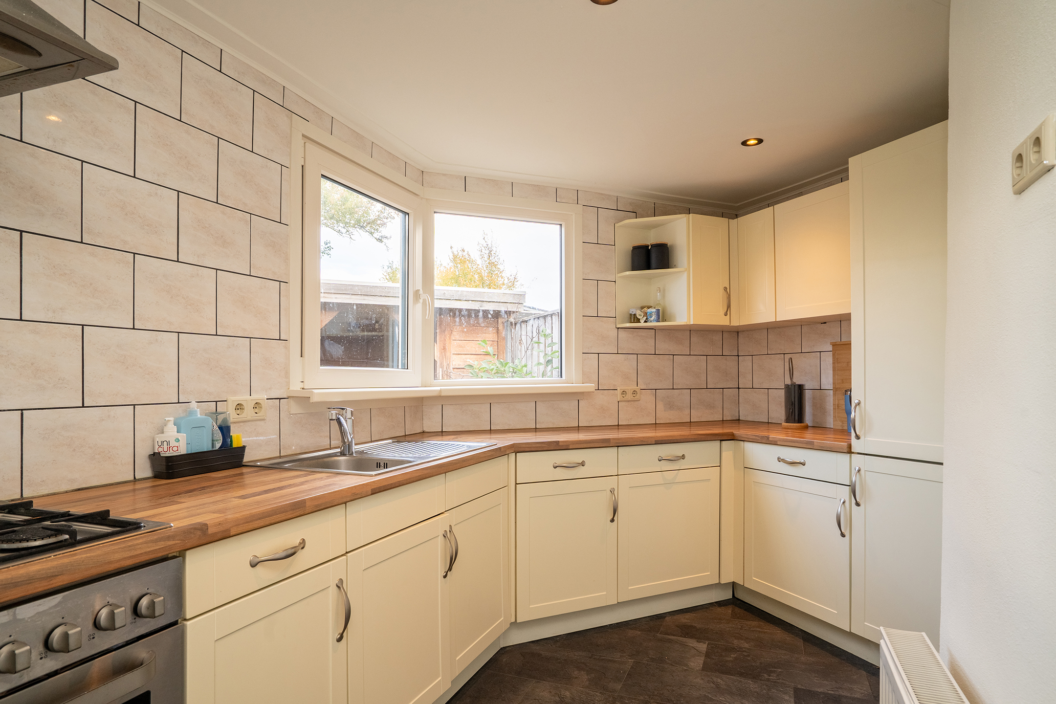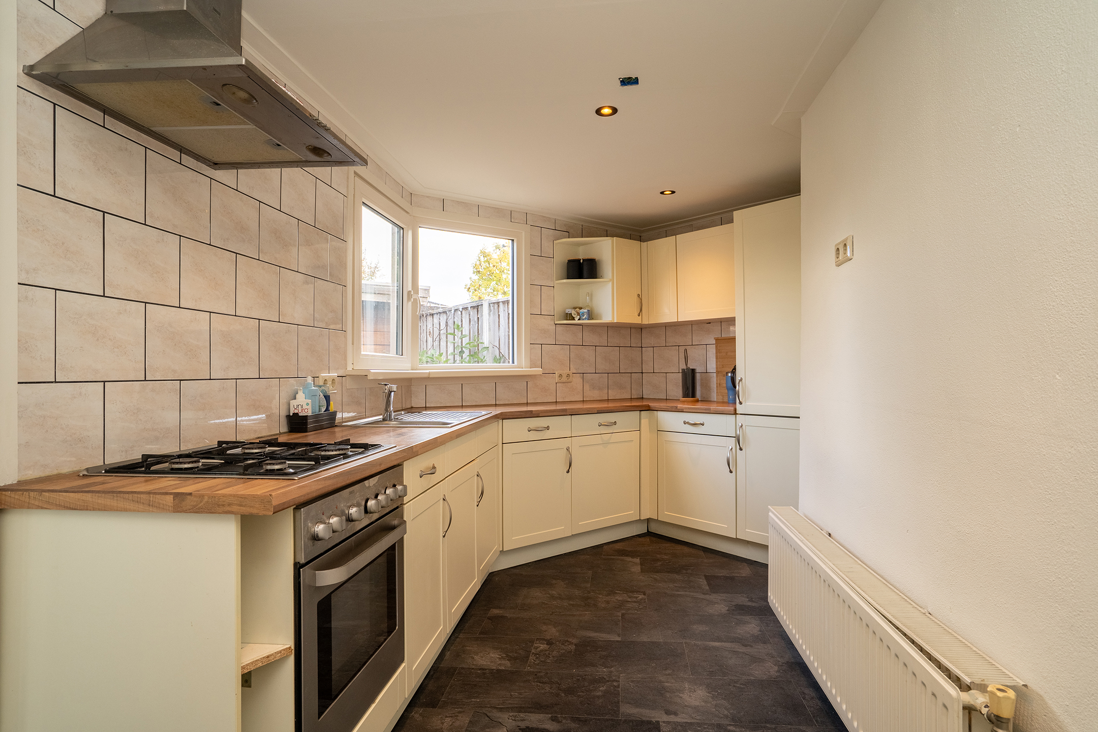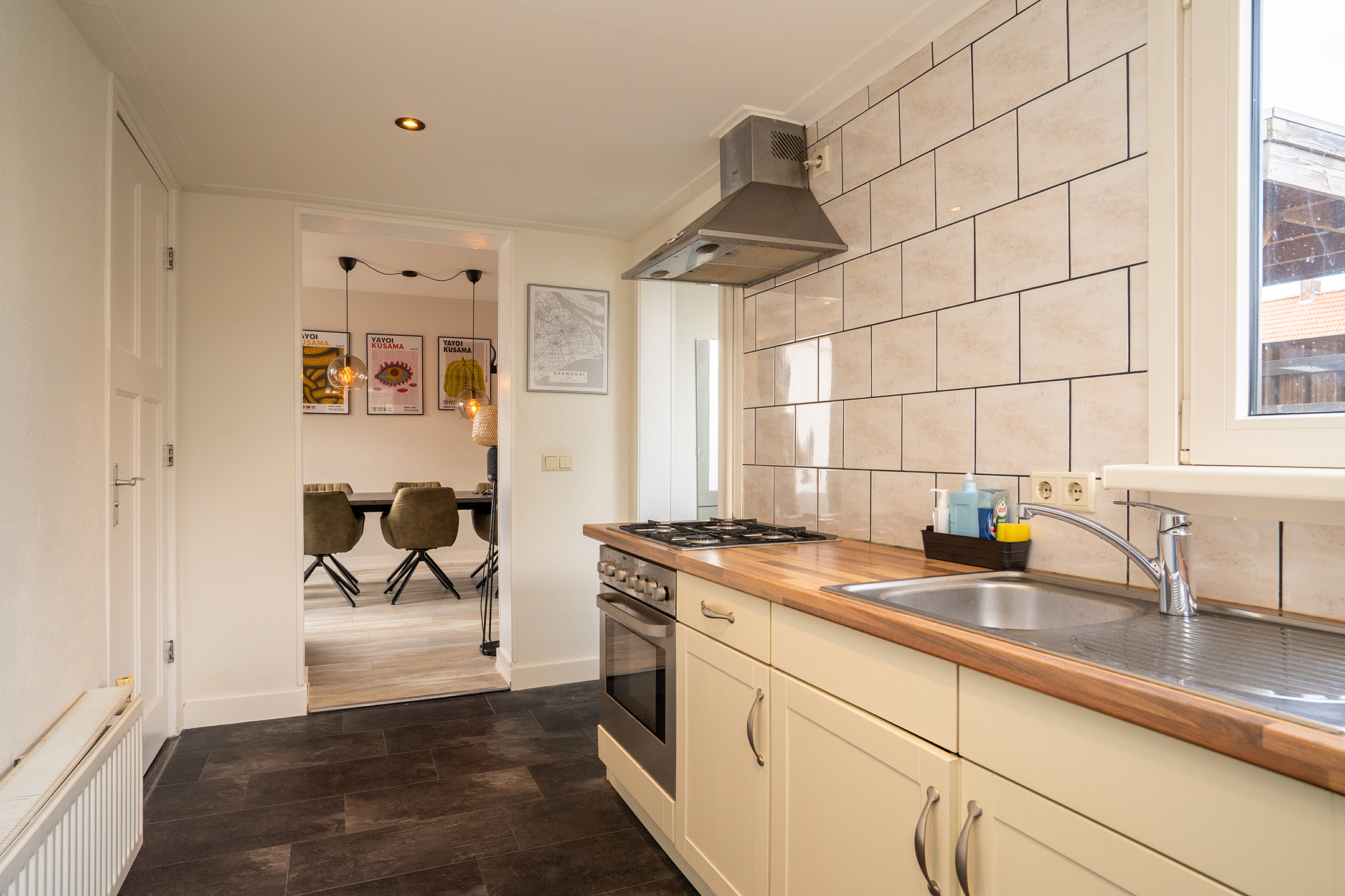 Begane grond: Binnenkomen doen we via de voordeur aan de zijkant van de woning, toegankelijk vanuit de zijtuin. Vanuit de hal stap je direct de keuken in. De keuken is voorzien van diverse inbouwapparatuur, waaronder een gasfornuis, oven en koelkast. Dankzij het grote raam is er veel natuurlijk licht, wat zorgt voor een prettige en open sfeer.
