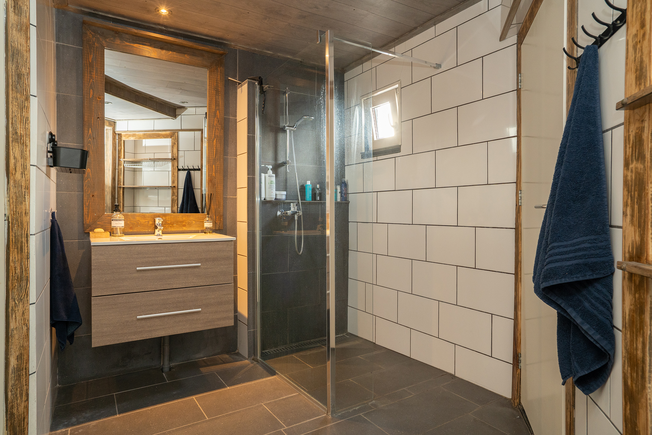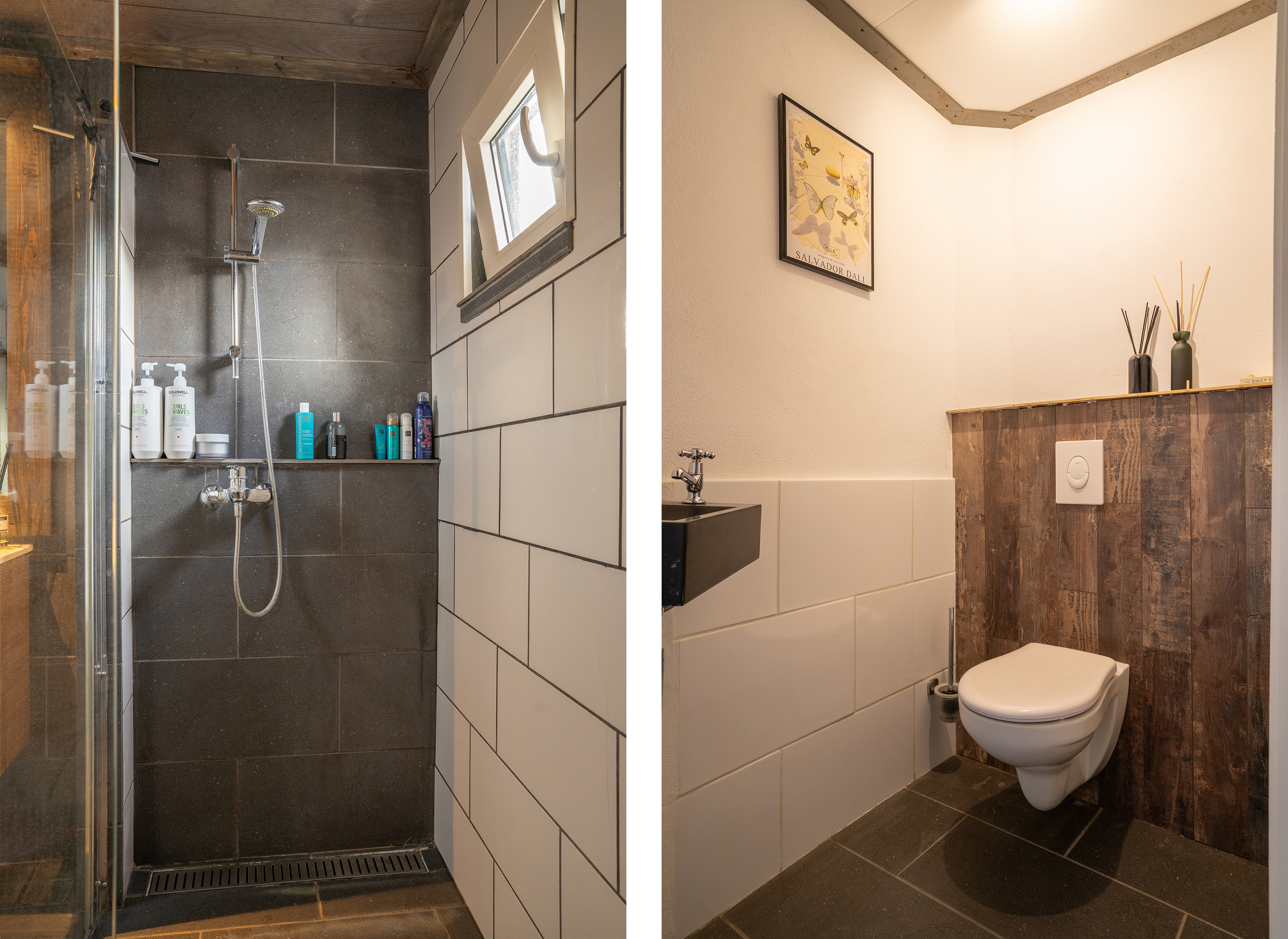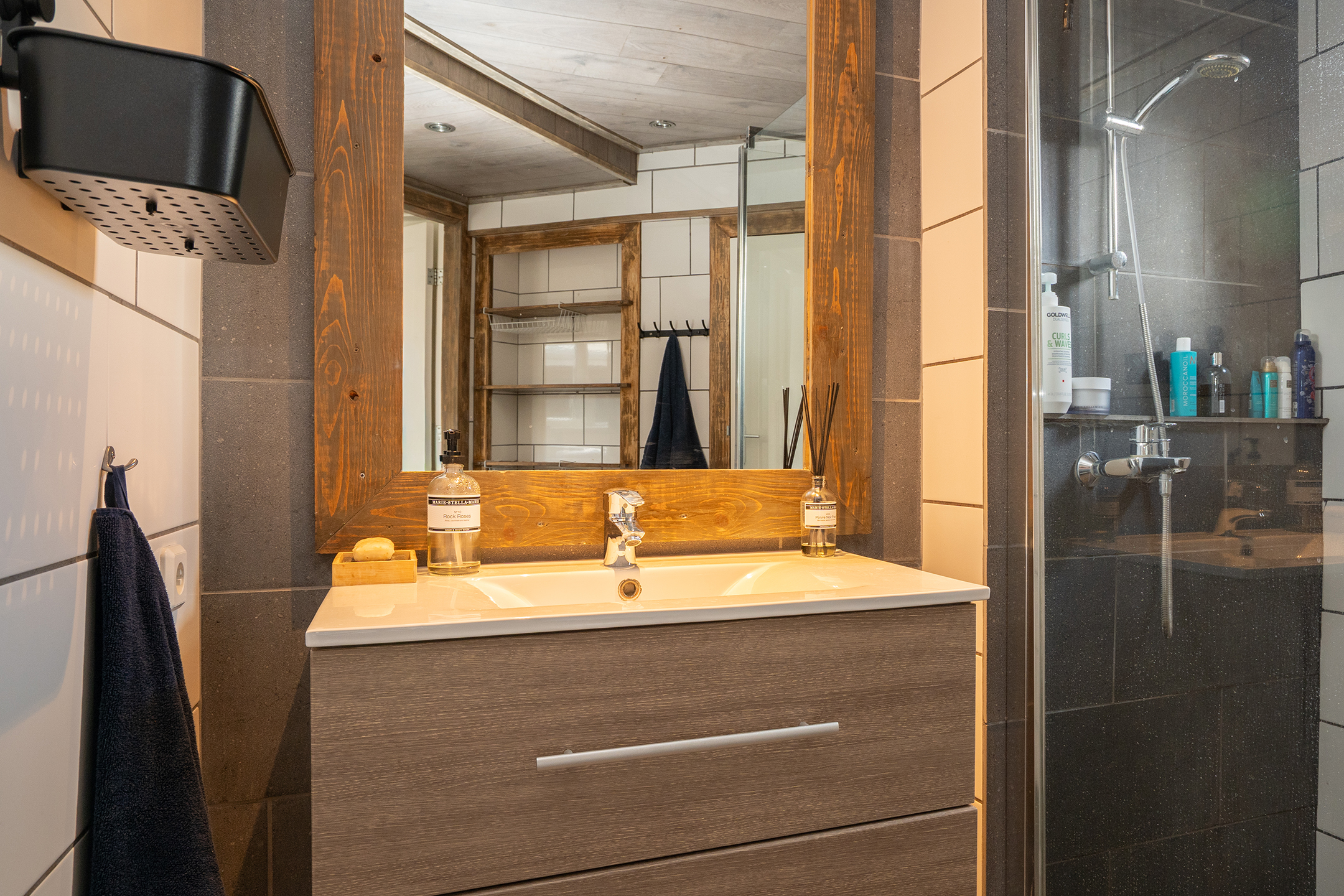 Aangrenzend aan de keuken bevindt zich de badkamer. Deze is volledig betegeld, praktisch ingedeeld en voorzien van een inloopdouche, een wastafelmeubel met opbergruimte en een spiegel. Het toilet bevindt zich eveneens in deze ruimte, maar is dankzij een eigen deur toch apart. Ook de wasmachineaansluiting vind je hier.