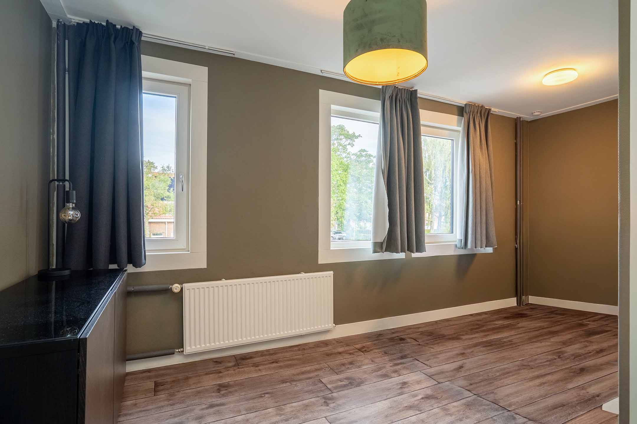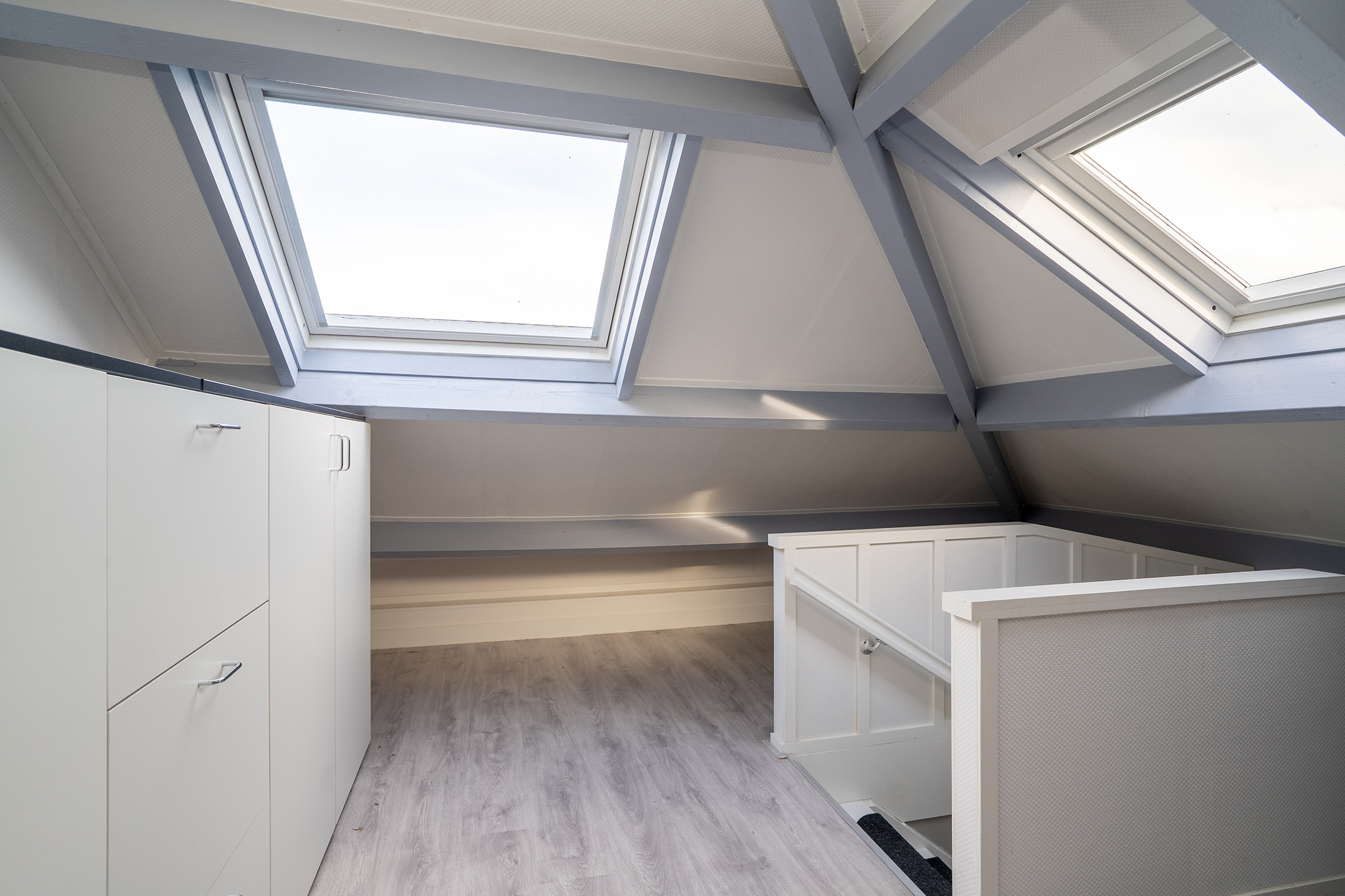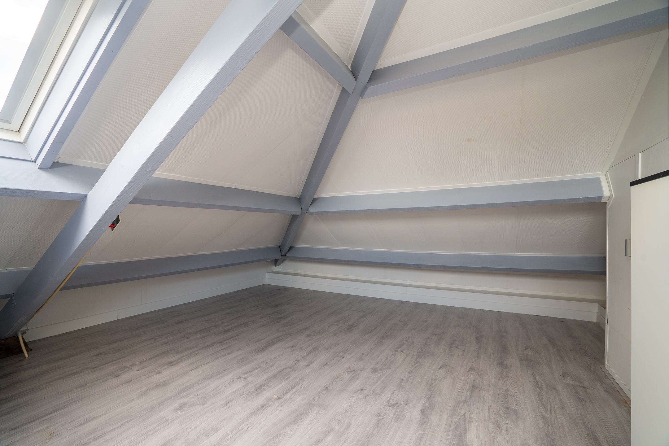 2e verdieping: De zolderverdieping is bereikbaar via een vaste trap. De ruimte is netjes afgewerkt met een moderne vloer en dankzij de twee grote dakramen komt er veel daglicht binnen. Hierdoor is de verdieping uitstekend geschikt als extra slaapkamer, werk- of hobbyruimte.