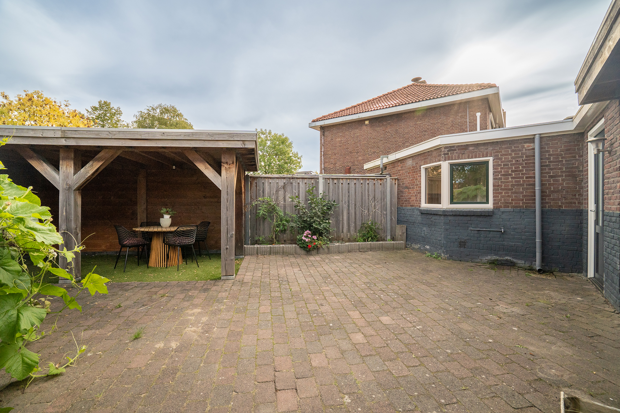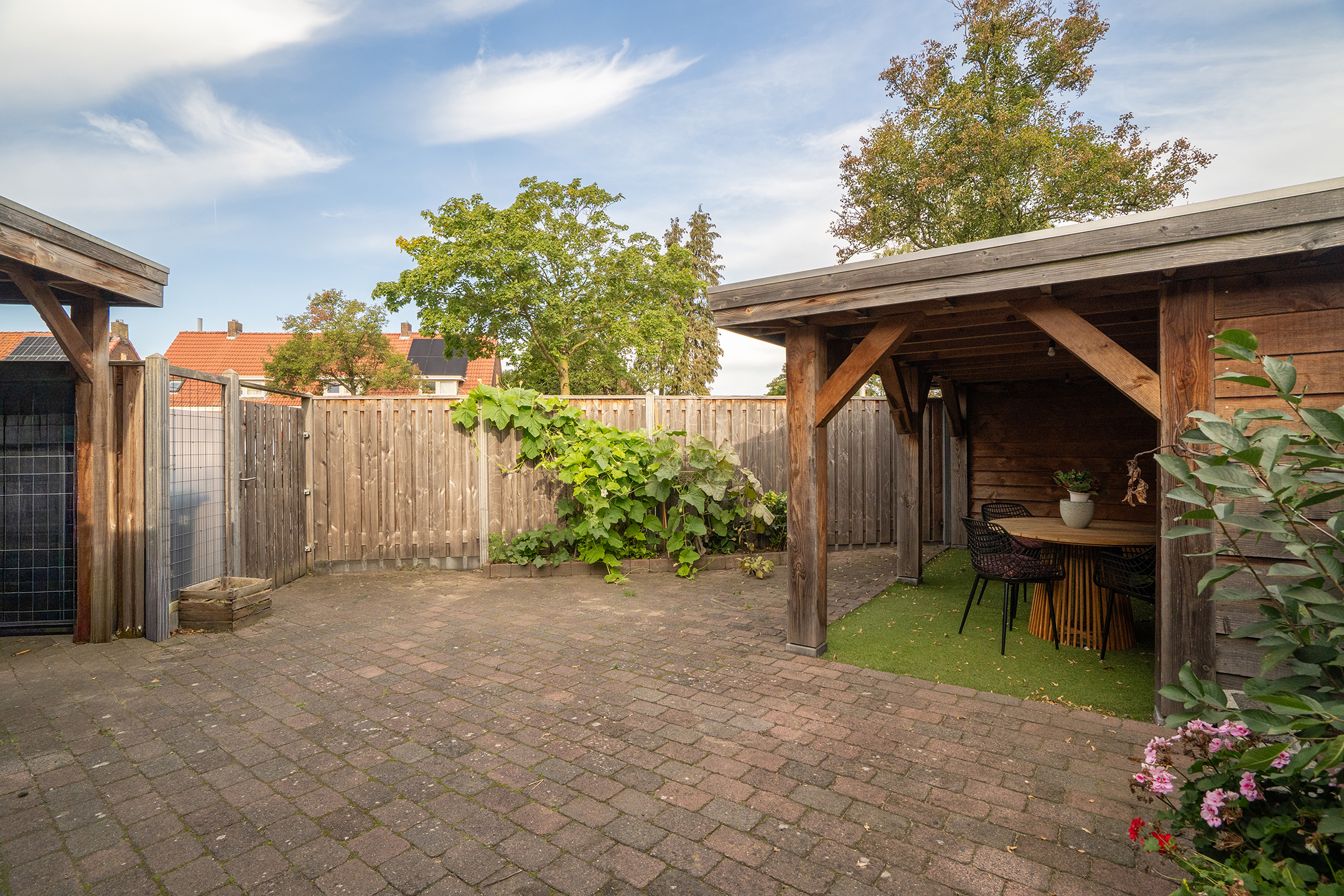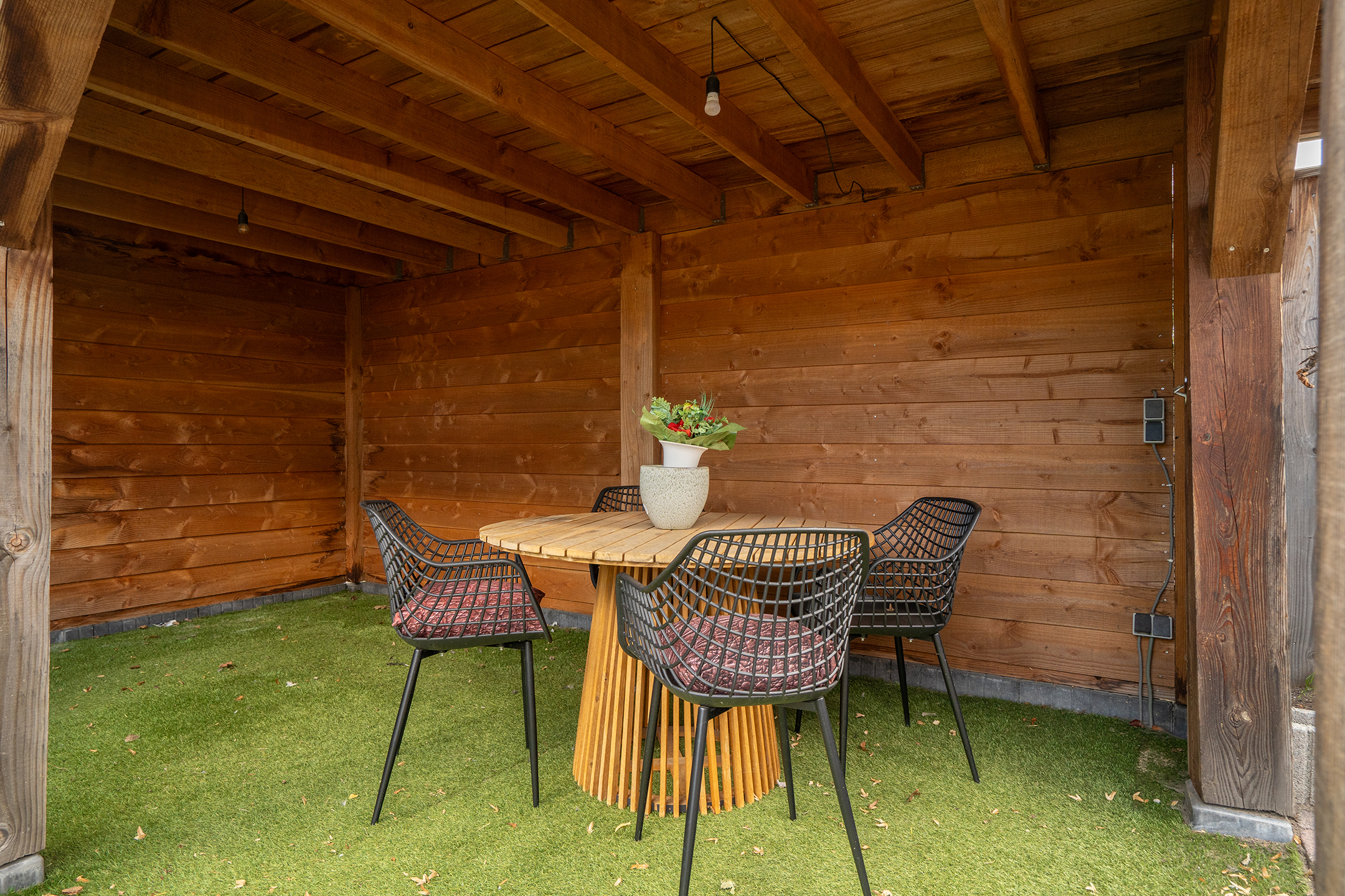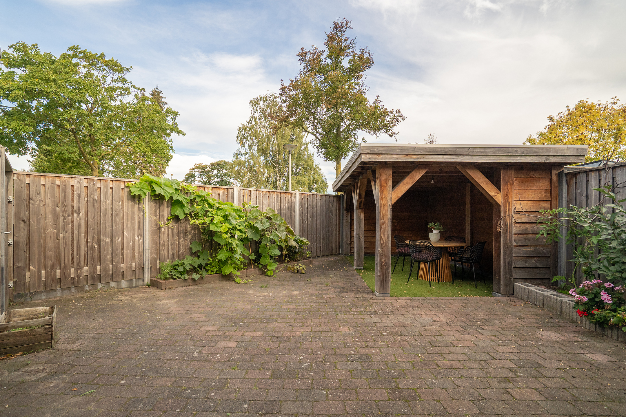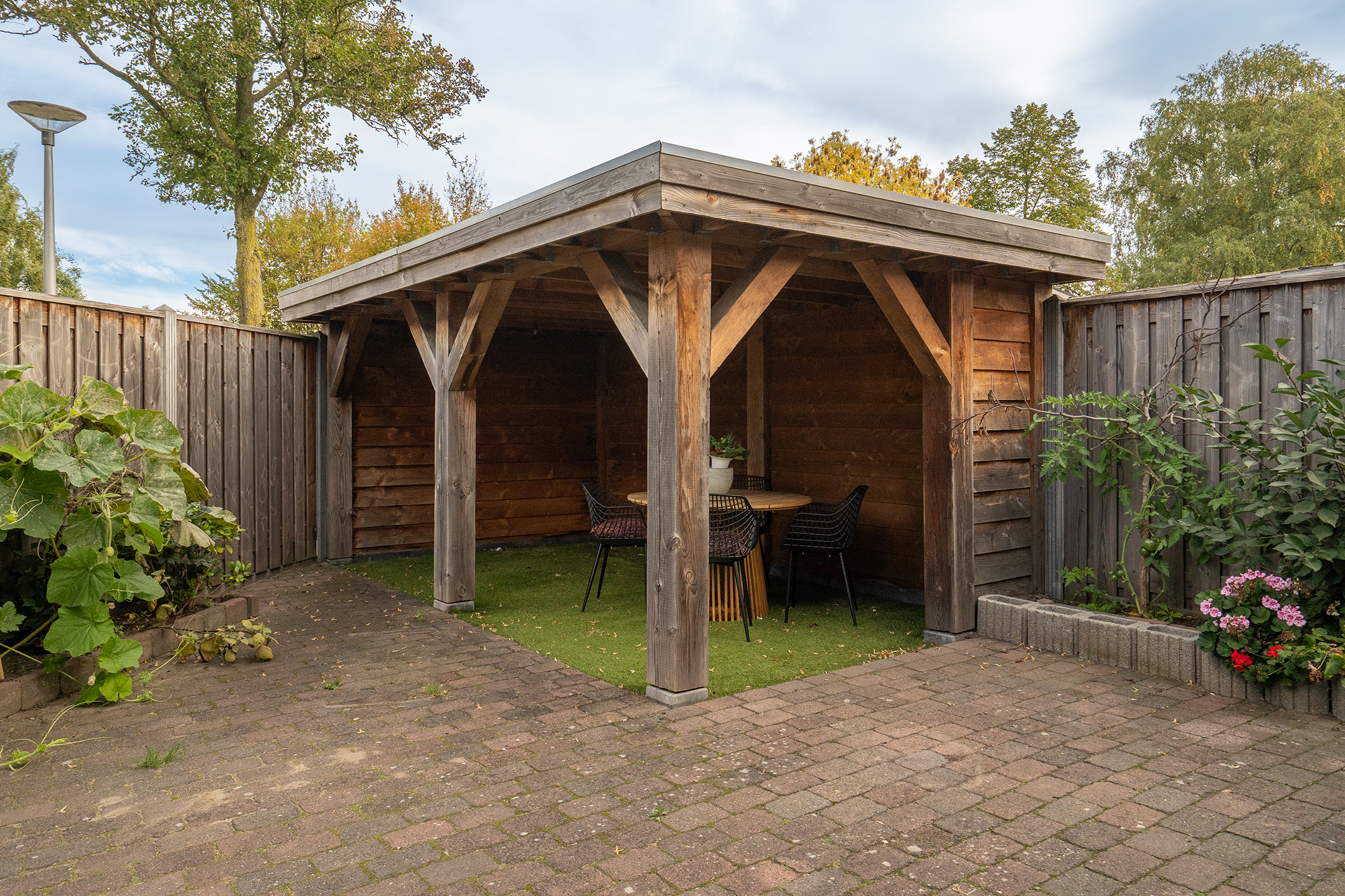 - Onderhoudsvriendelijke tuin met een overkapping.