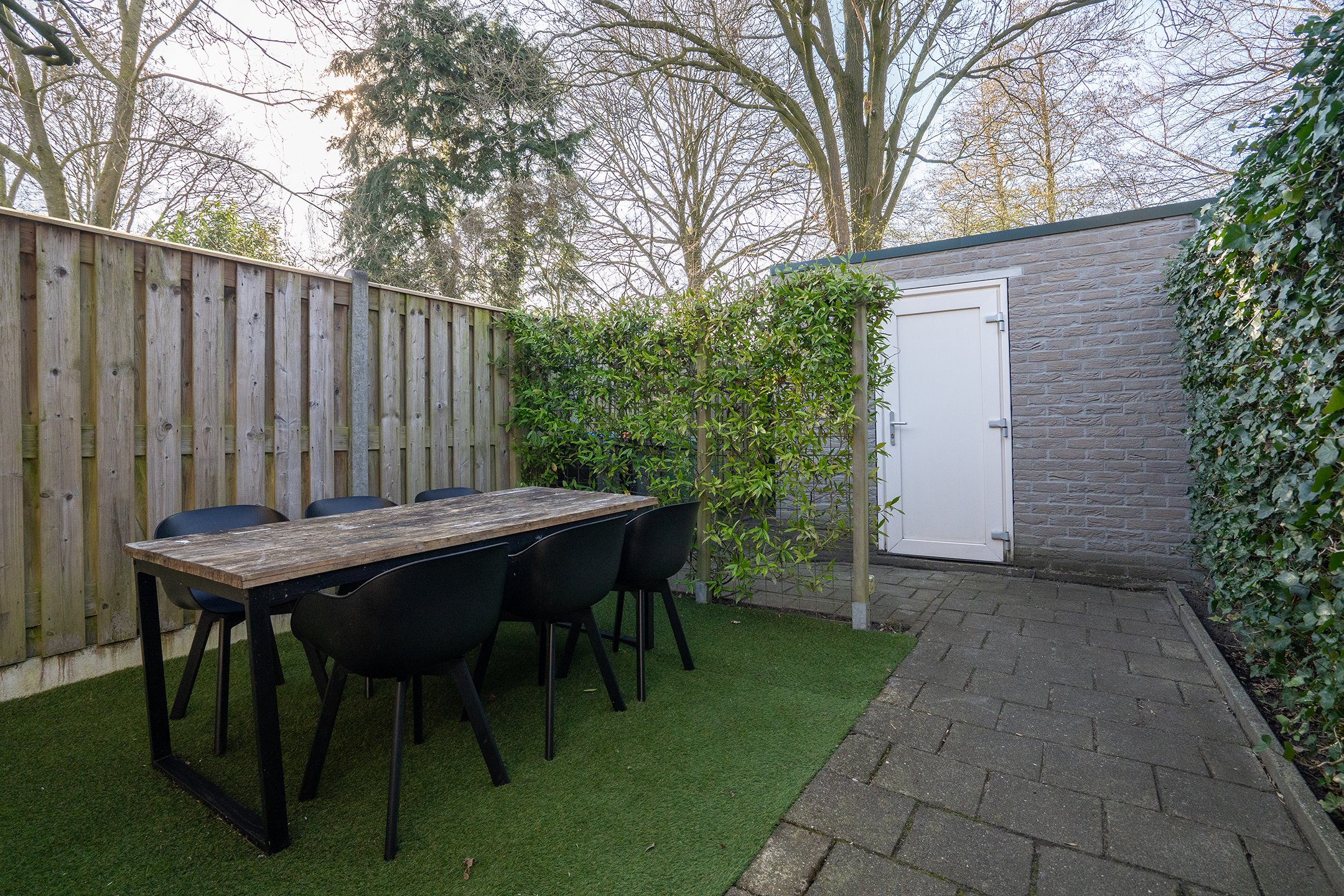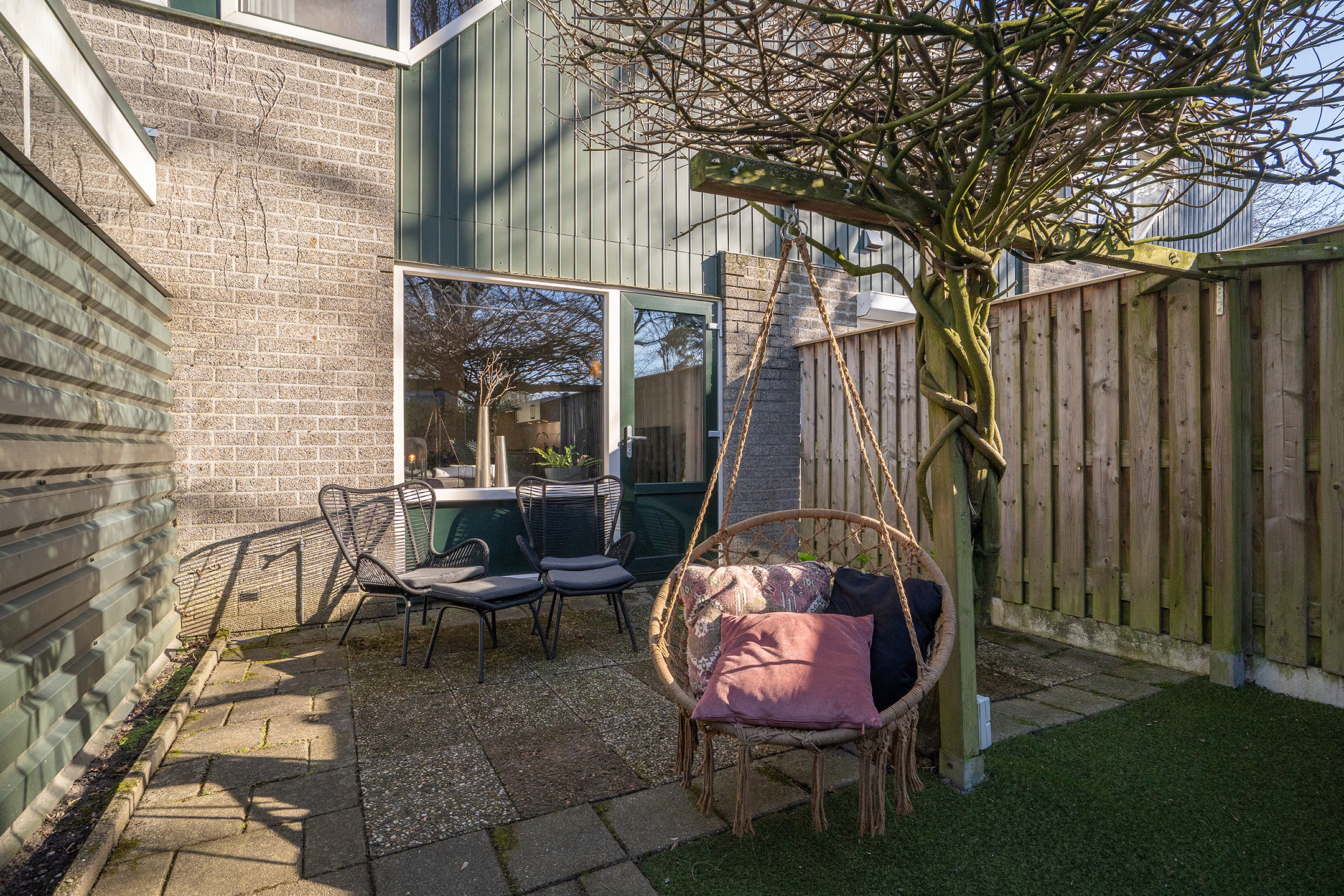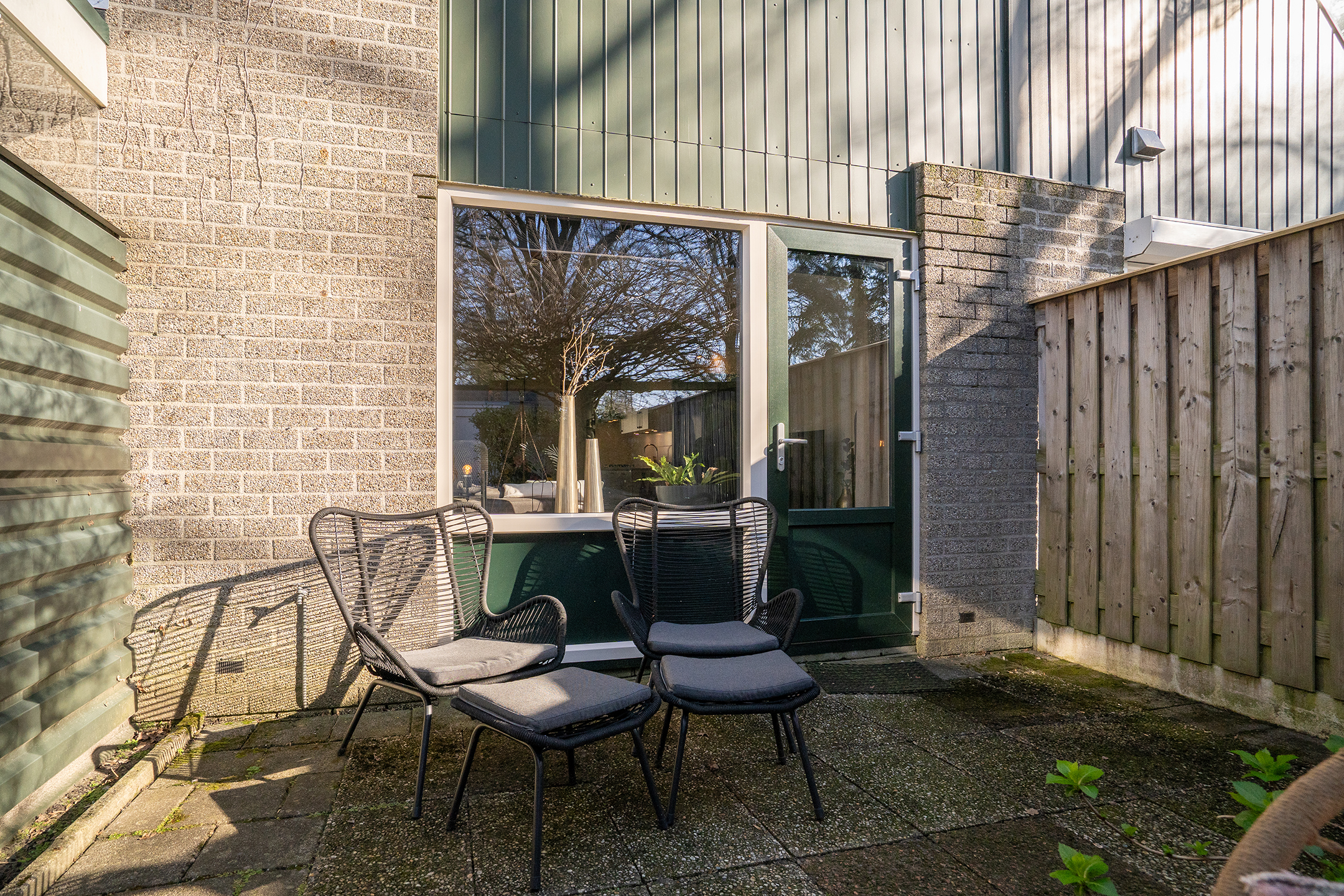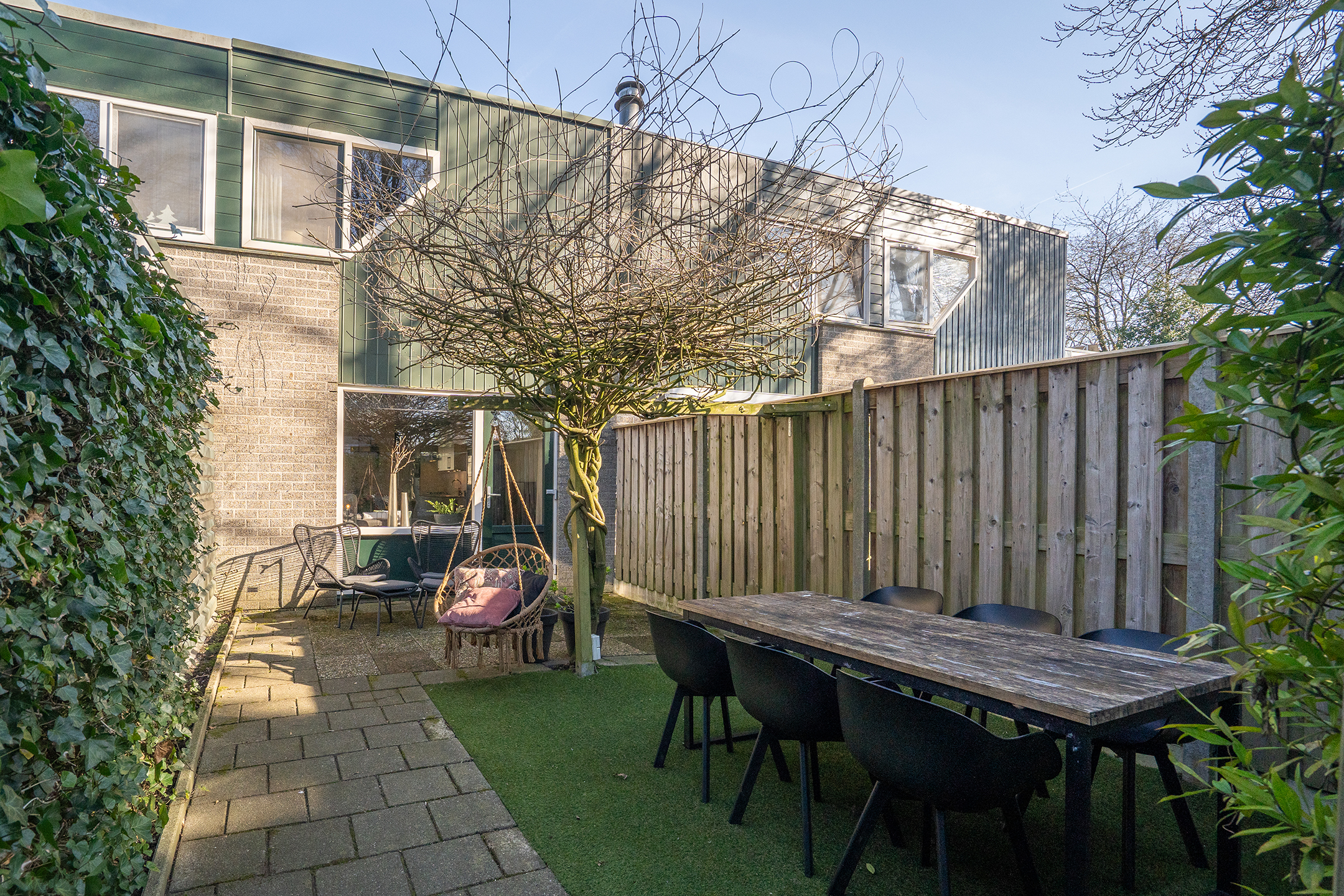 Via de achterdeur bereik je de zonnige achtertuin, wat zorgt voor een fijne verbinding tussen binnen en buiten.