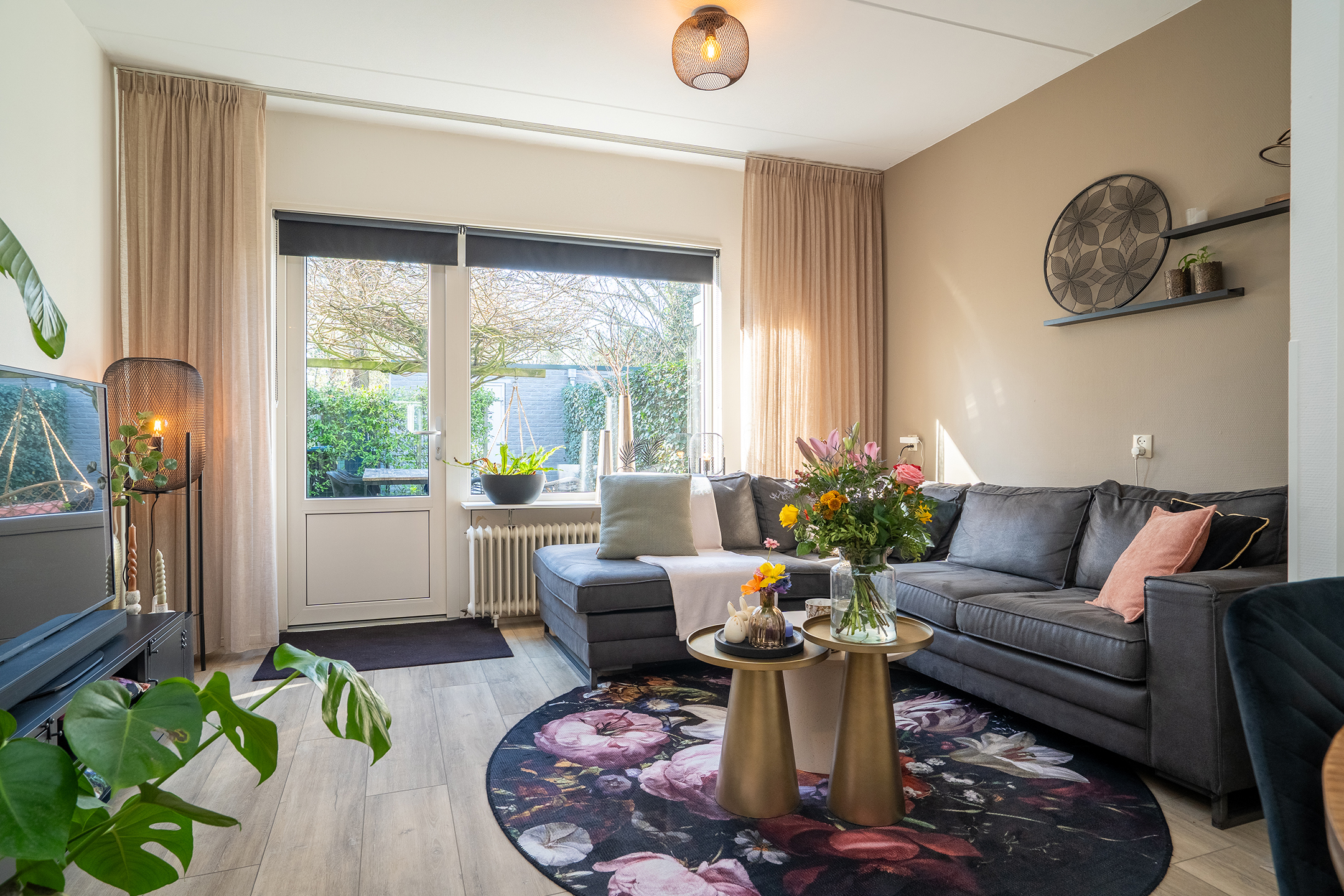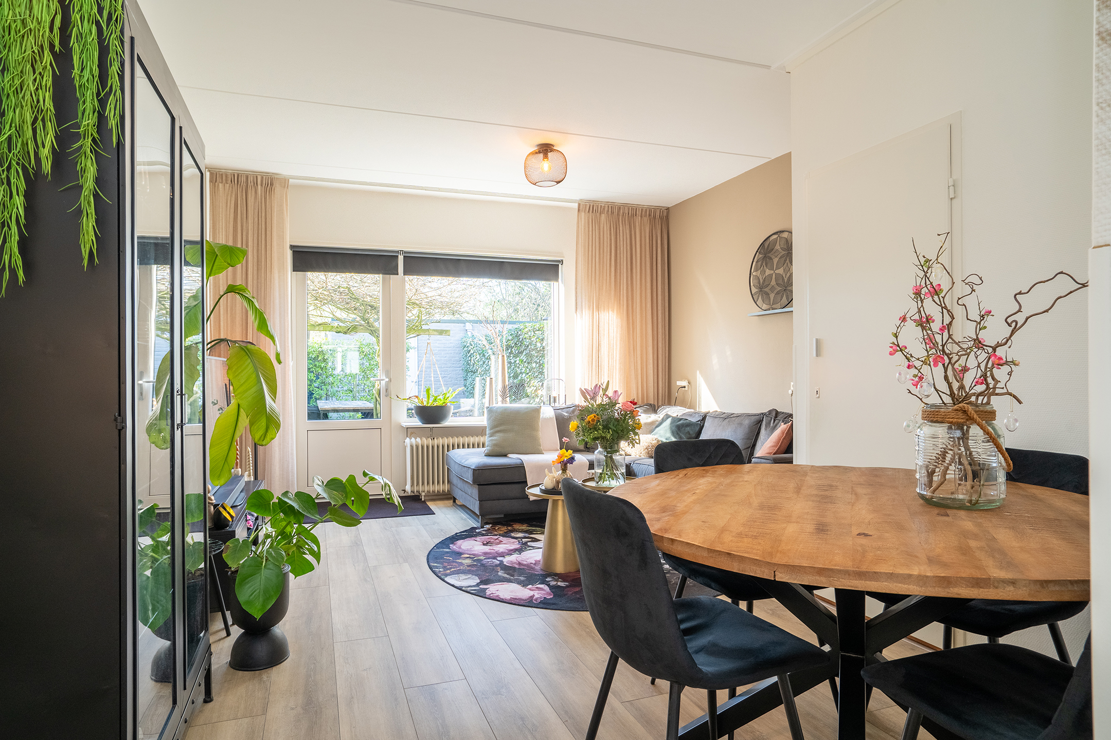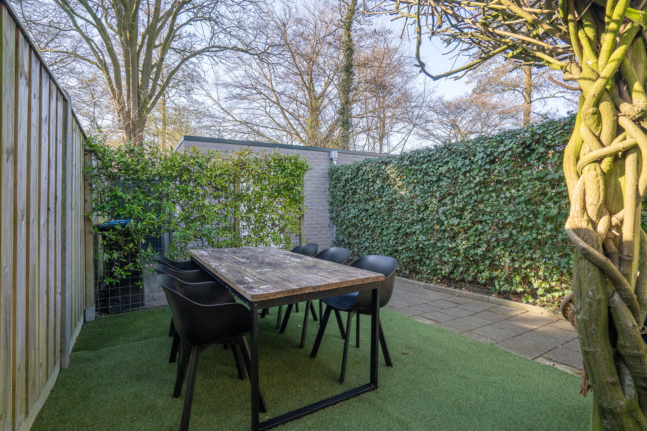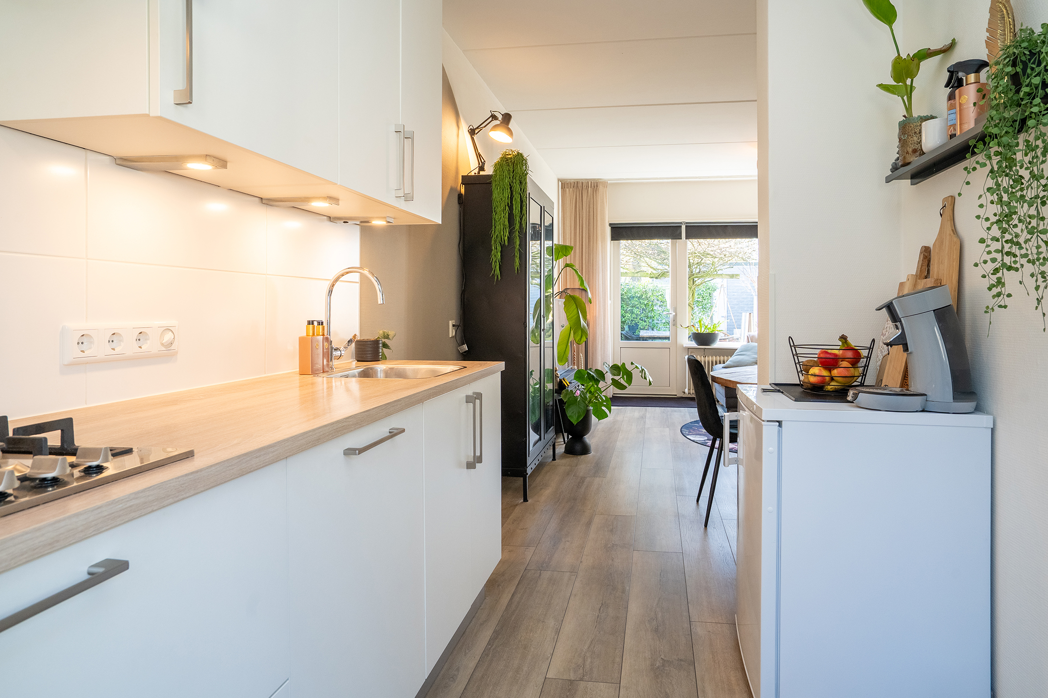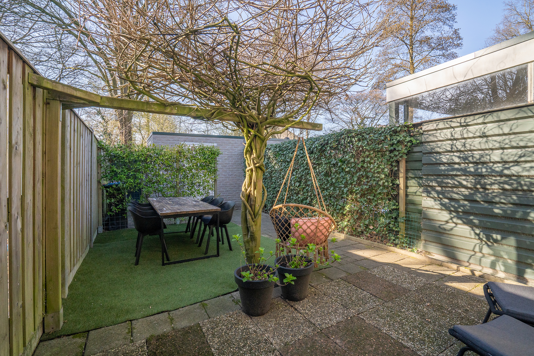 Via de achterdeur bereik je de zonnige achtertuin, wat zorgt voor een fijne verbinding tussen binnen en buiten.