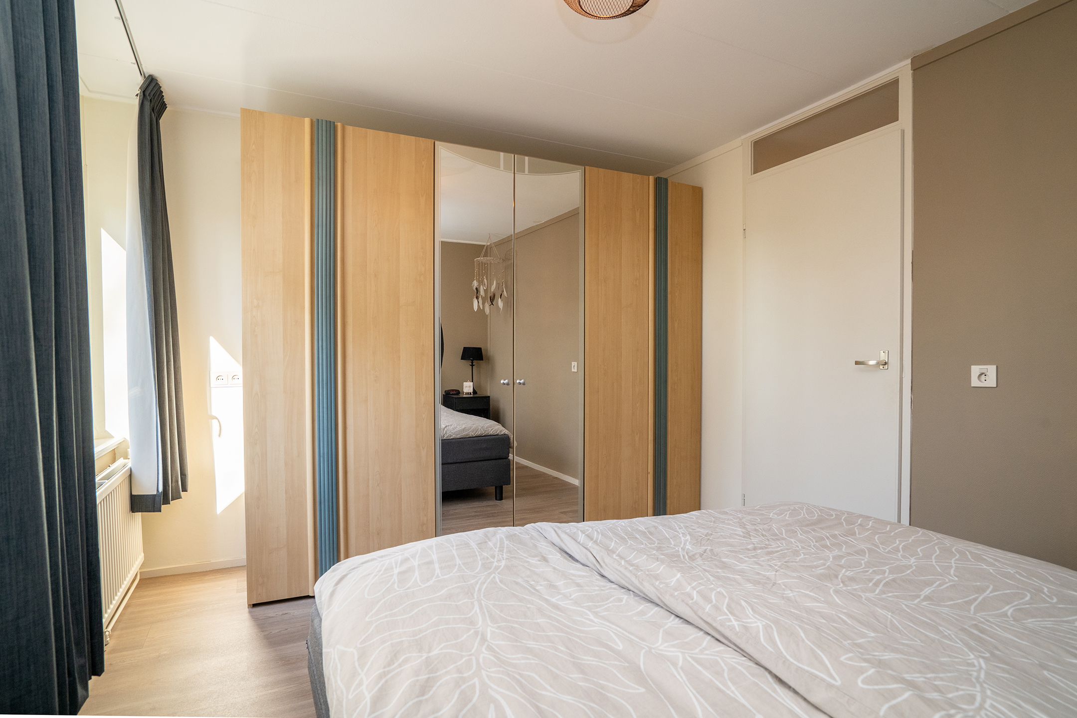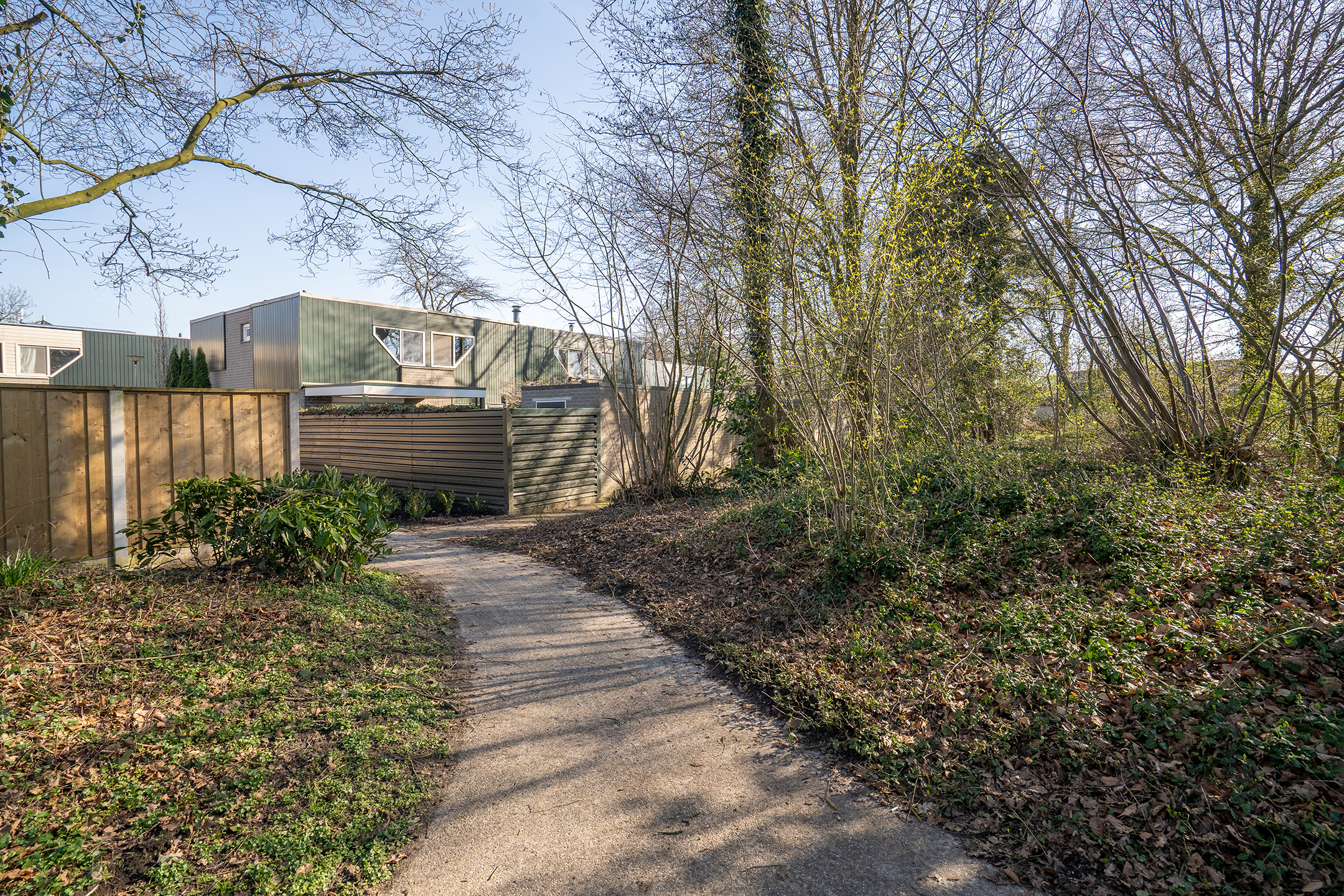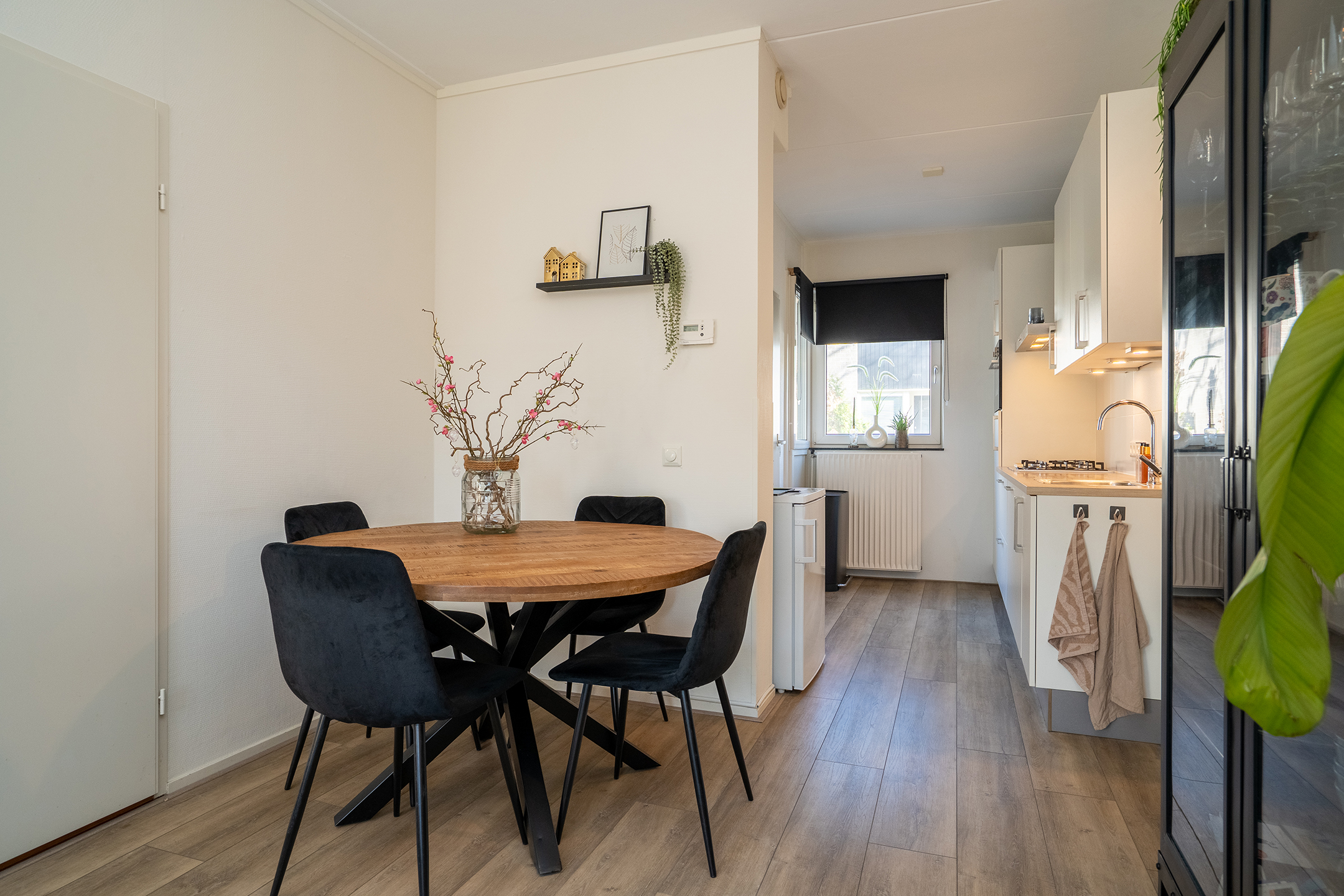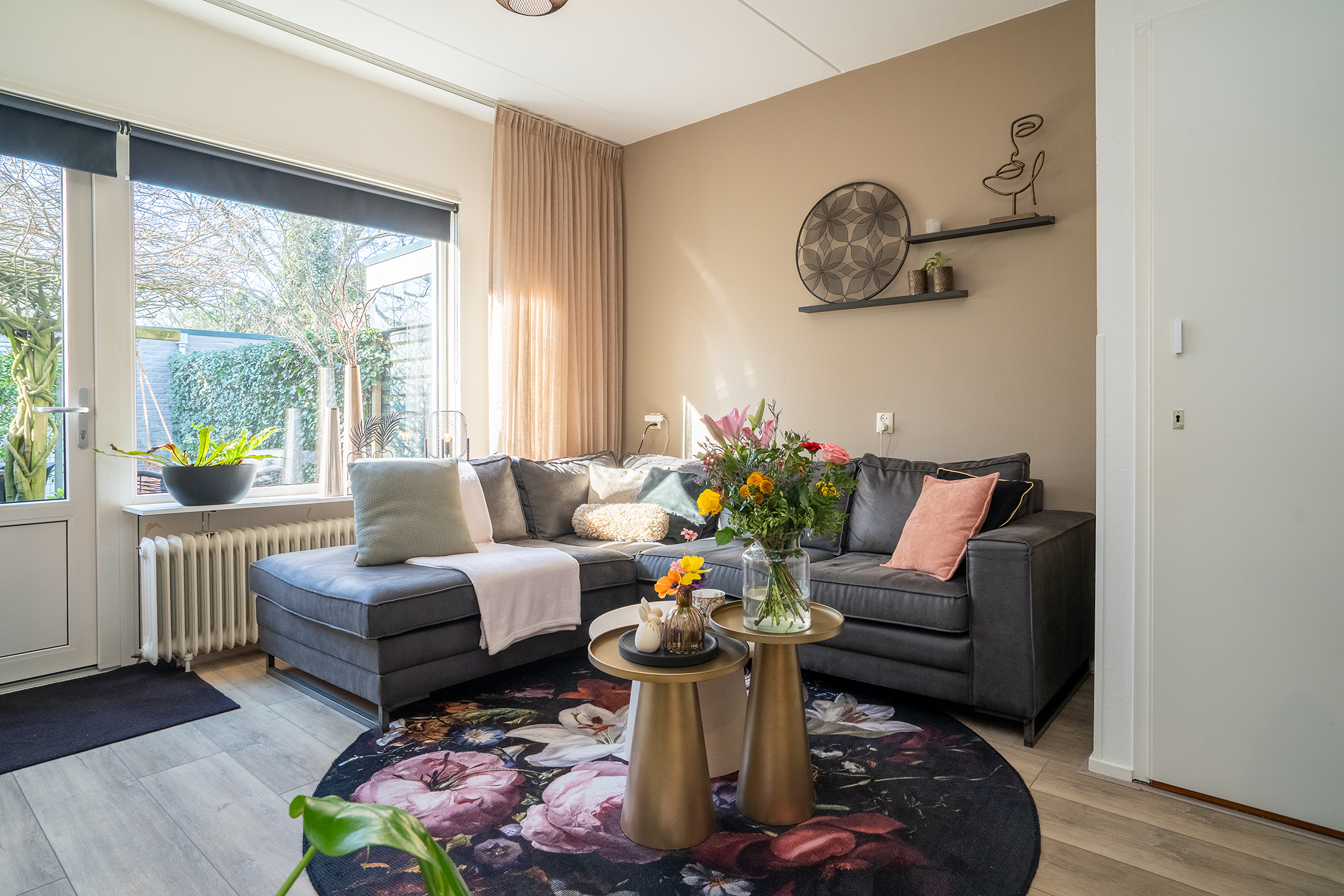 Via de achterdeur bereik je de zonnige achtertuin, wat zorgt voor een fijne verbinding tussen binnen en buiten.
