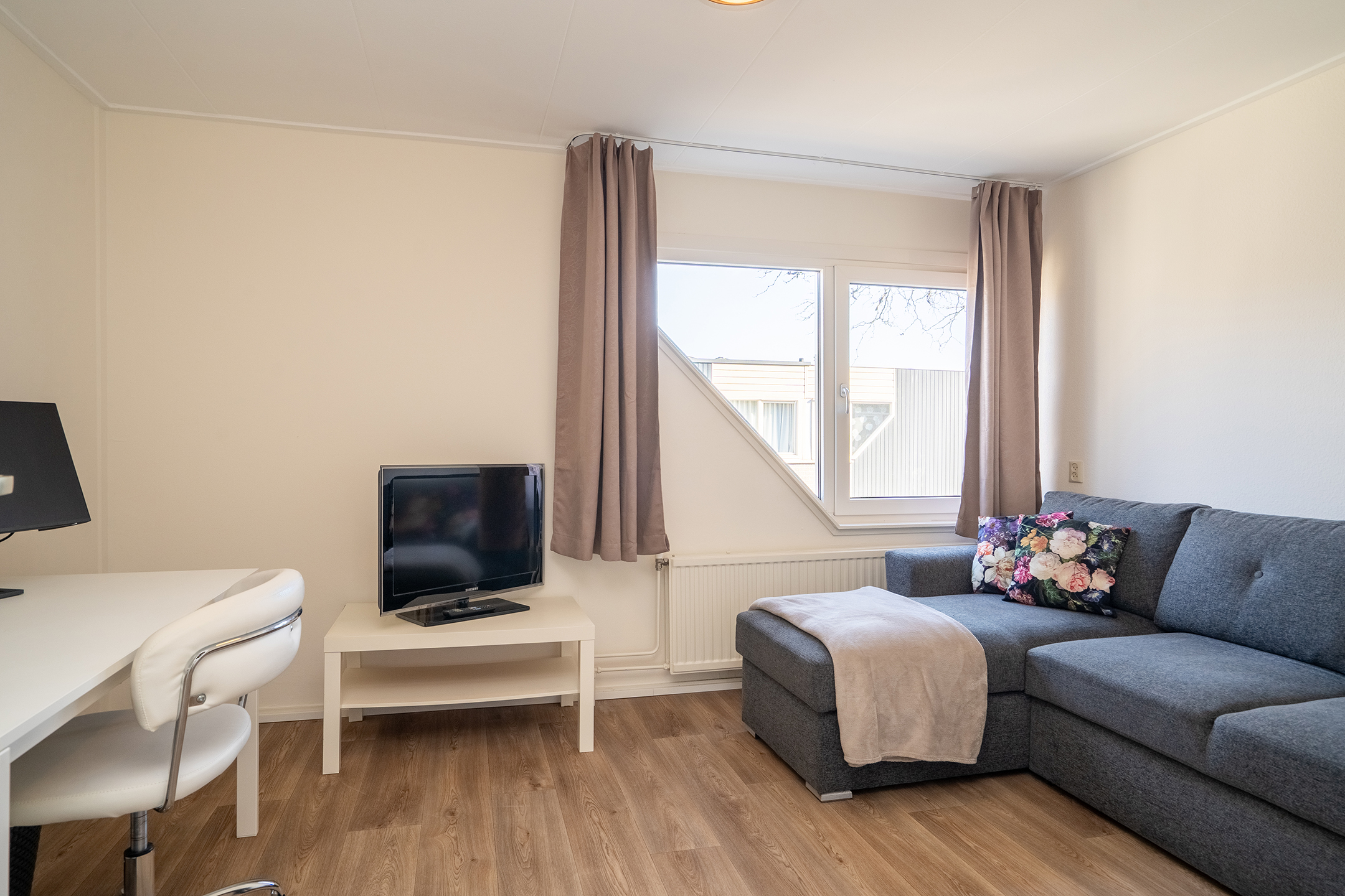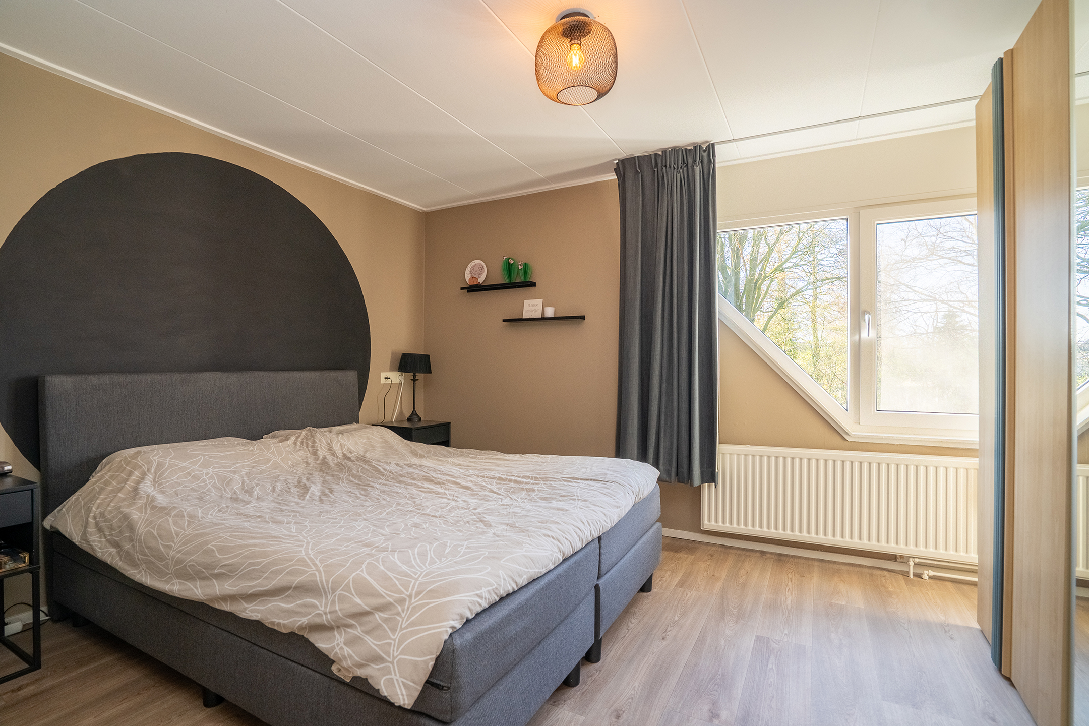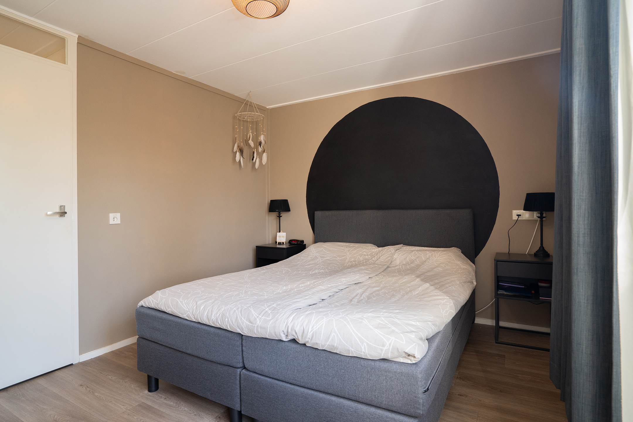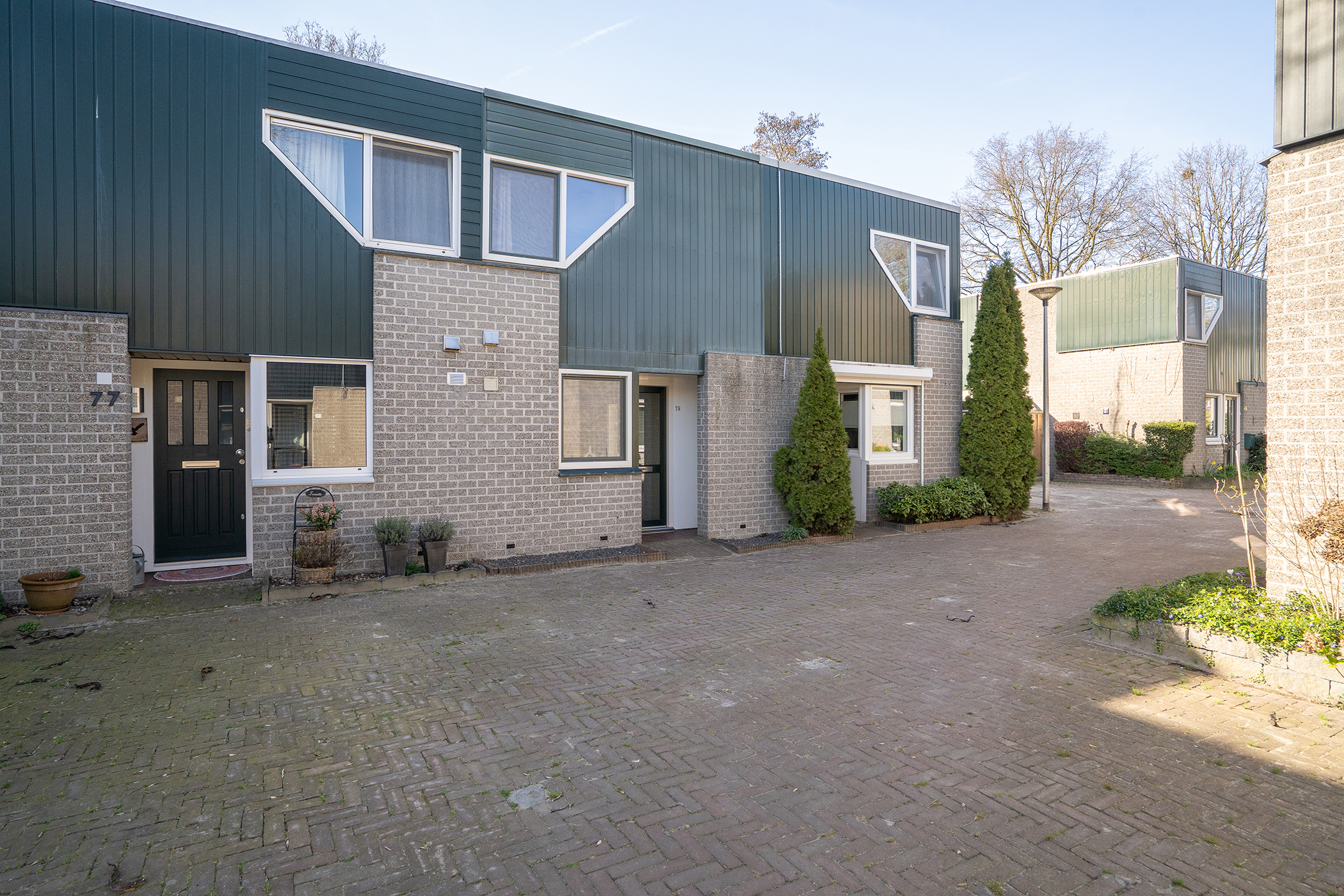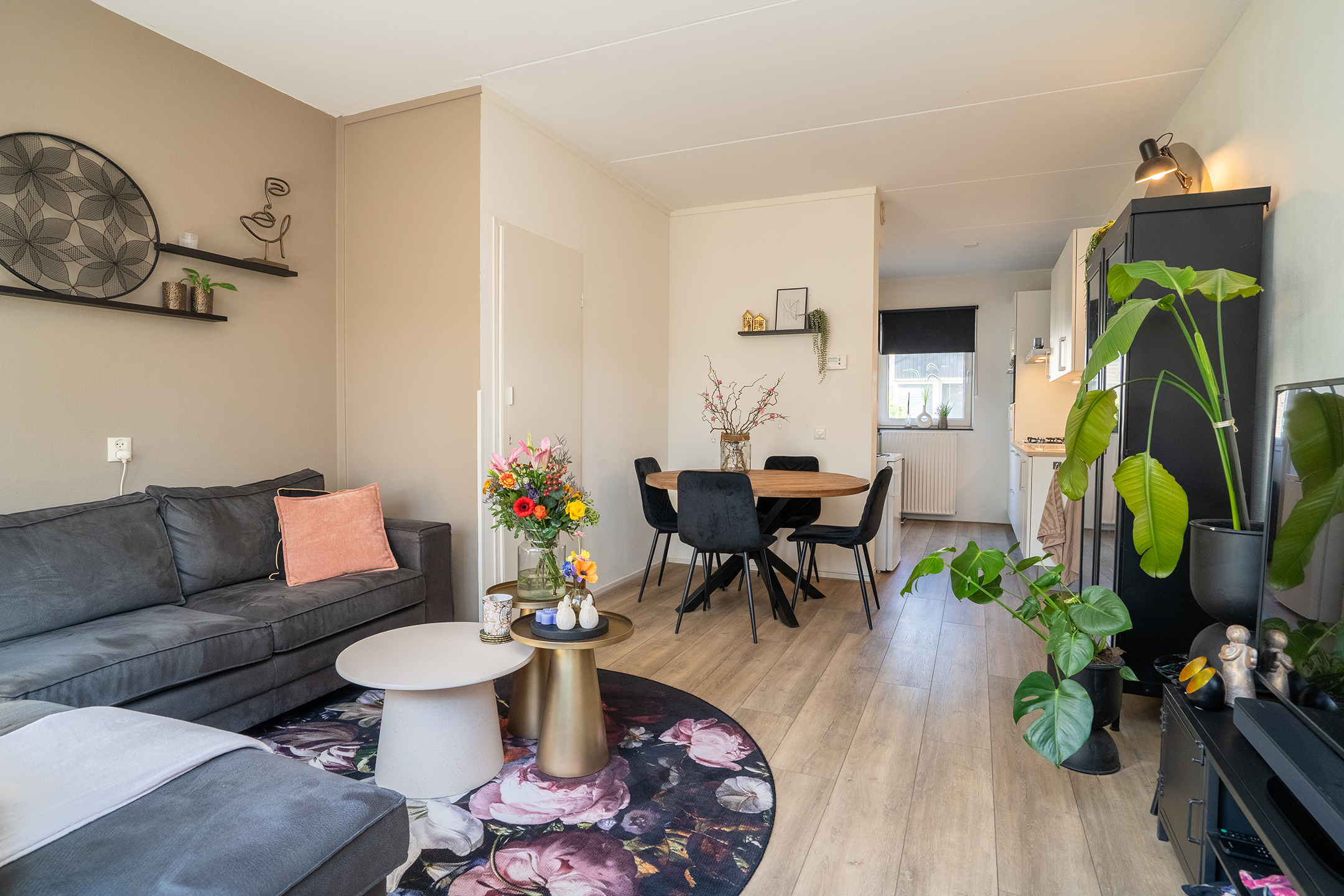 Via de achterdeur bereik je de zonnige achtertuin, wat zorgt voor een fijne verbinding tussen binnen en buiten.