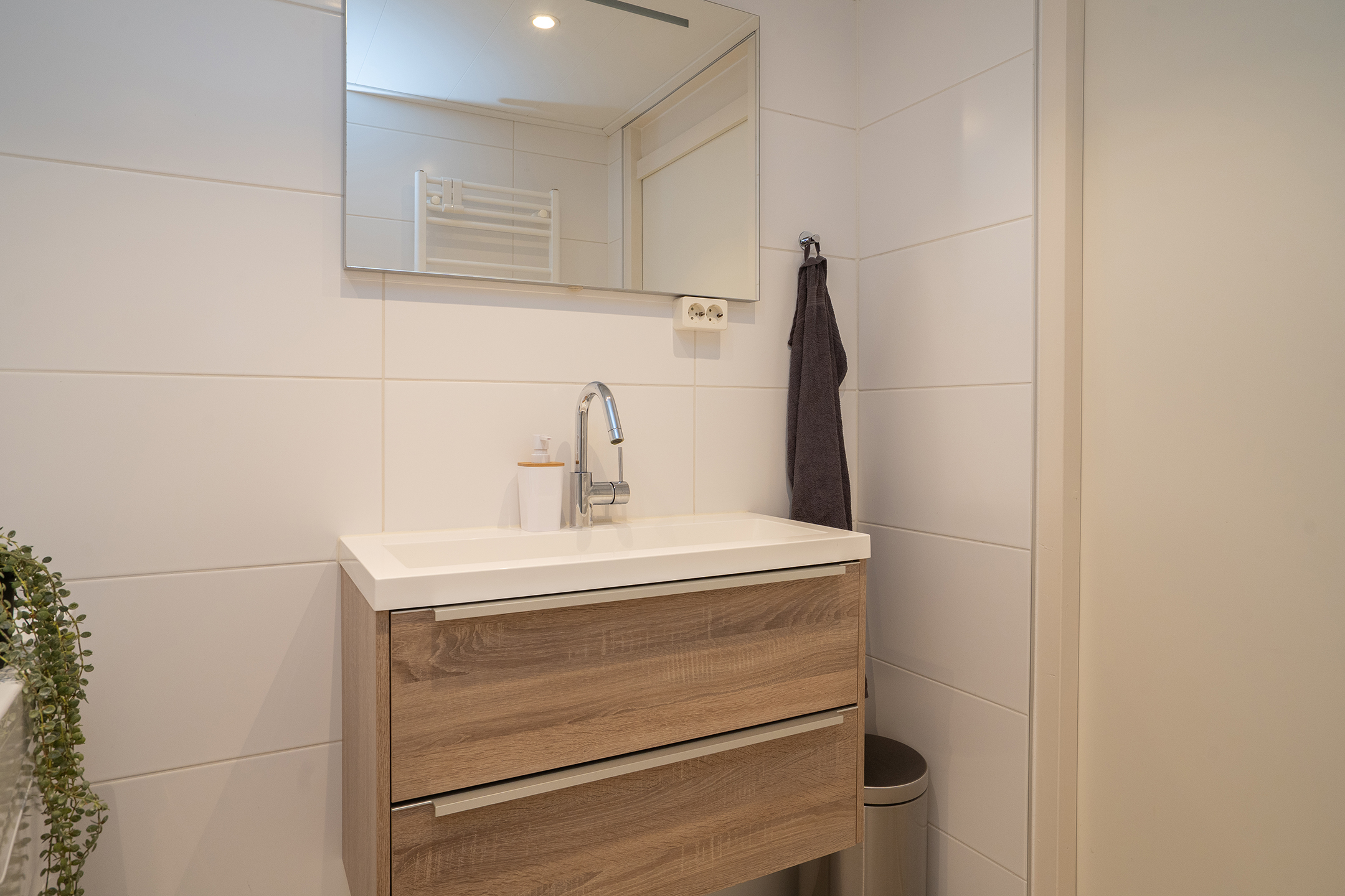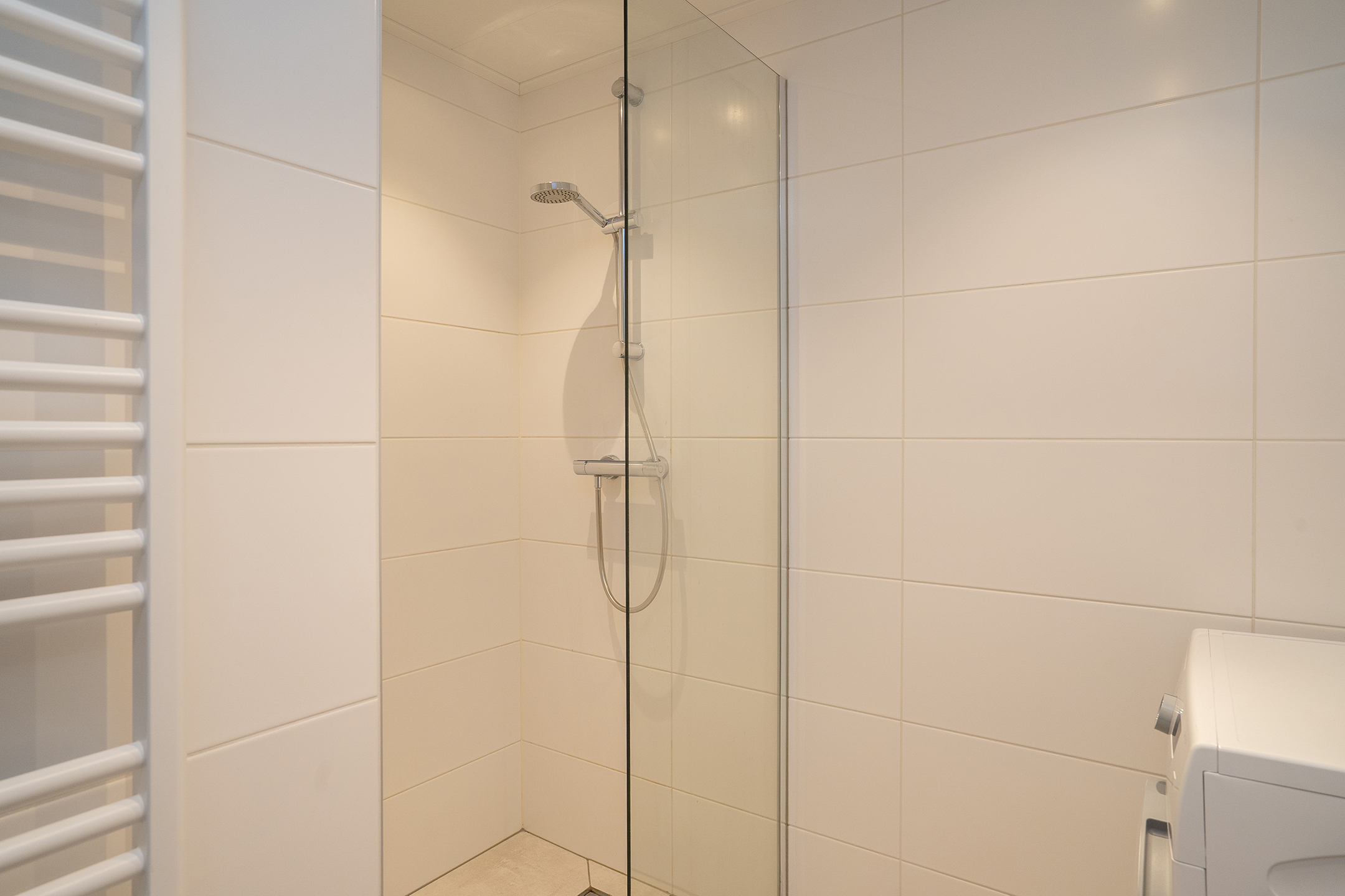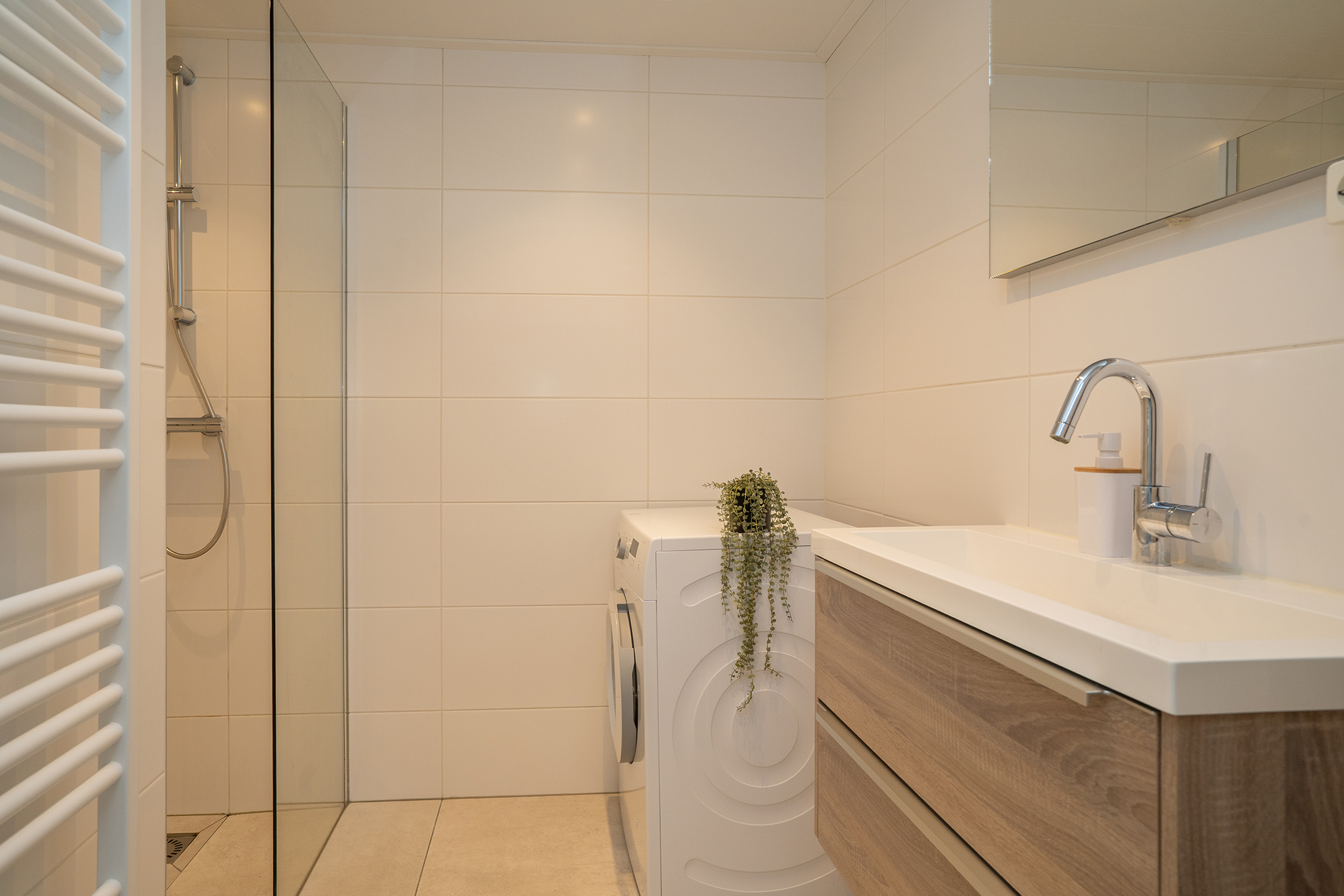 De badkamer is in 2019 vernieuwd en volledig betegeld in een strakke, moderne stijl. De ruimte is voorzien van een inloopdouche, designradiator, wastafelmeubel met dubbele lade en een designspiegel. Tevens is hier de wasmachineopstelling gesitueerd.