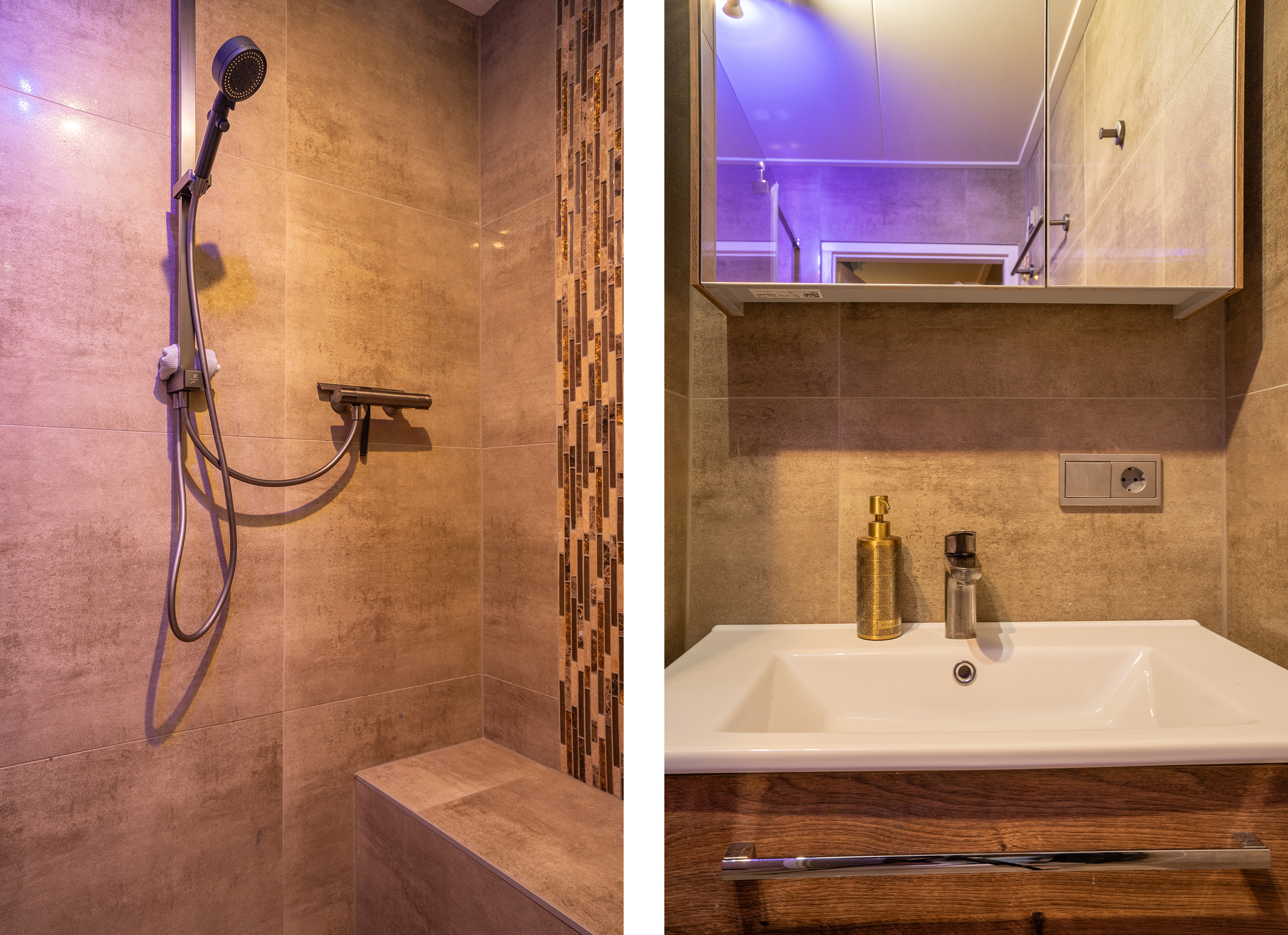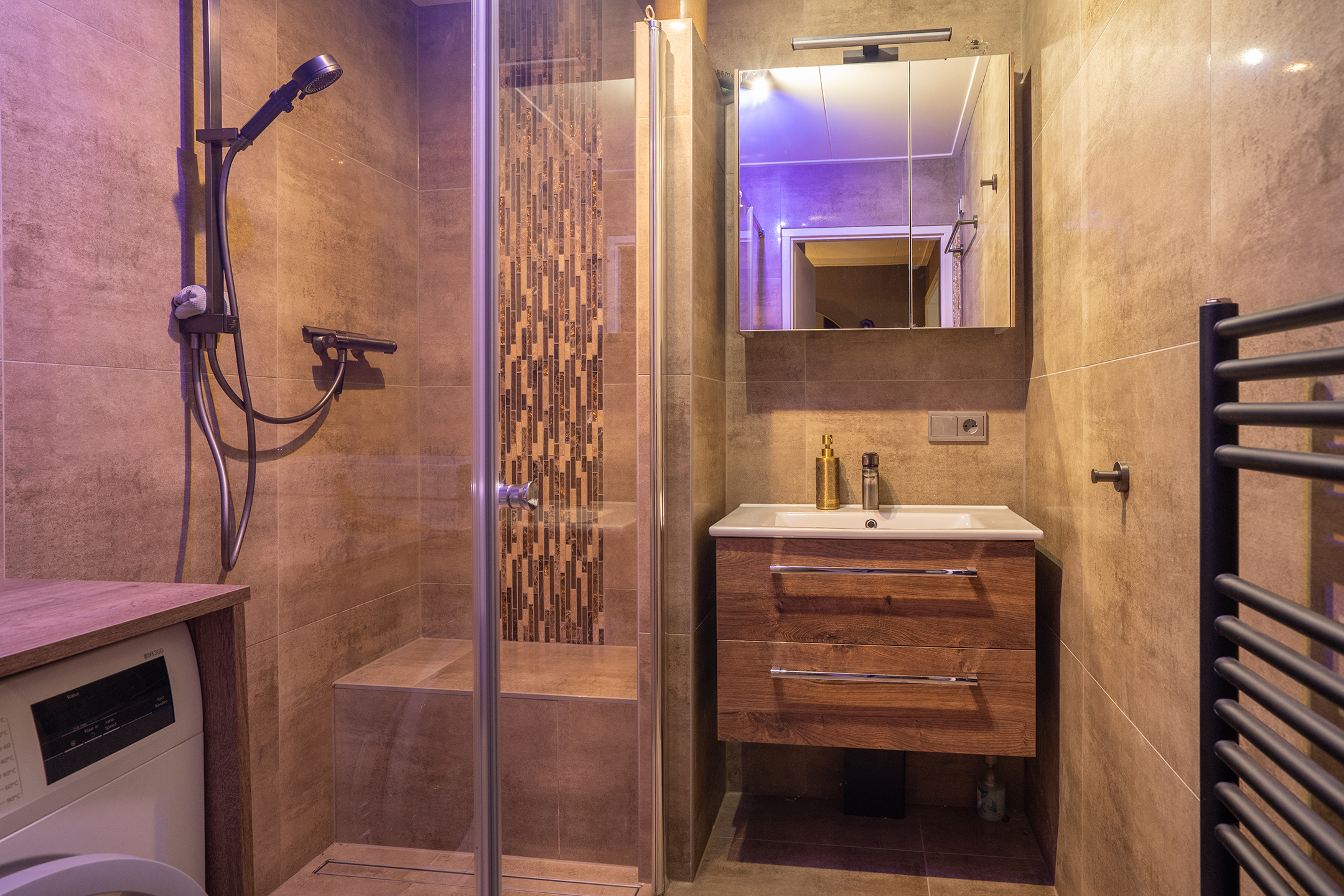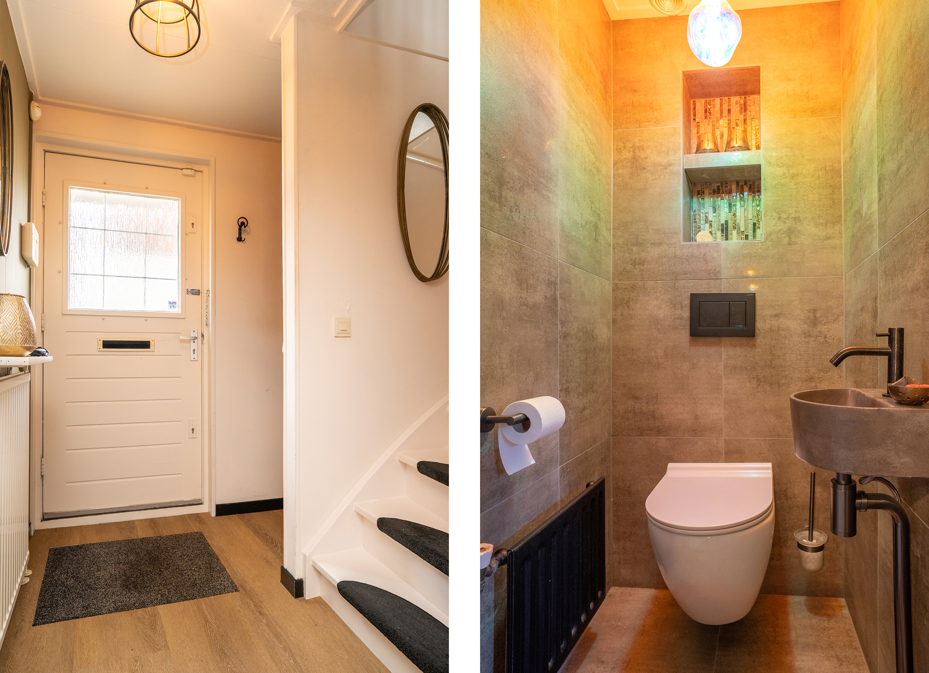 Vanuit de woonkamer is een gang bereikbaar, waar zich het separate toilet en de badkamer bevinden. Beide ruimtes zijn in 2022 volledig gemoderniseerd en afgewerkt in warme, natuurlijke tinten. De badkamer is geheel betegeld en voorzien van een wastafelmeubel, douche met ingebouwd zitbankje, designradiator en aansluiting voor de wasmachine.