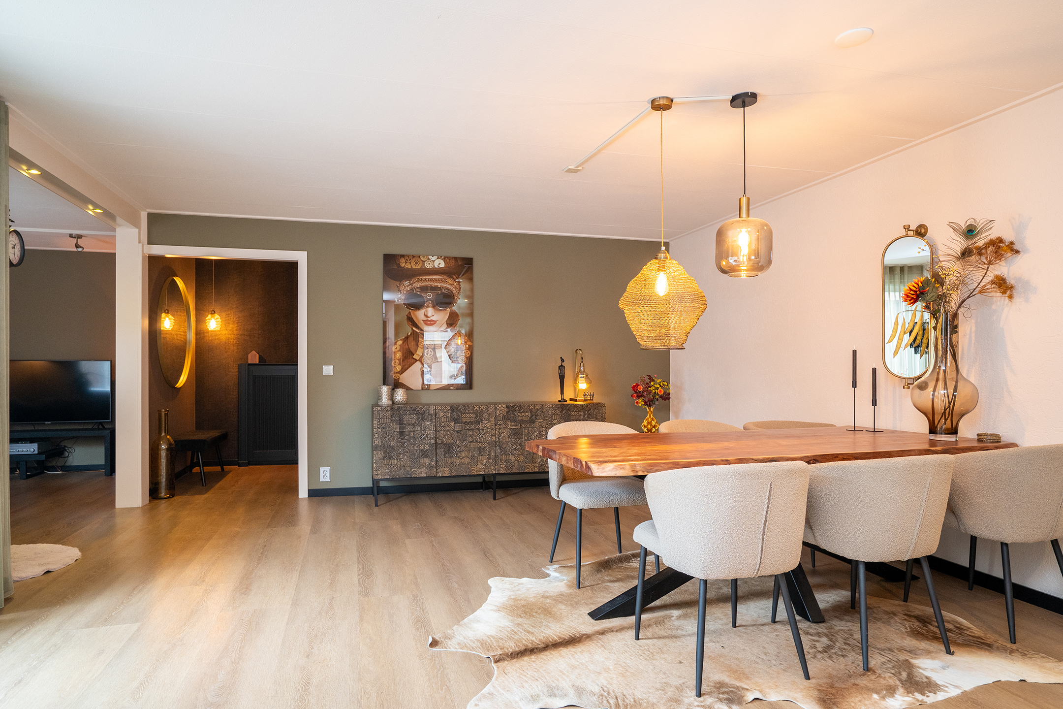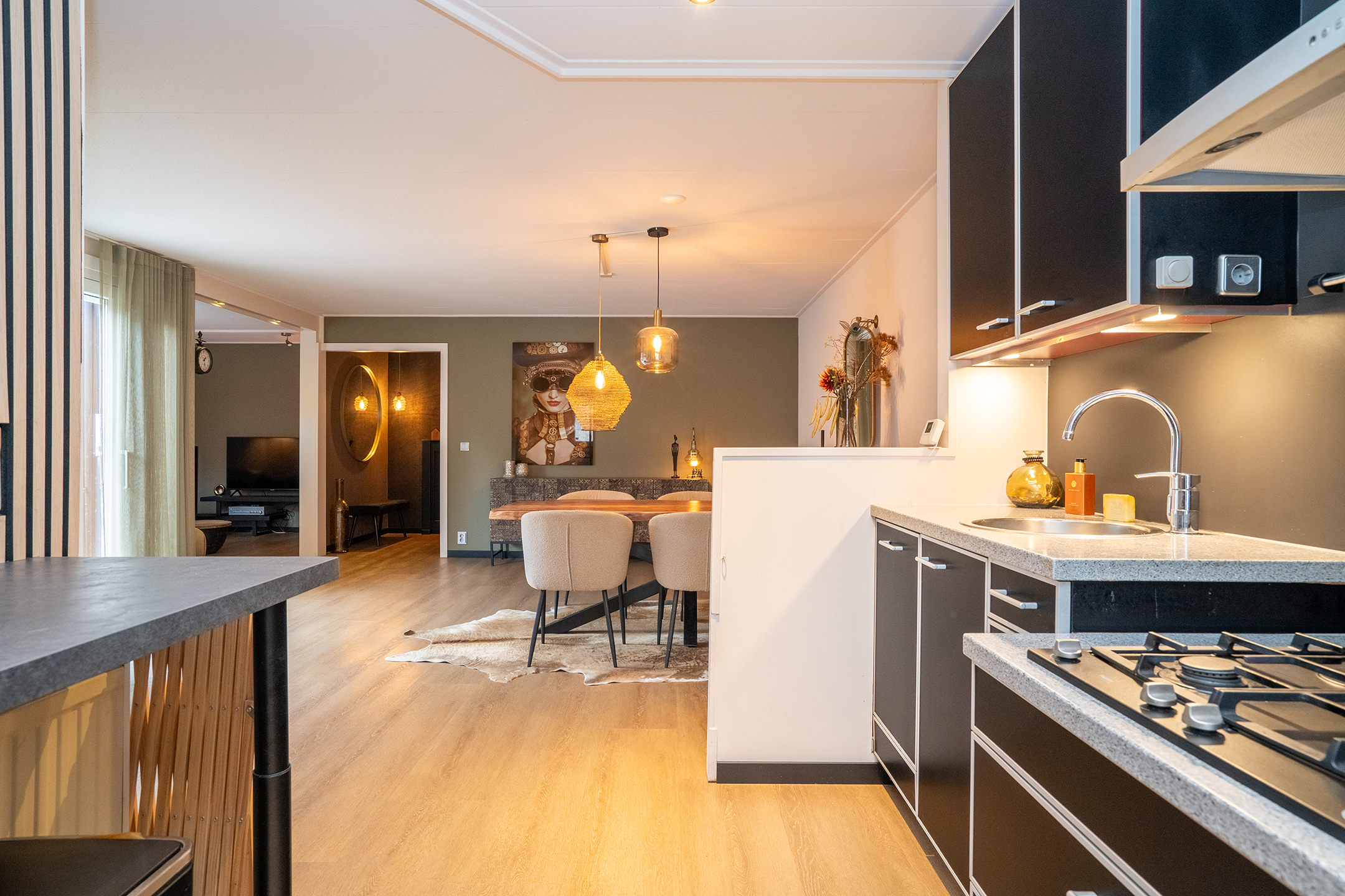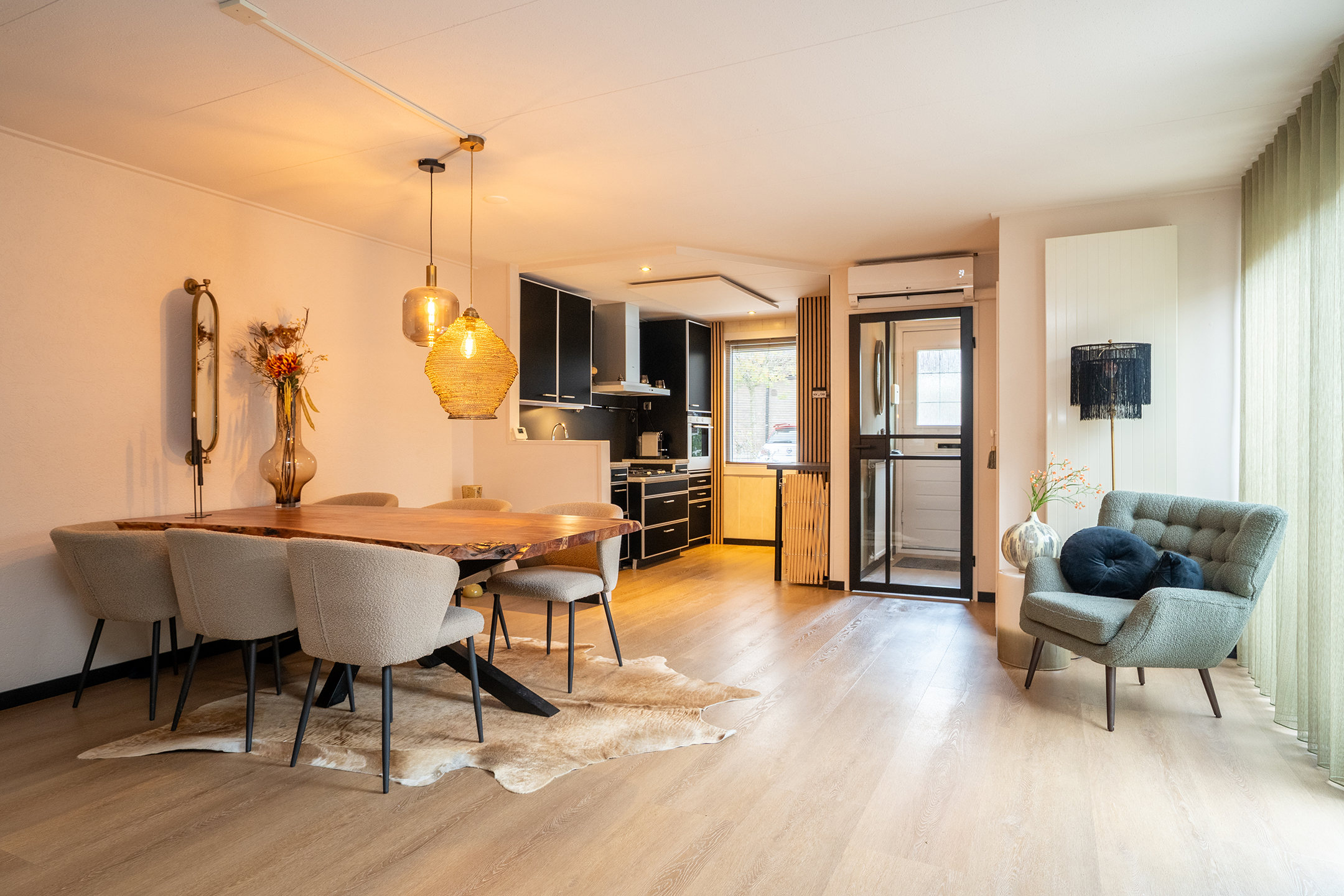 De open indeling zorgt voor een prettige verbinding tussen keuken en eetgedeelte, waardoor dit een heerlijke plek is om samen te komen. Het vele licht en de warme vloer dragen bij aan een sfeervolle uitstraling. De schuifpui zorgt voor veel daglicht en biedt direct toegang tot de tuin.