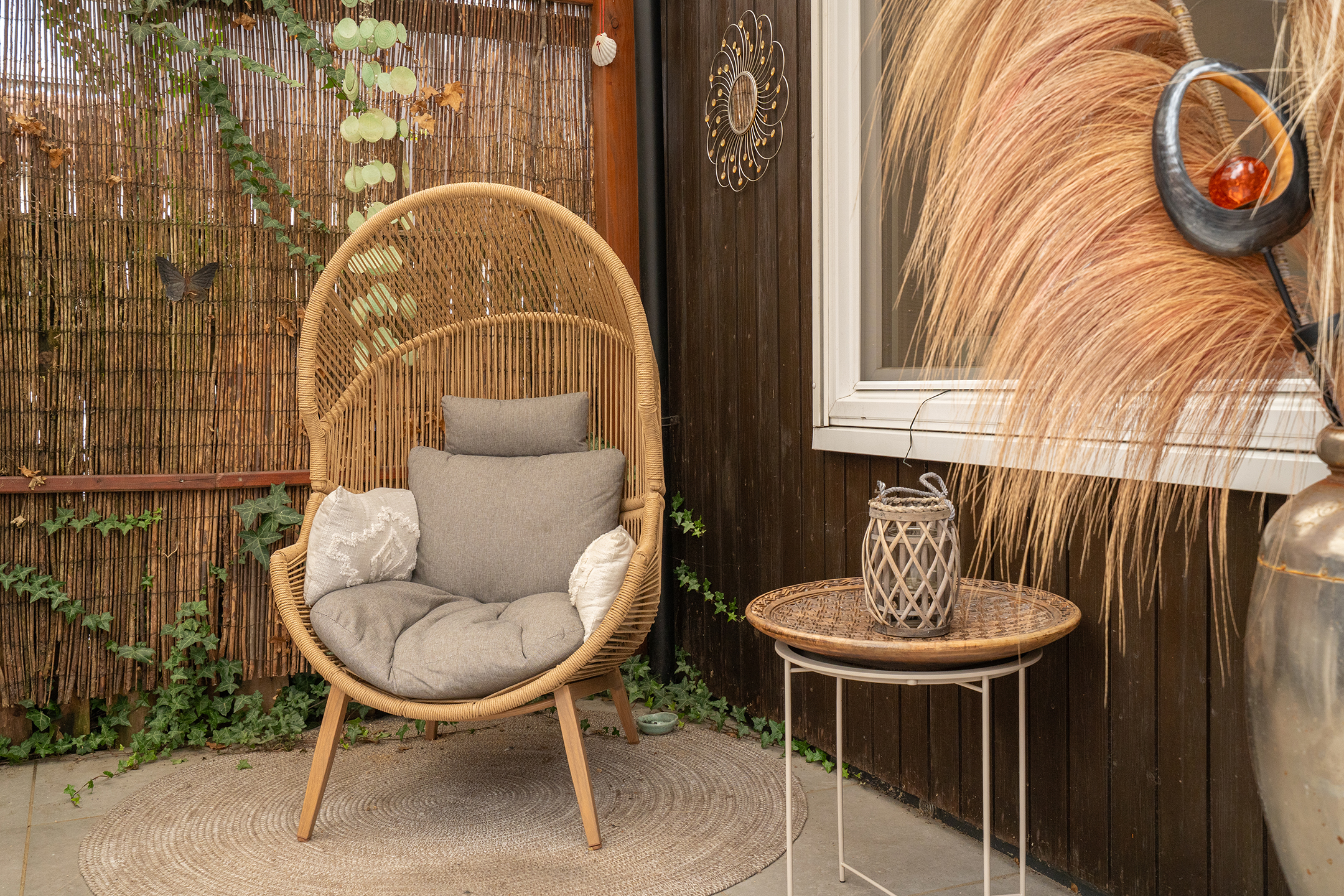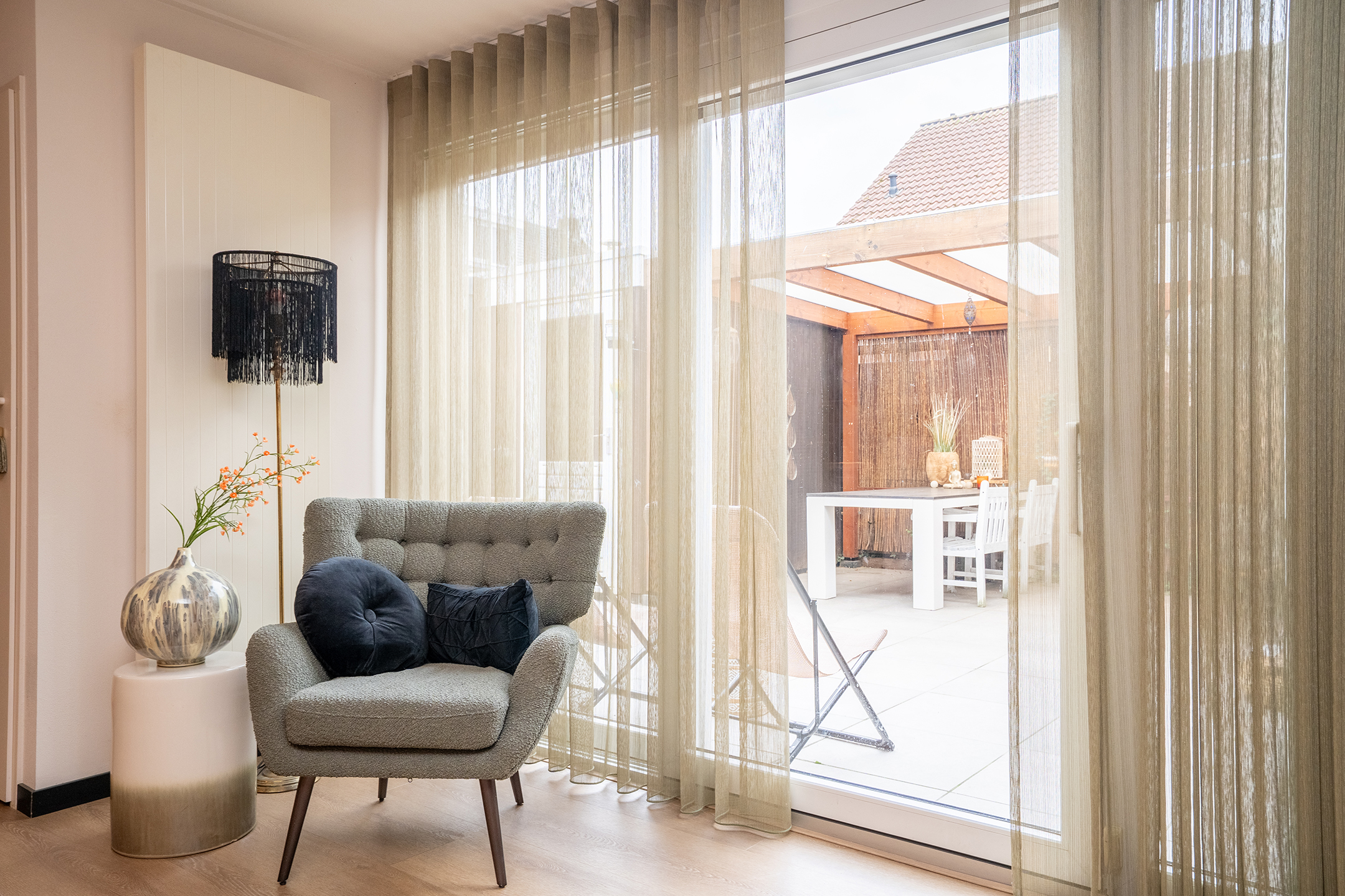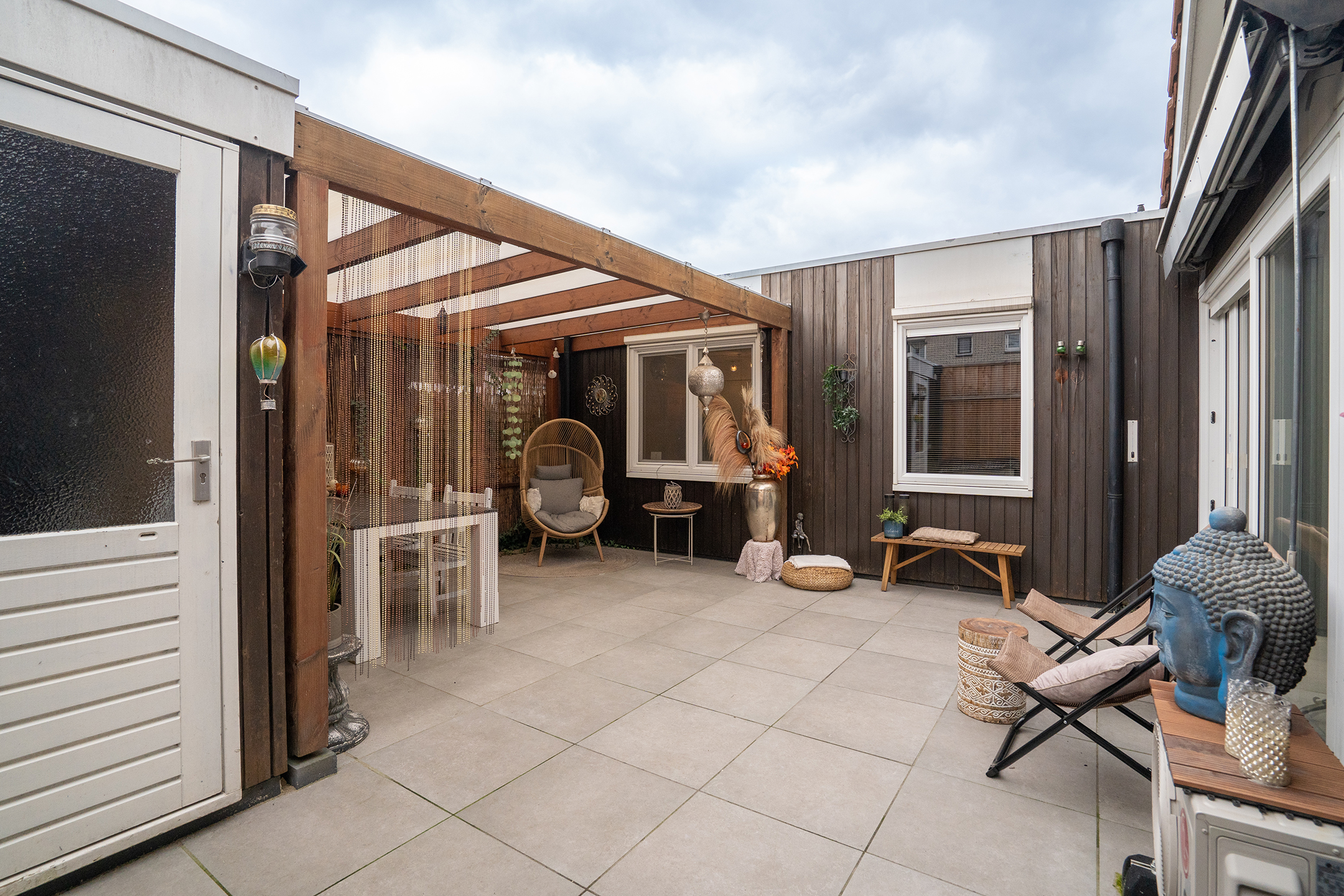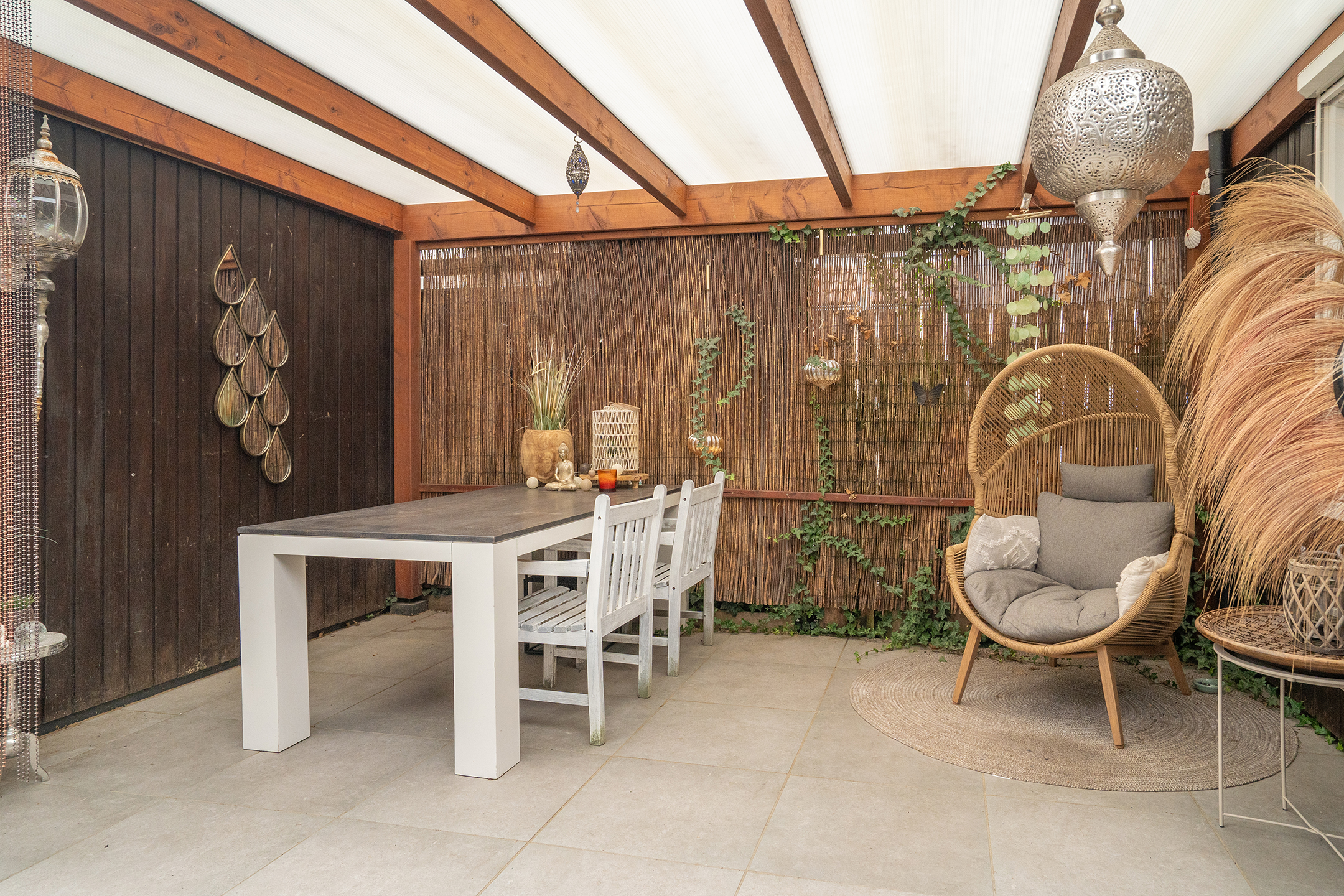 Onder de overkapping is ruimte voor een grote eettafel en een fijne zithoek, perfect om tot in de late uurtjes buiten te zitten.