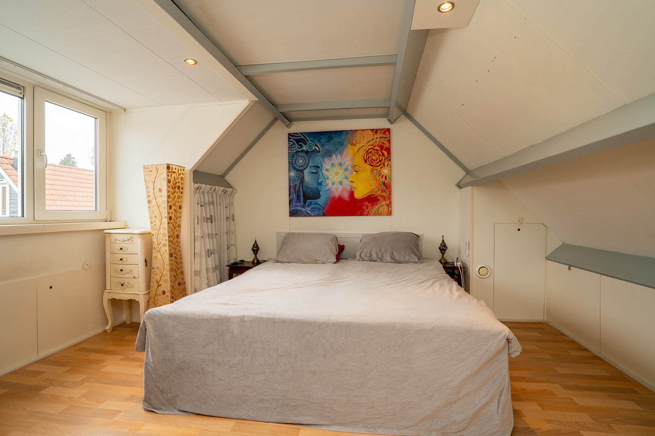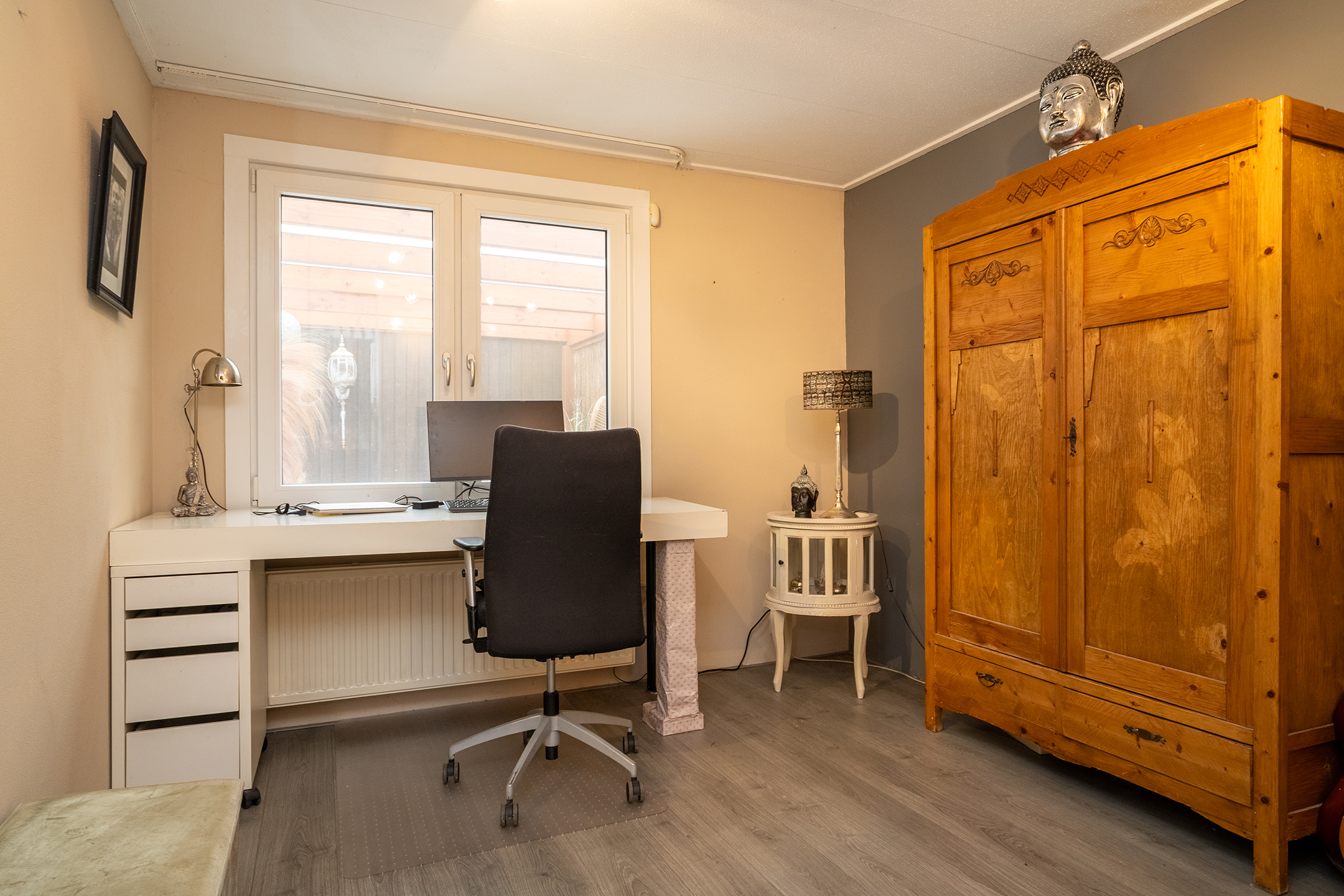 Aan de achterzijde ligt een ruime slaapkamer, momenteel in gebruik als werkkamer. De kamer heeft een nette afwerking en uitzicht op de overkapping in de tuin. Dankzij de rustige ligging is dit een fijne plek om te ontspannen of thuis te werken.