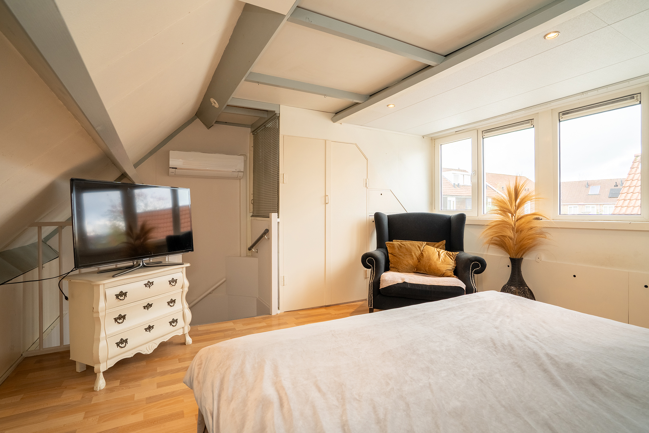 1e verdieping: Via de vaste trap bereik je de royale slaapverdieping. Dankzij de dakkapel geniet de kamer van veel natuurlijke lichtinval en een prettig ruimtelijk gevoel. Het betreft een heerlijke slaapkamer met voldoende ruimte voor een groot bed.