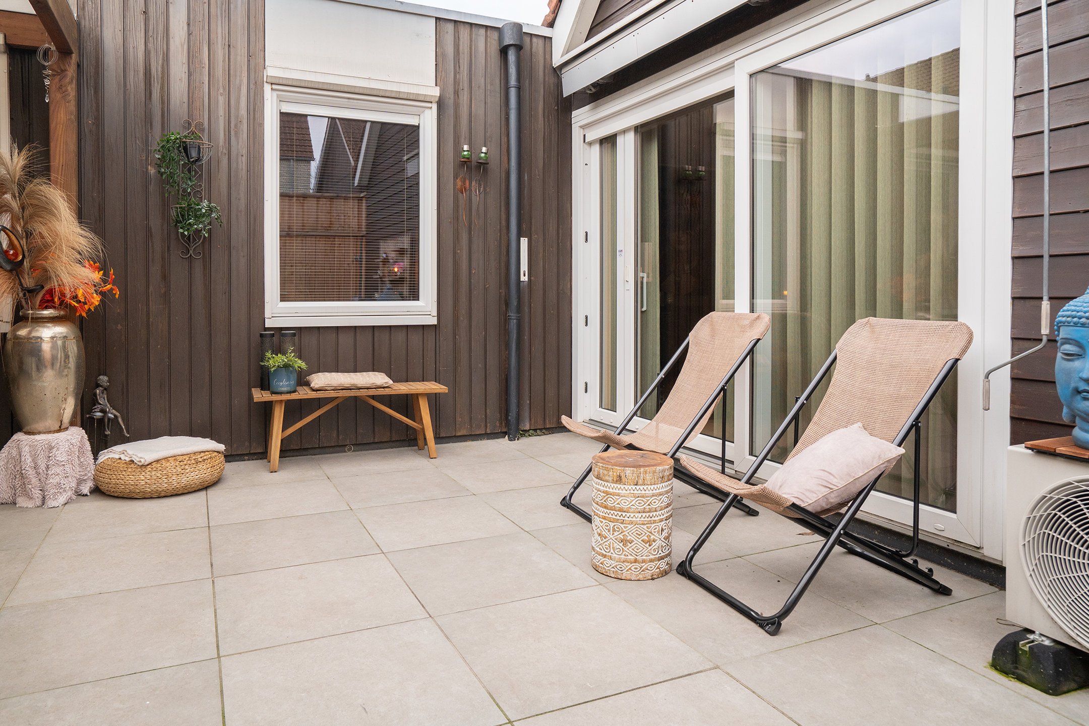 Tuin: De achtertuin vormt een prettig verlengstuk van de woonkamer. Dankzij de betegeling is de tuin onderhoudsvriendelijk en oogt deze knus en gezellig.