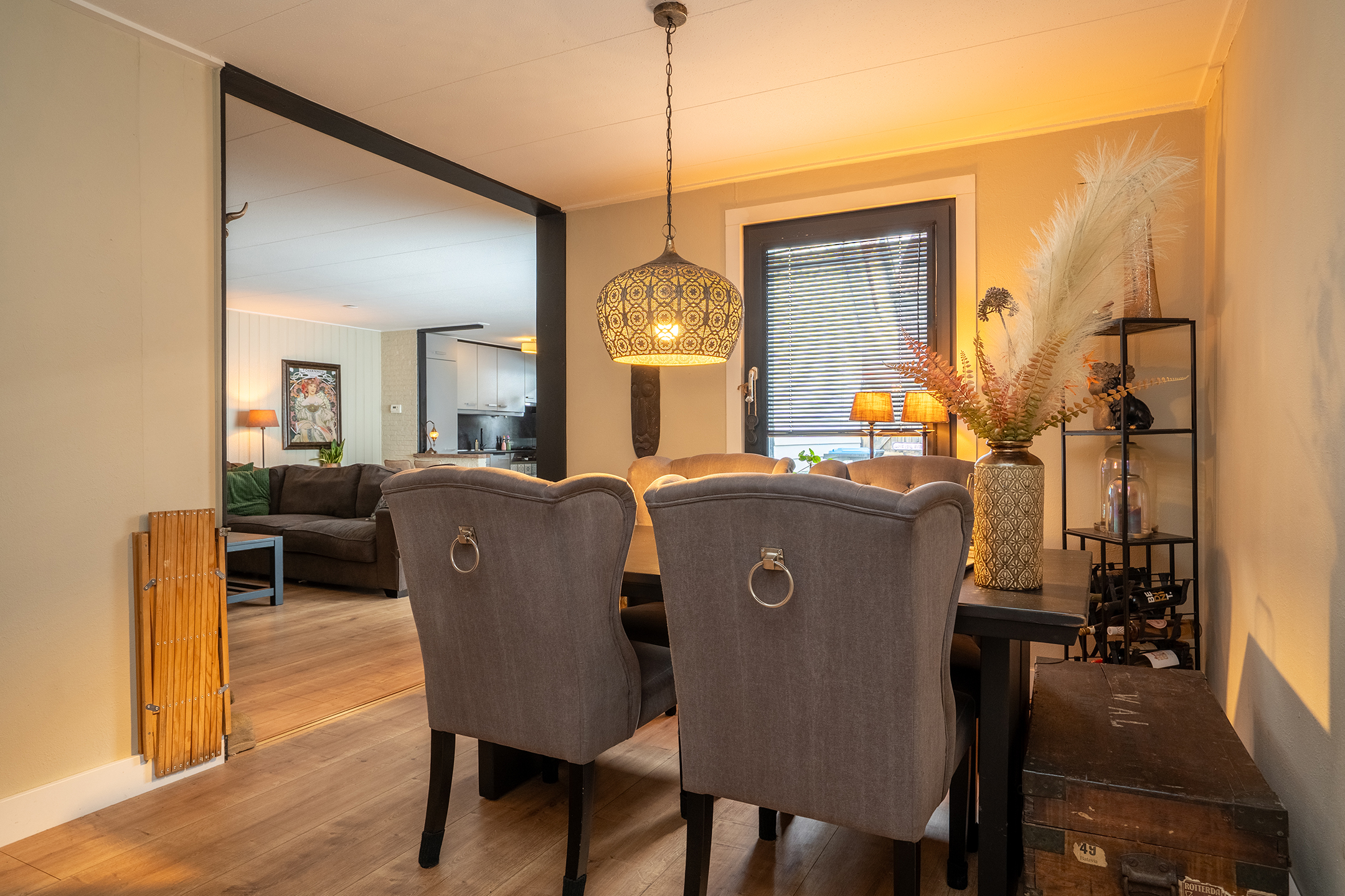 Aangrenzend aan de woonkamer bevindt zich het gezellige eetgedeelte. Dankzij de open verbinding met de woonkamer is er een fijne doorloop tussen de leefruimtes, terwijl het eetgedeelte toch een eigen rustige sfeer behoudt.