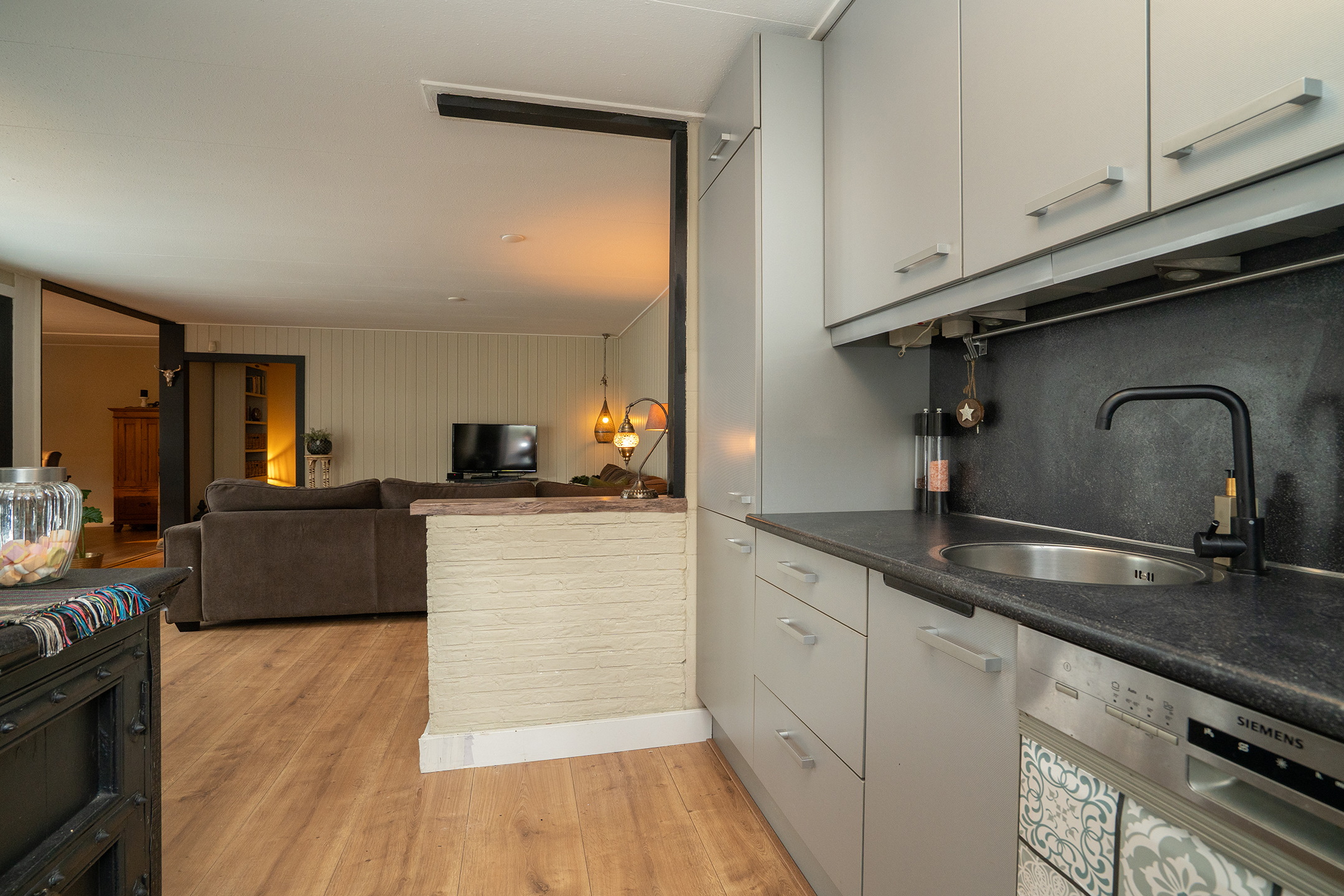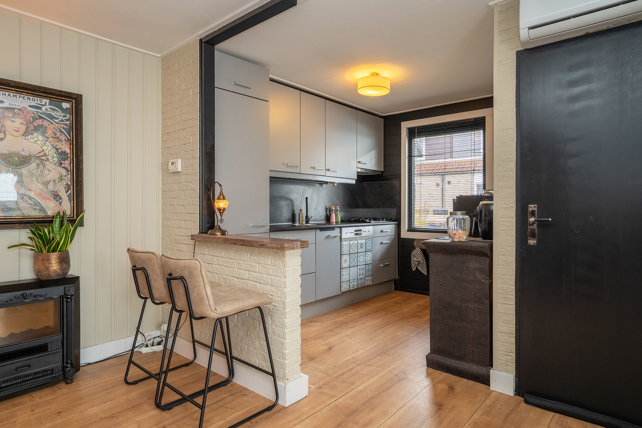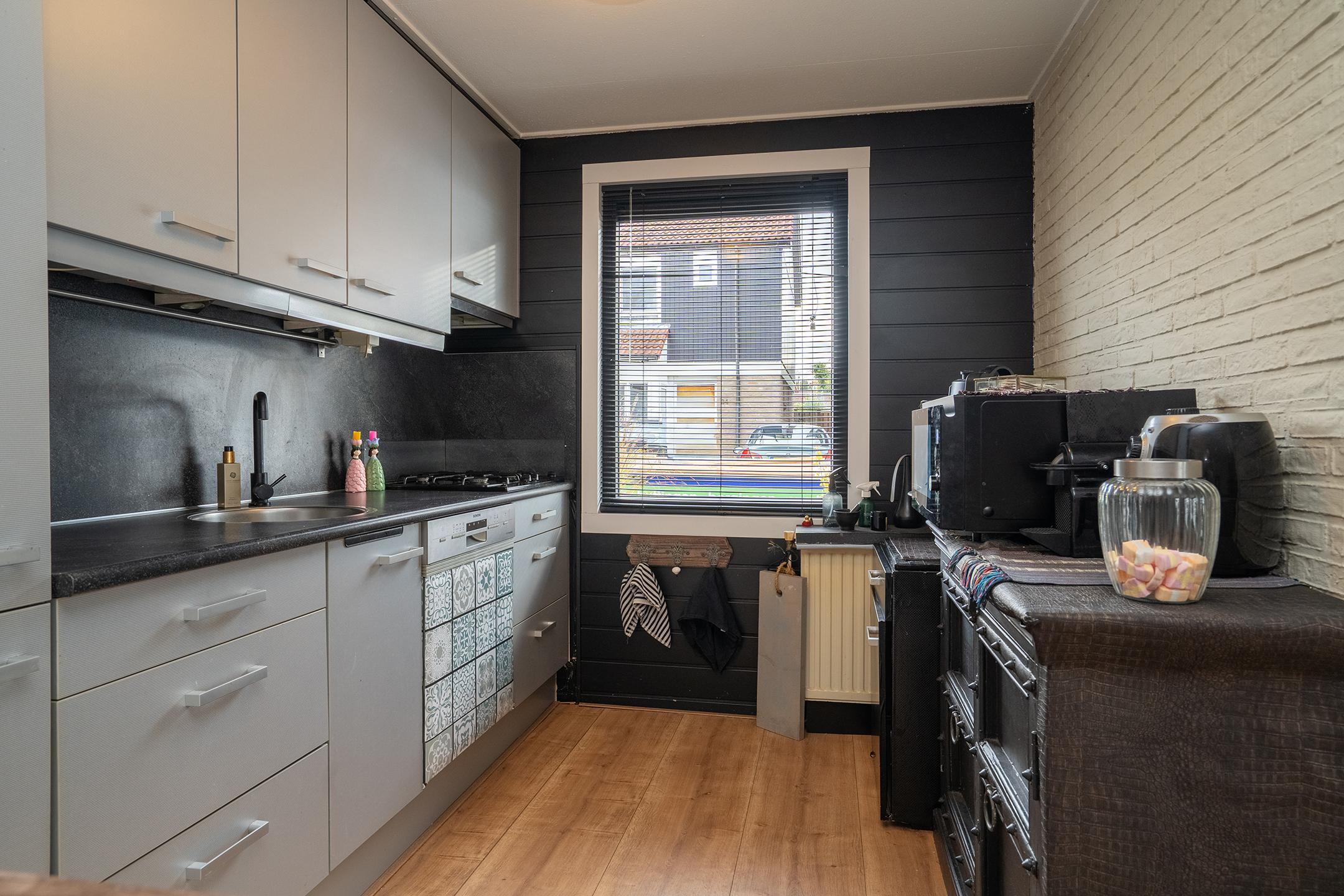De keuken ligt aan de voorzijde van de woning en is uitgevoerd in een moderne kleurstelling met een donker werkblad. De keuken is voorzien van diverse inbouwapparatuur, waaronder een gaskookplaat, afzuigkap, oven, vaatwasser en koelkast. Het raam aan de voorzijde zorgt voor prettig daglicht en een leuk zicht op de straat.