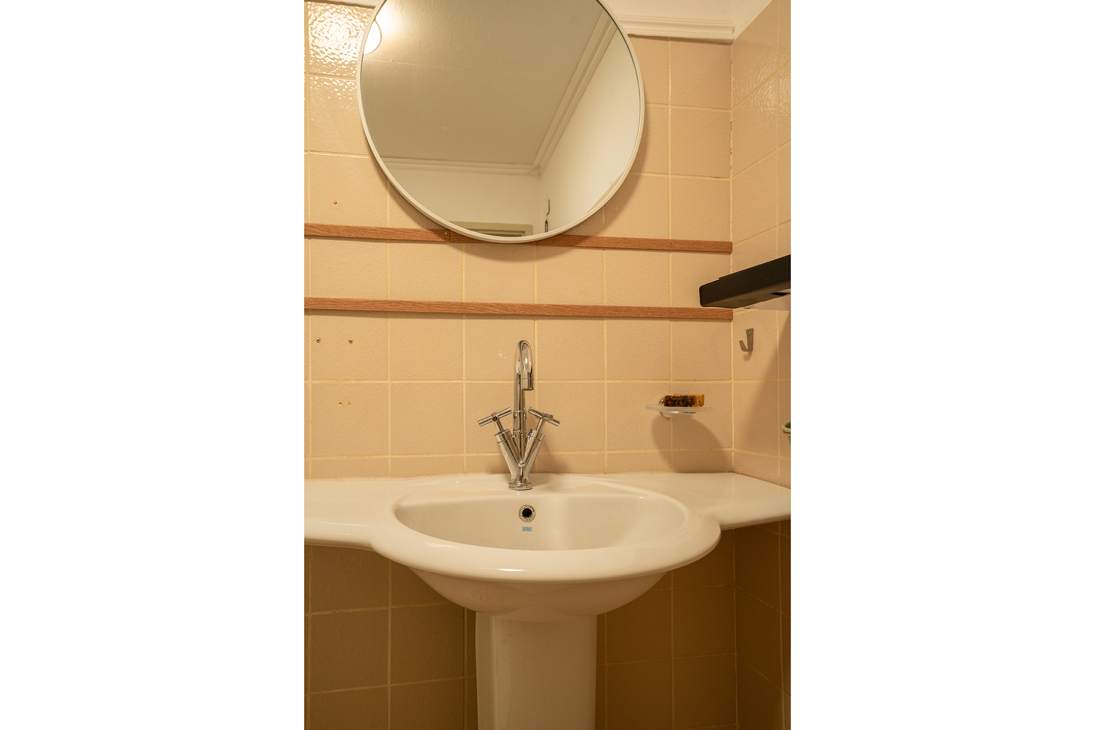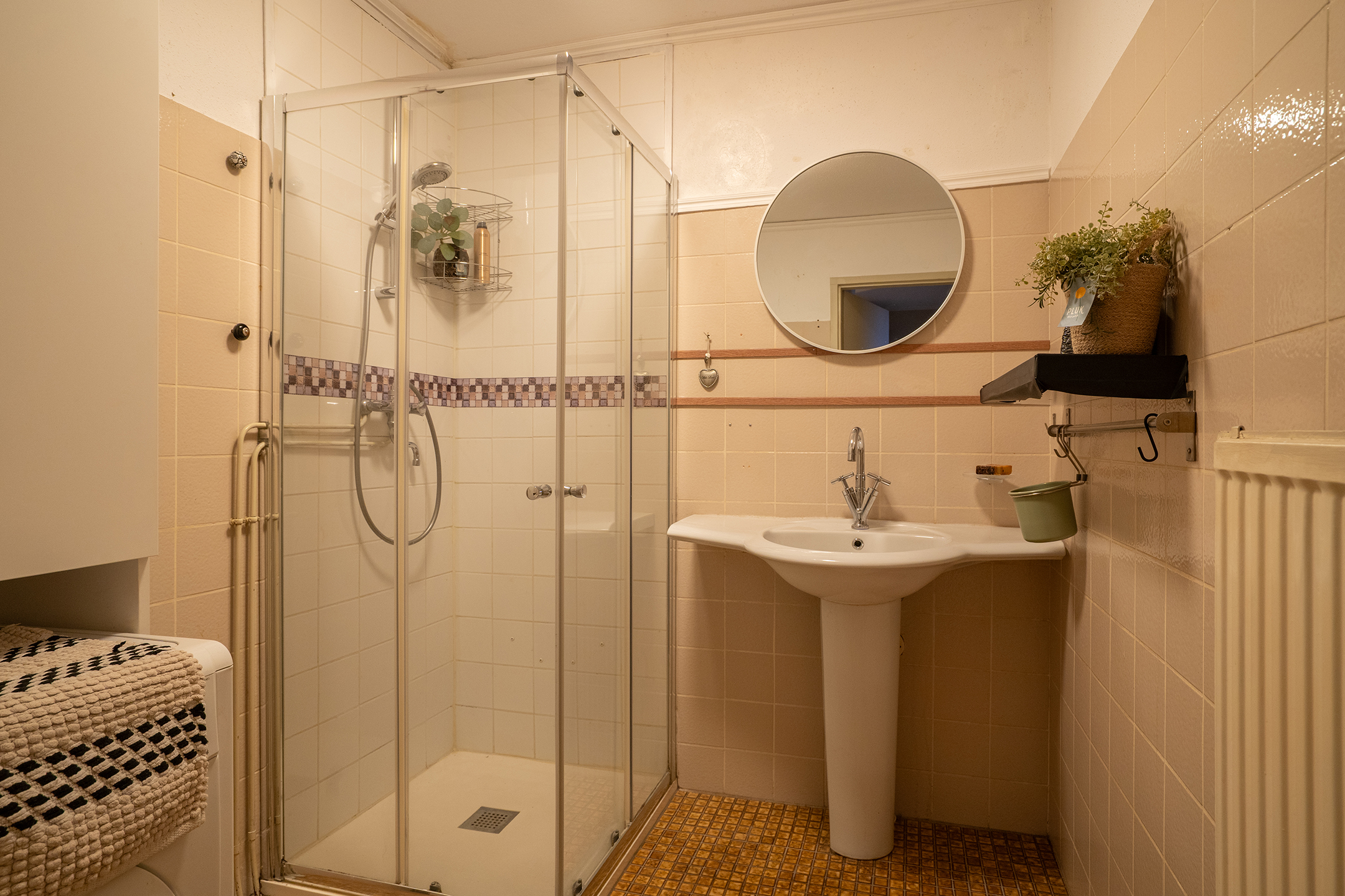 Vanuit de woonkamer is een gang bereikbaar waar zich het separate toilet en de badkamer bevinden. De badkamer is grotendeels betegeld en voorzien van een wastafelmeubel, douche, radiator en aansluiting voor de wasmachine.