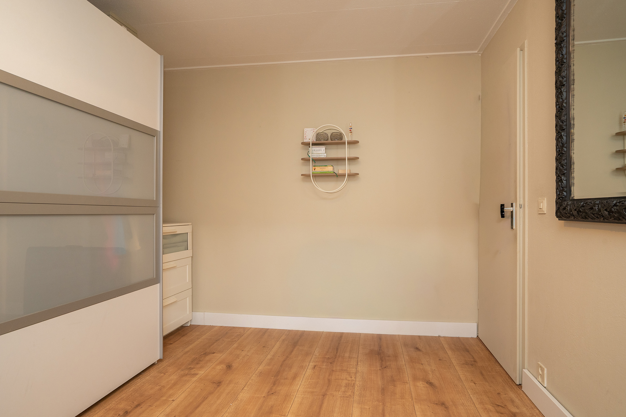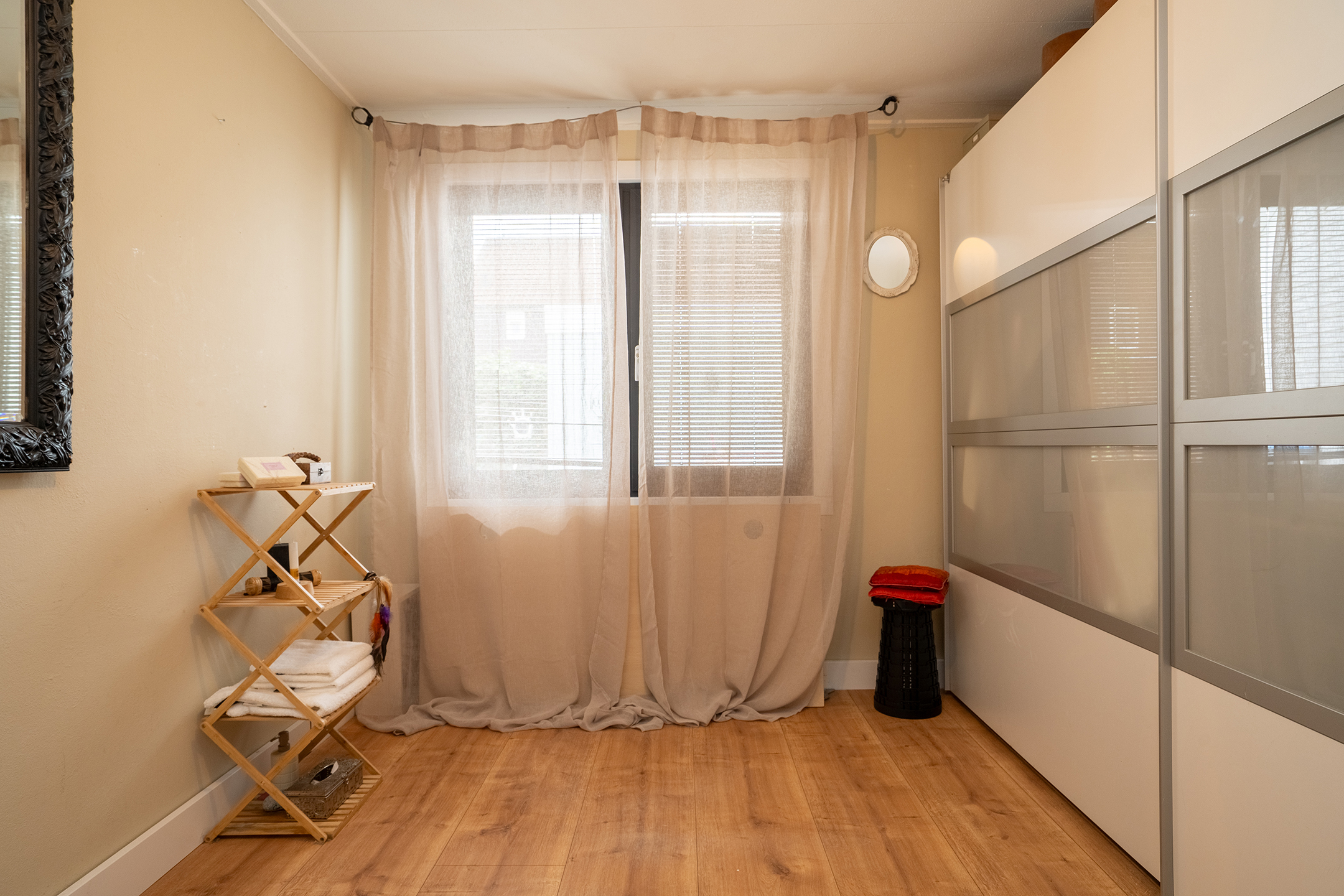 Aan de achterzijde ligt een ruime kamer die momenteel is ingericht als kledingkamer, maar die zich ook uitstekend leent als werkkamer, hobbyruimte of slaapkamer. De ruimte ligt aangenaam aan de achterzijde van de woning, grenzend aan de eethoek en met uitzicht op de tuin.