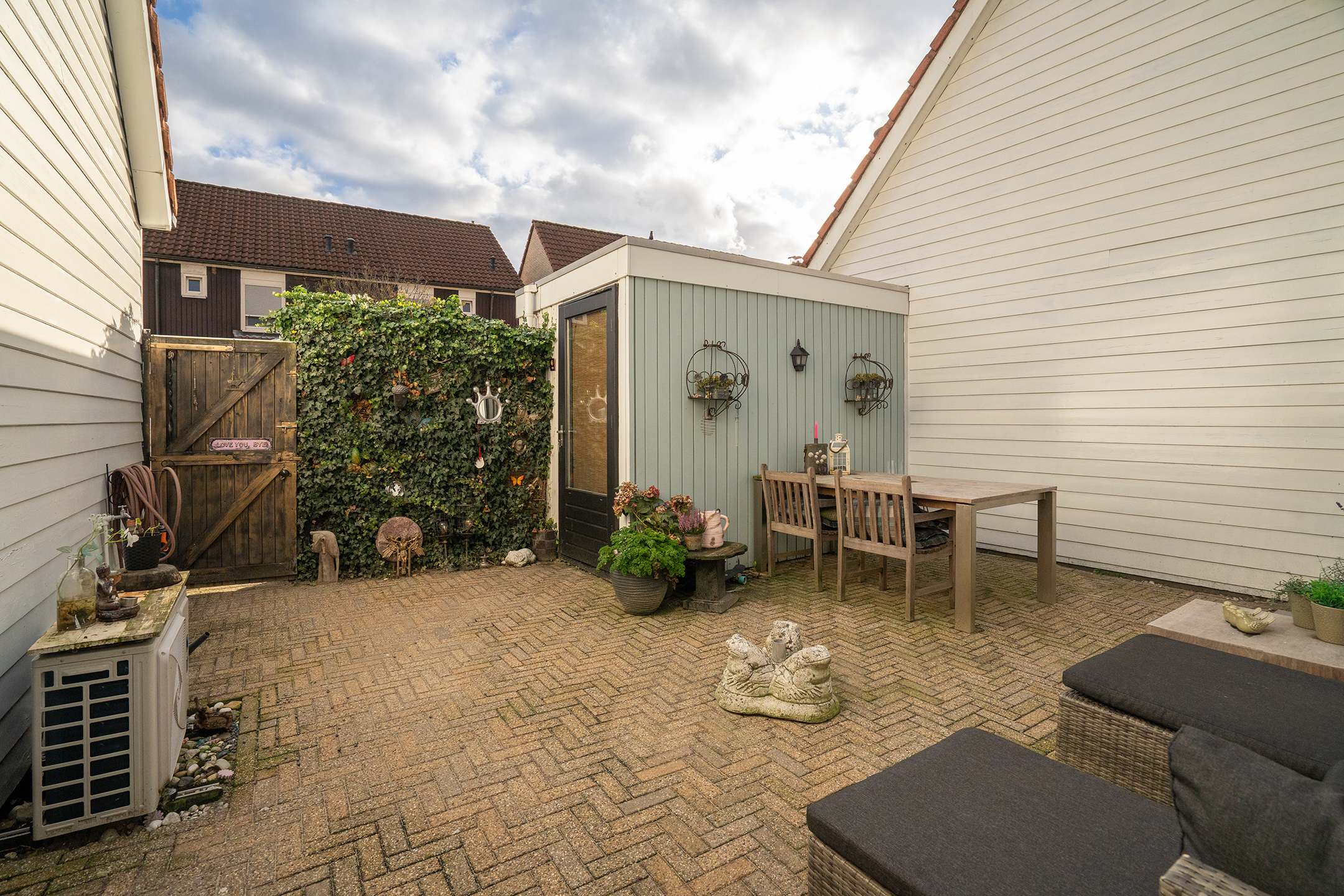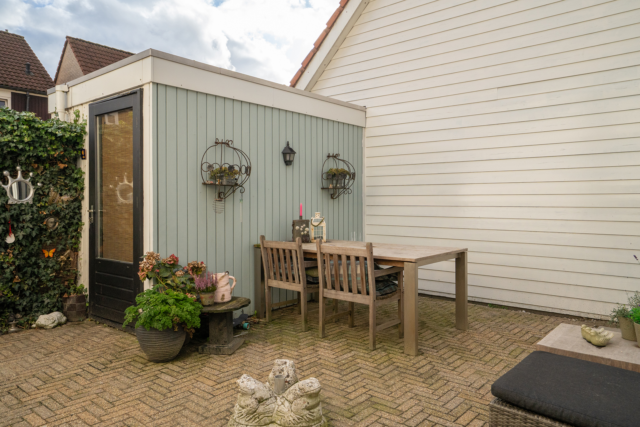 Achter in de tuin staat een nette berging, ideaal voor fietsen, tuingereedschap of extra opslagruimte.