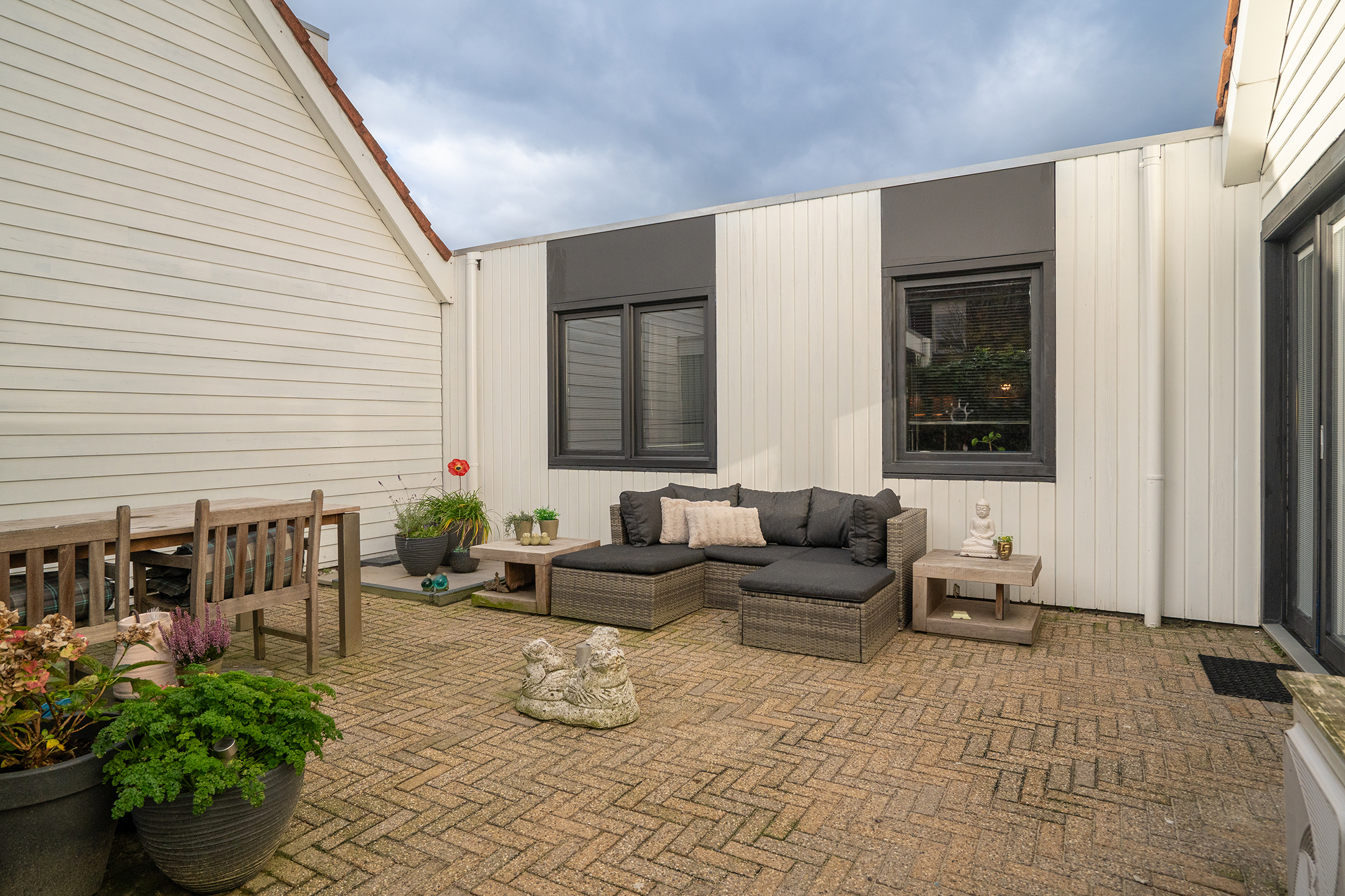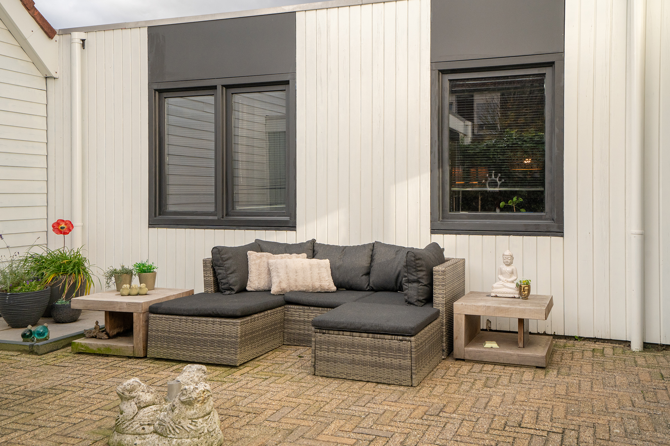 Er is ruimte voor zowel een gezellige loungehoek als een eettafel. De tuin is volledig omsloten, wat veel privacy en een geborgen gevoel geeft.
