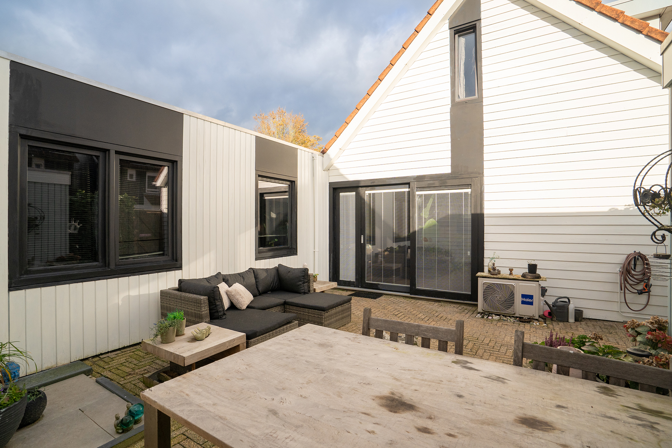 Tuin: Via de schuifpui in de woonkamer stap je direct de achtertuin in. De tuin is volledig bestraat en daardoor onderhoudsvriendelijk, maar met ruimte genoeg voor groenaccenten in potten of bakken.