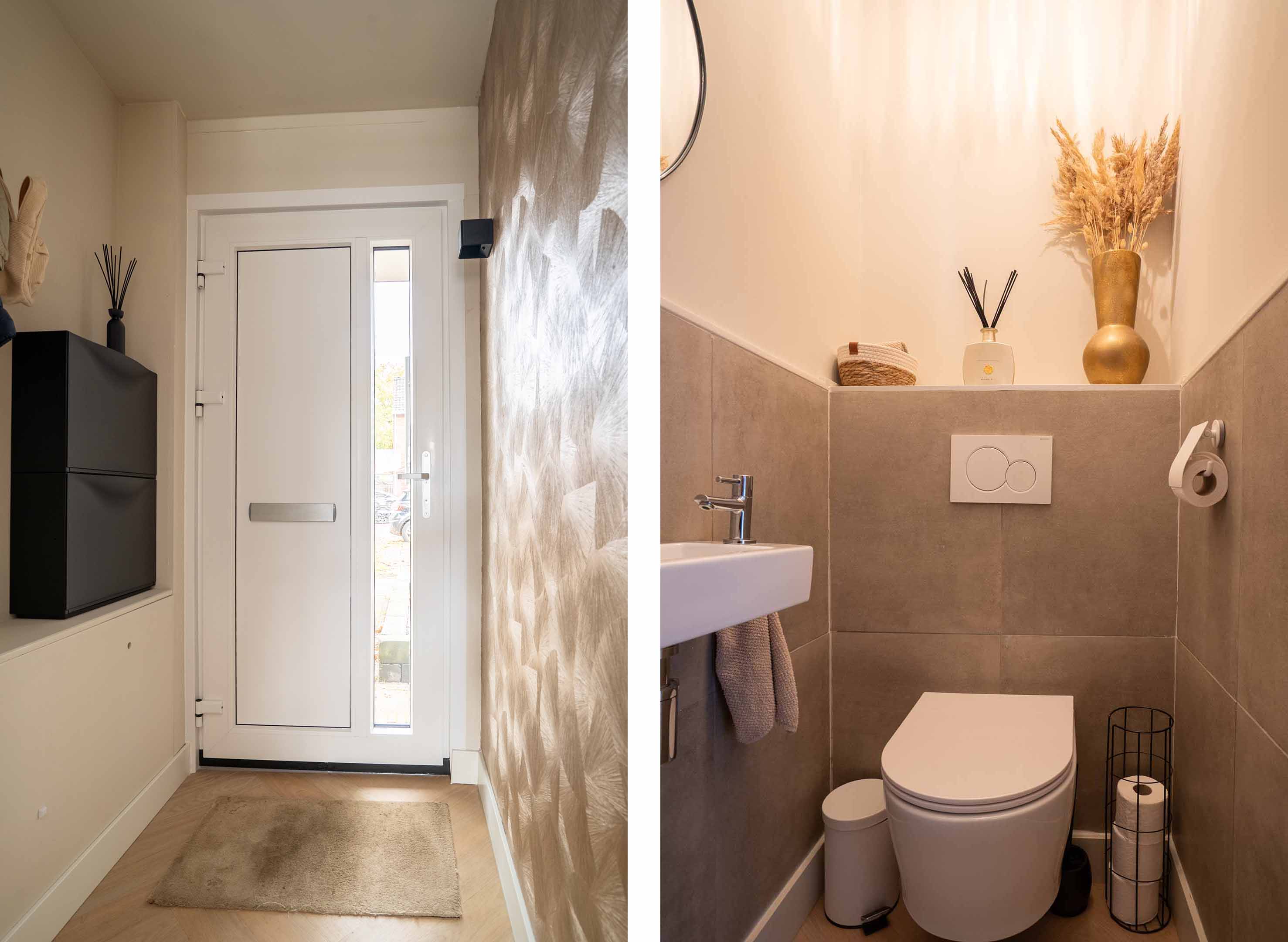 Centraal in de woning bevindt zich een tussenhal met trapopgang naar de eerste verdieping en een modern toilet, dat stijlvol is uitgevoerd en netjes is afgewerkt. Het toilet is deels betegeld met prachtige beige wandtegels, voorzien van een visgraatvloer en uitgerust met een hangcloset en een fonteintje met kraan. Samen met de warme tinten en sfeervolle details vormt dit een harmonieus geheel dat perfect aansluit bij de rest van de woning.