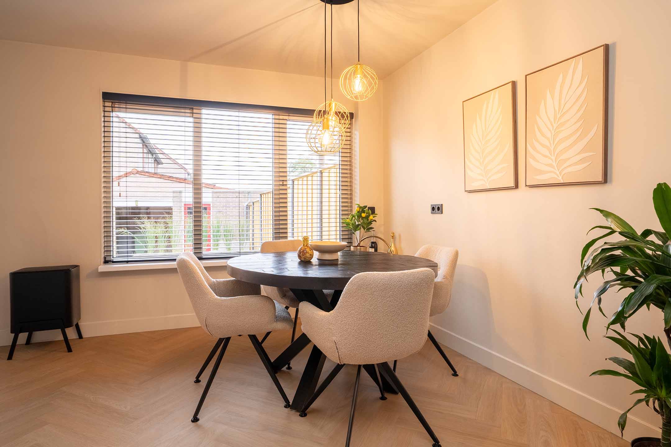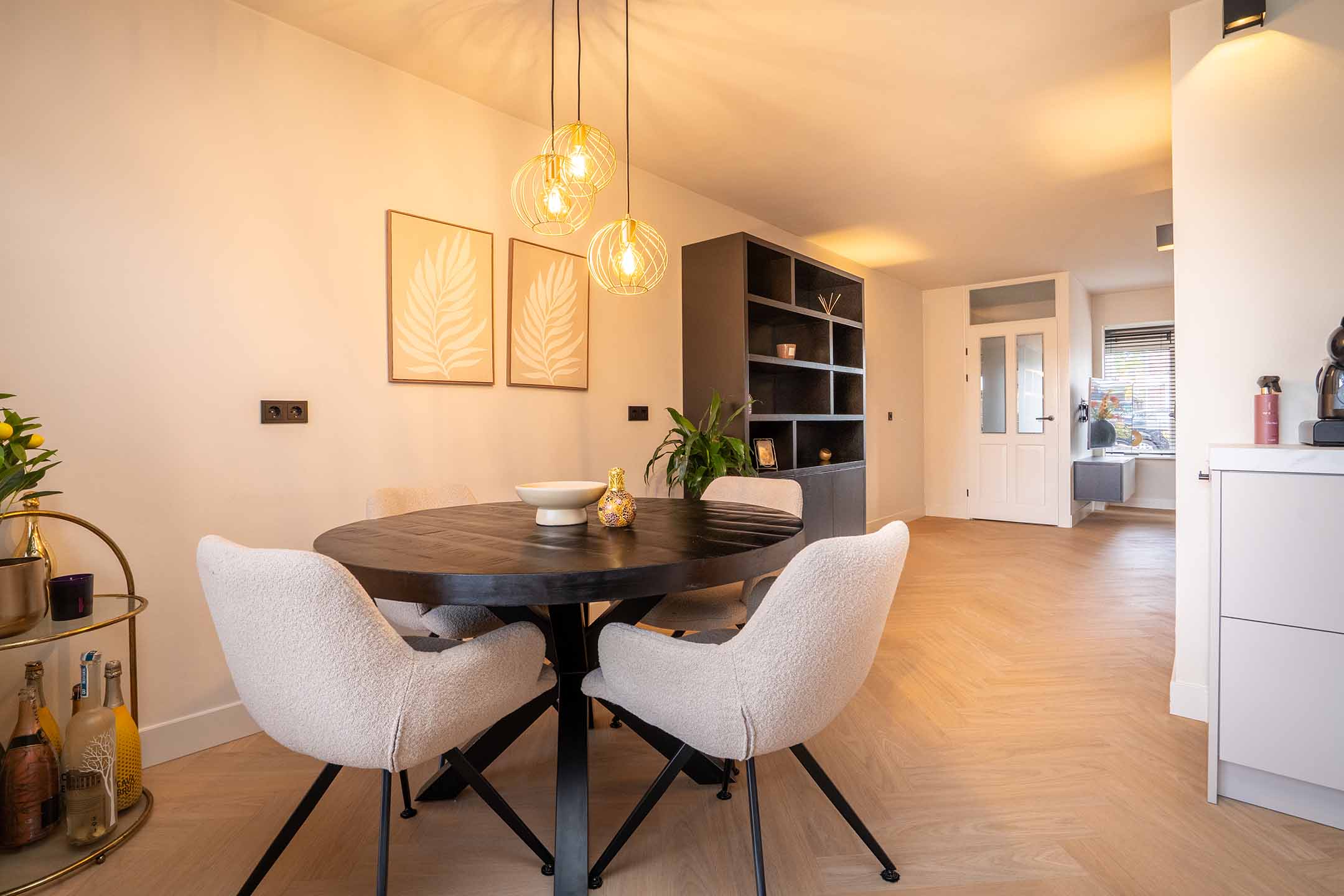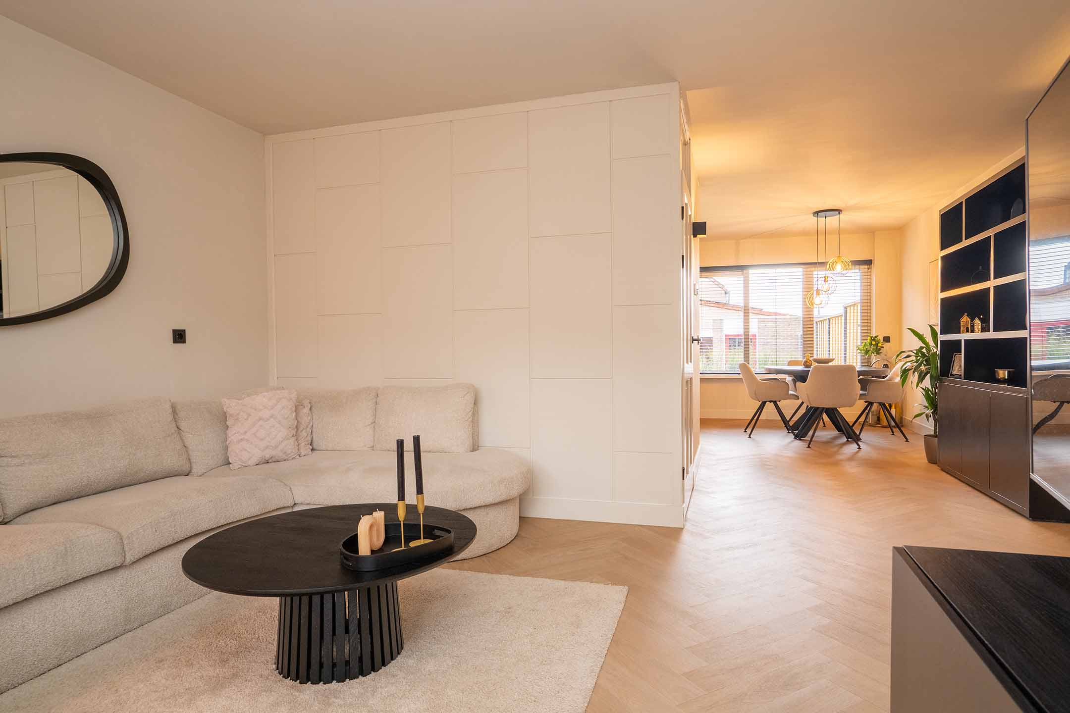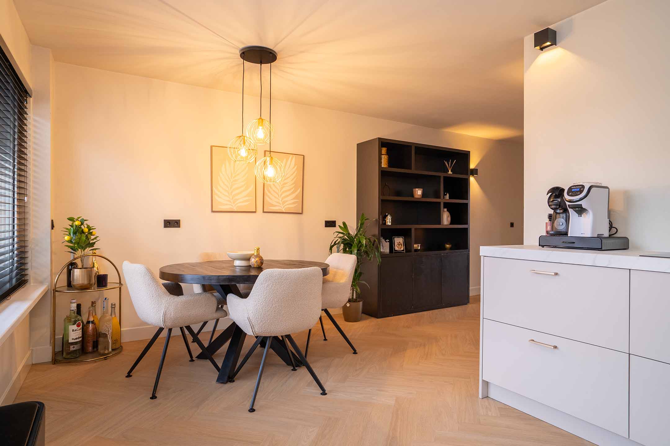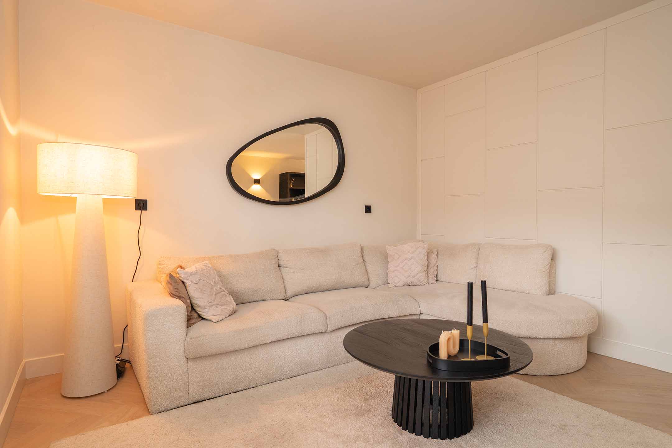 De inrichting is strak en warm, met neutrale tinten en zwarte accenten die zorgen voor een moderne uitstraling.