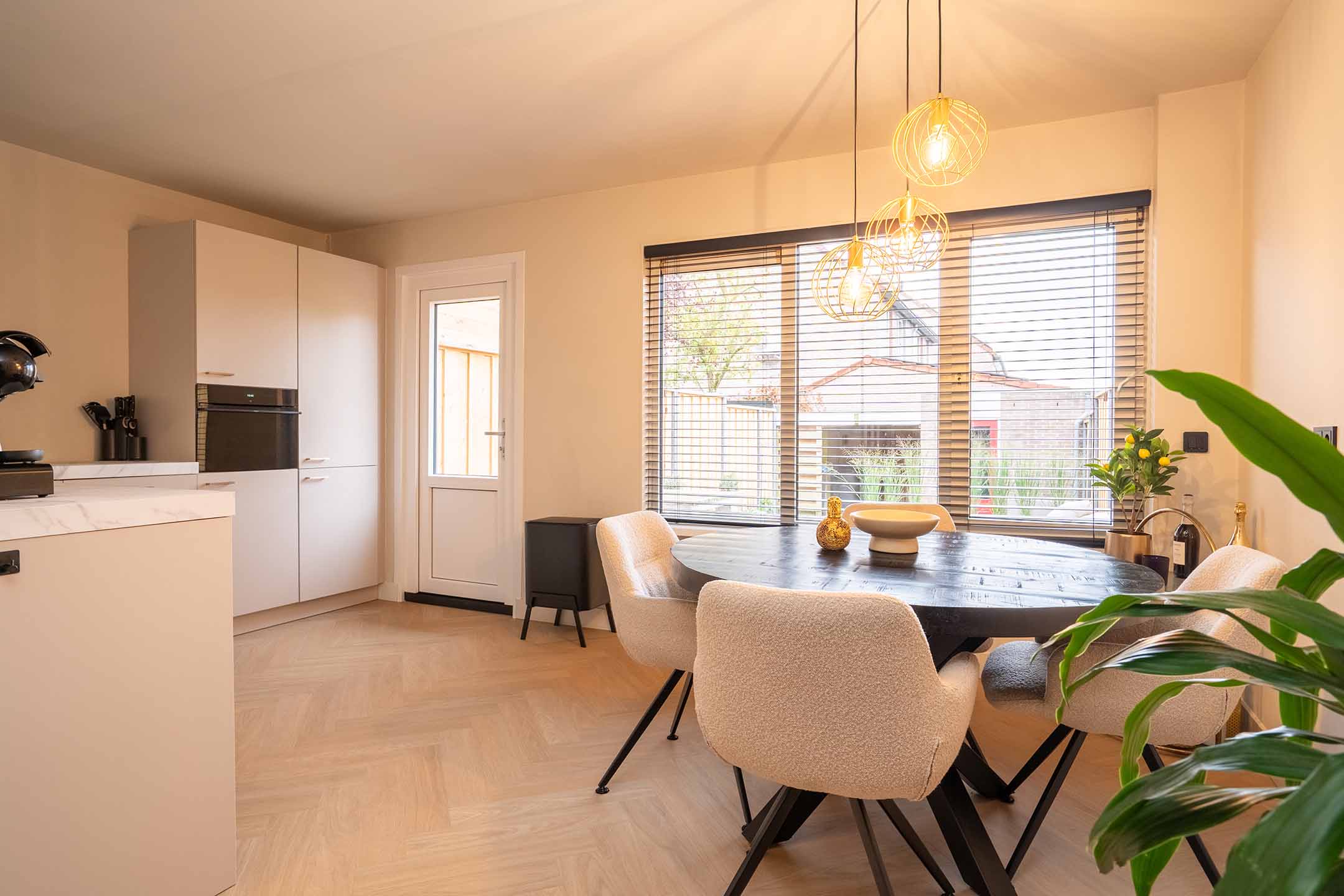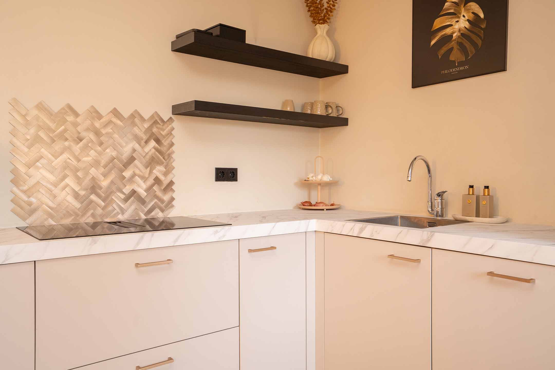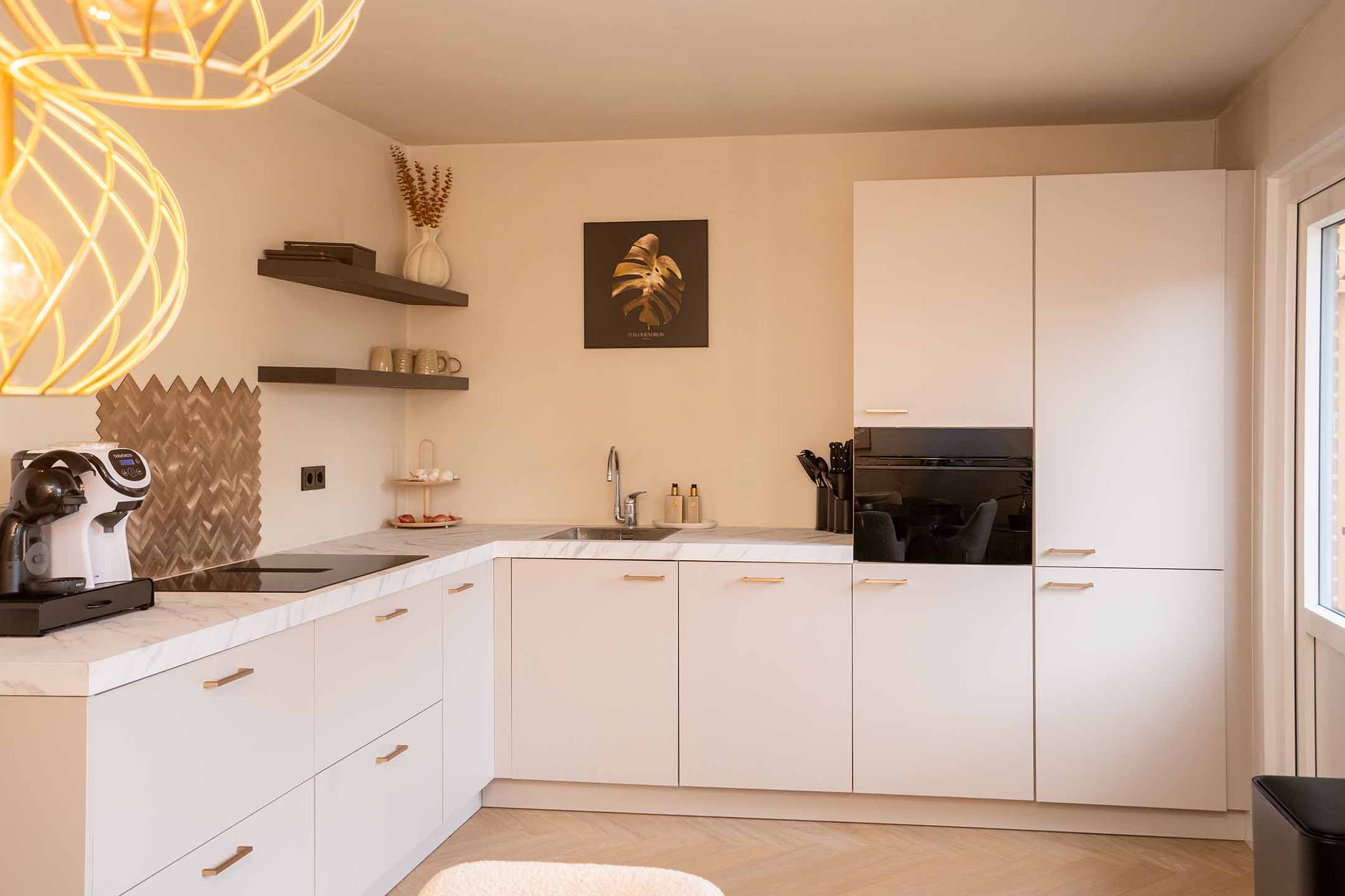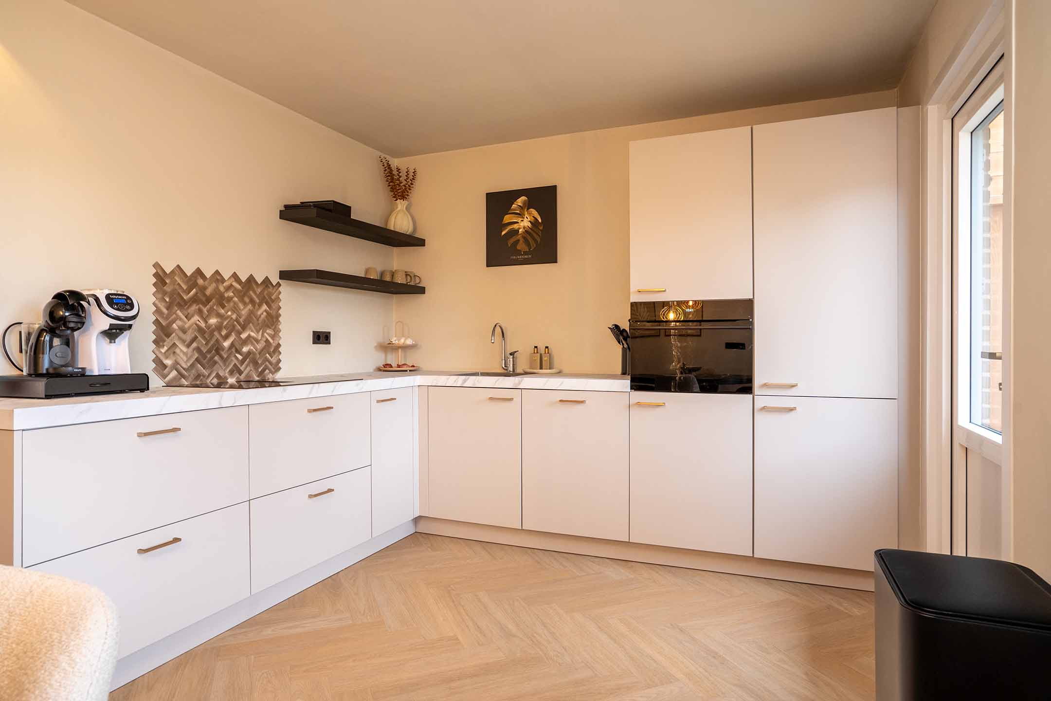 Aan de achterzijde bevindt zich de prachtige open keuken, uitgevoerd in een lichte kleurstelling en voorzien van diverse inbouwapparatuur, waaronder een inductiekookplaat met geïntegreerde afzuiging, vaatwasser, combi-oven en koelkast. De keuken straalt rust en luxe uit, mede dankzij het marmerlook werkblad, goudkleurige grepen en de stijlvolle open schappen aan de wand. Vanuit de keuken is er via de kunststof achterdeur direct toegang tot de tuin.