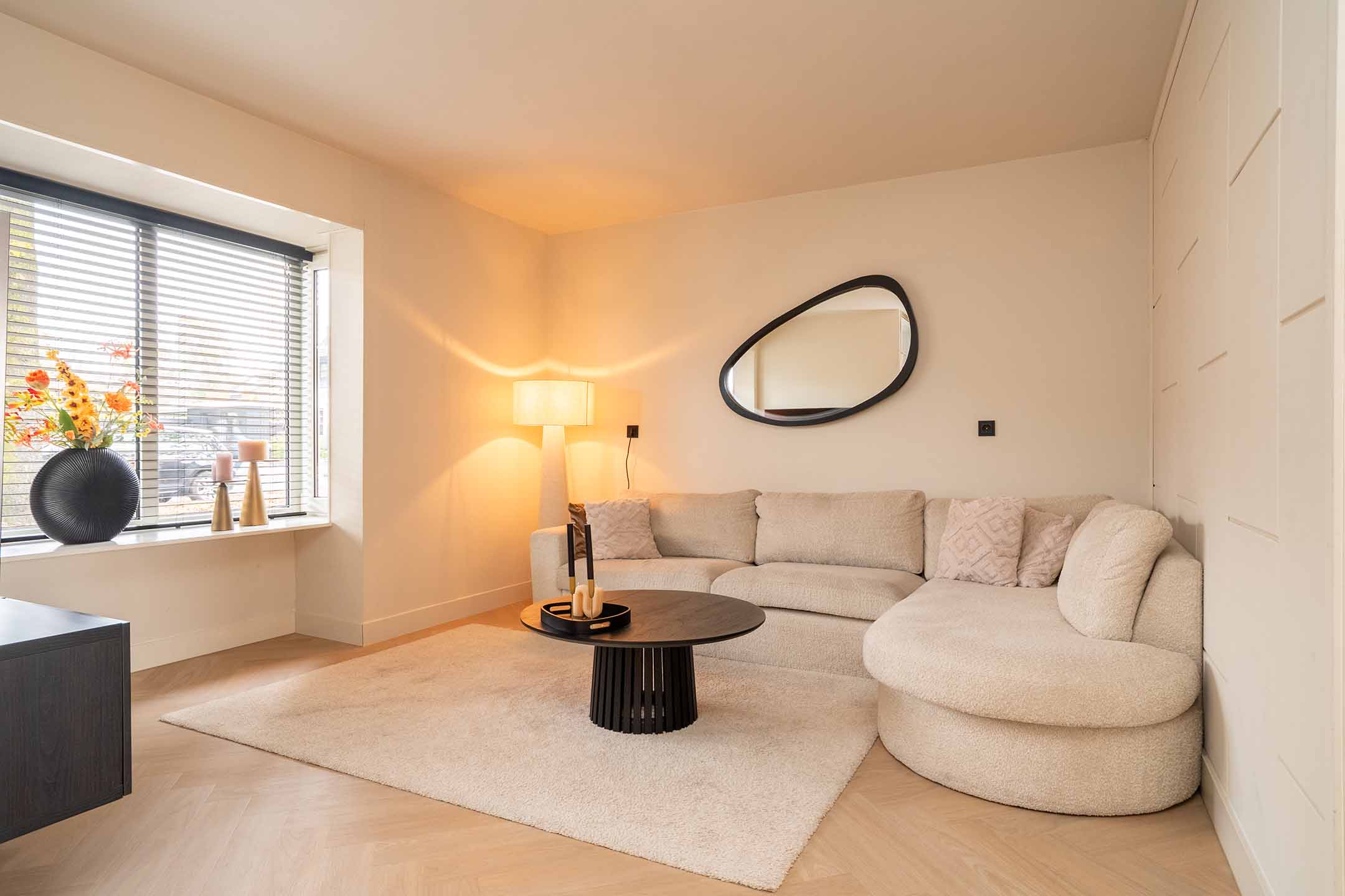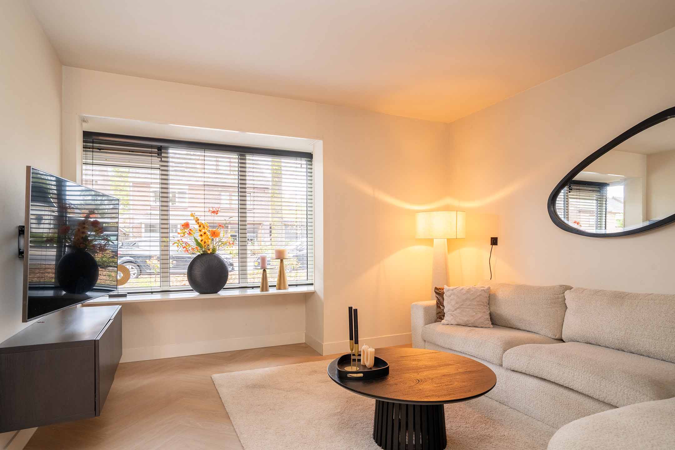 De ruime woonkamer, gelegen aan de voorzijde van de woning, is licht en eigentijds met grote raampartijen.