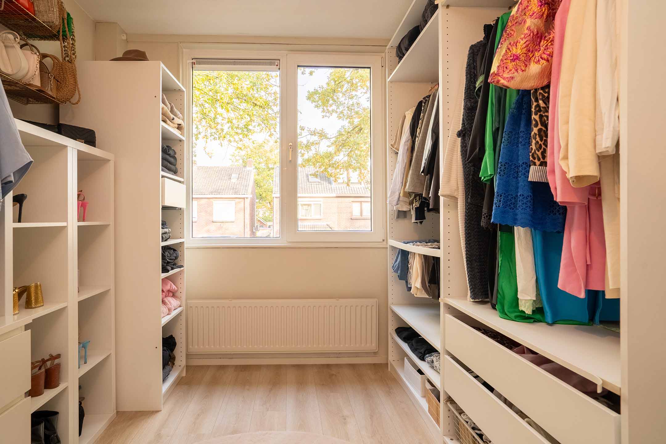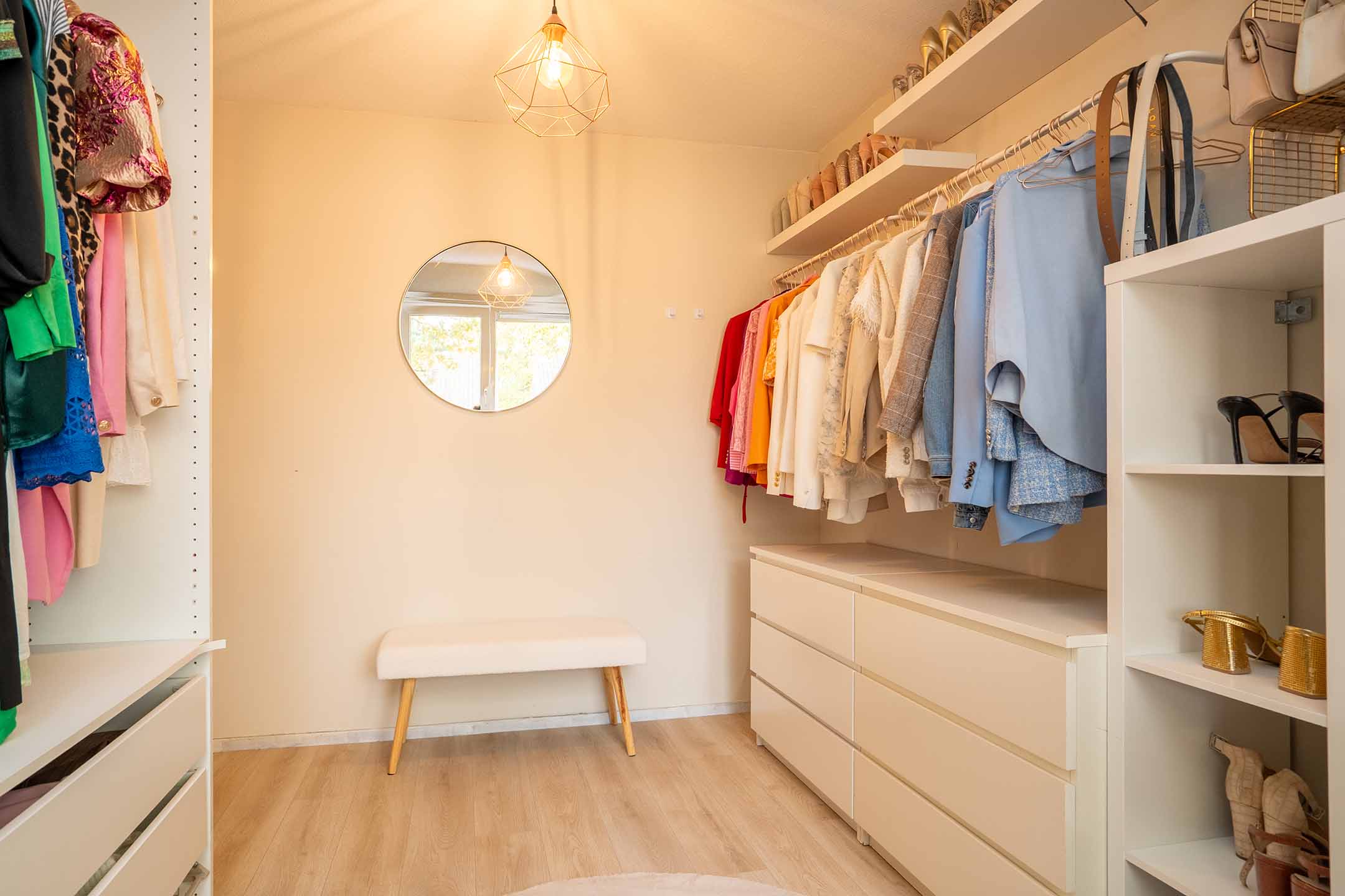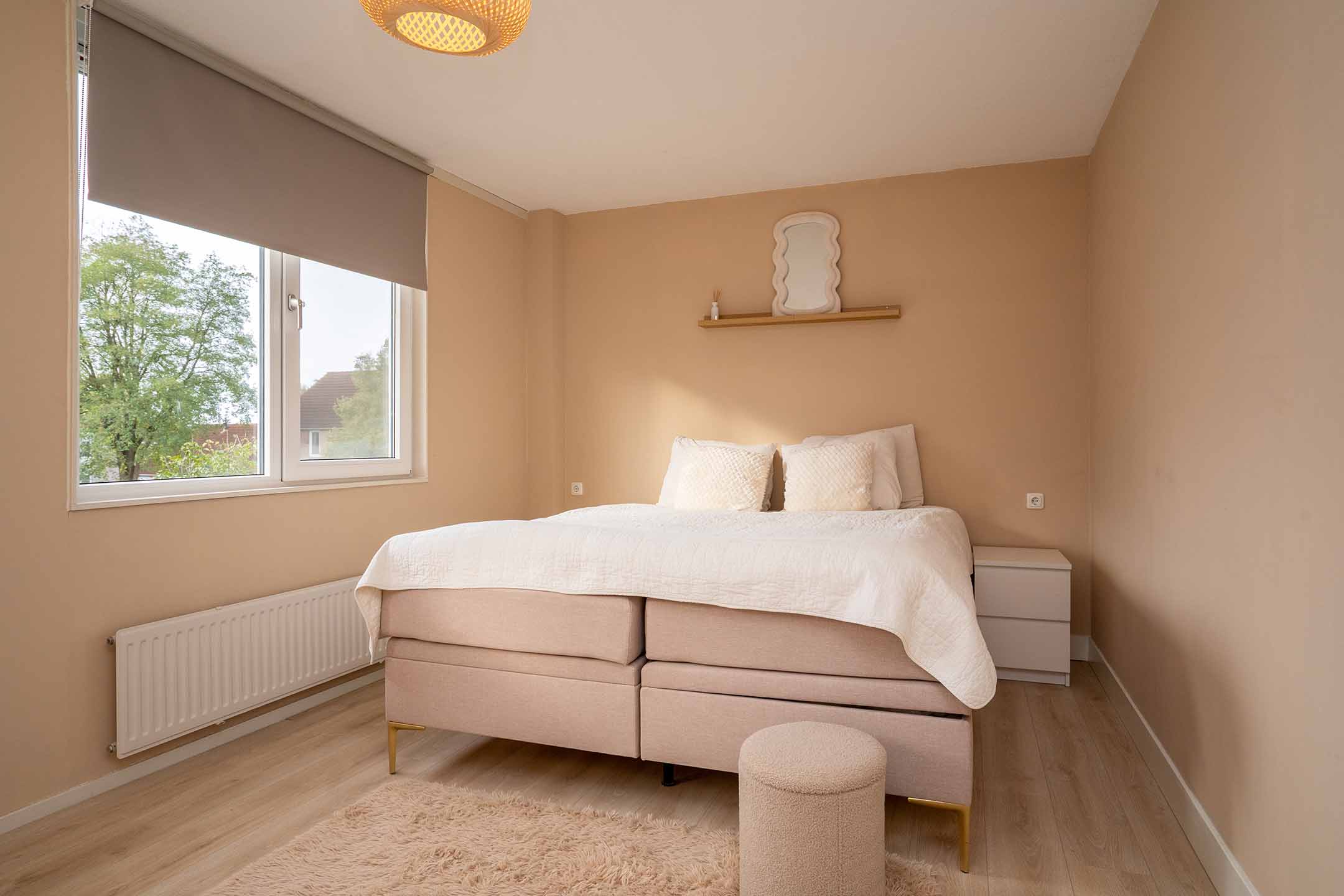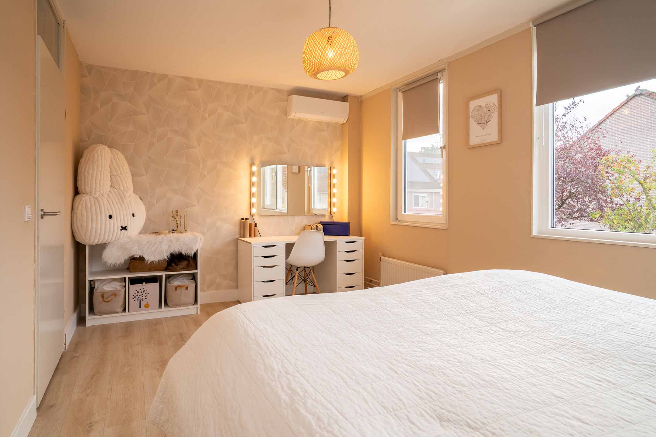 De grootste slaapkamer, gelegen aan de achterzijde van de woning, beslaat de volledige breedte en is voorzien van airconditioning. Daarnaast bevindt zich op deze verdieping nog een praktische bergkast, ideaal voor het opbergen van linnengoed of andere spullen.