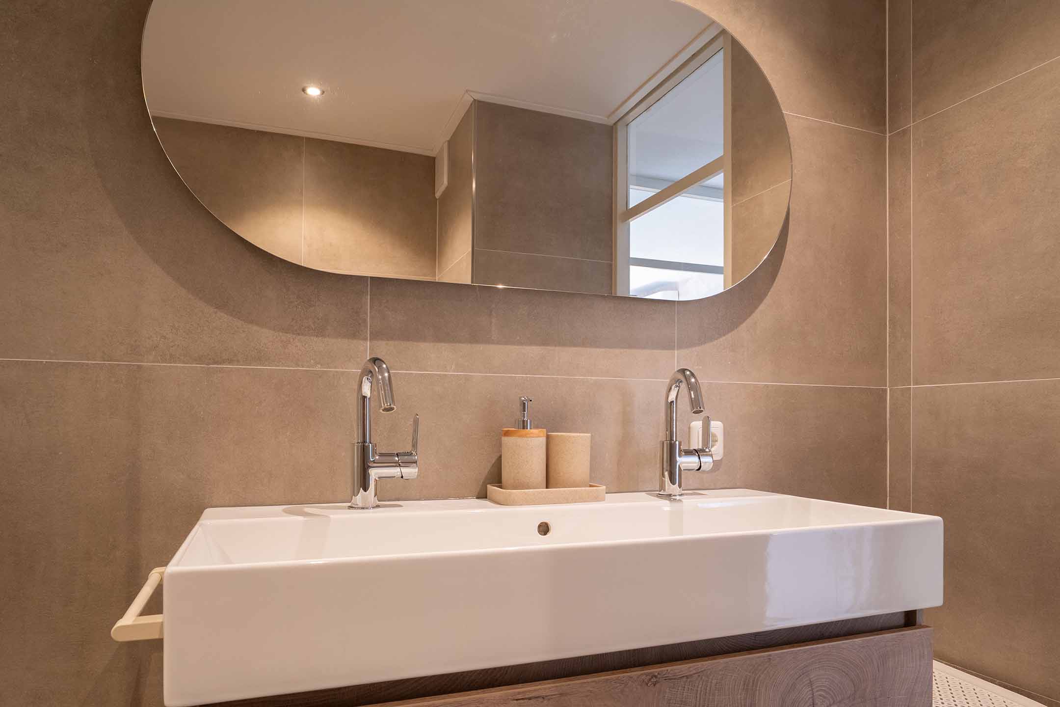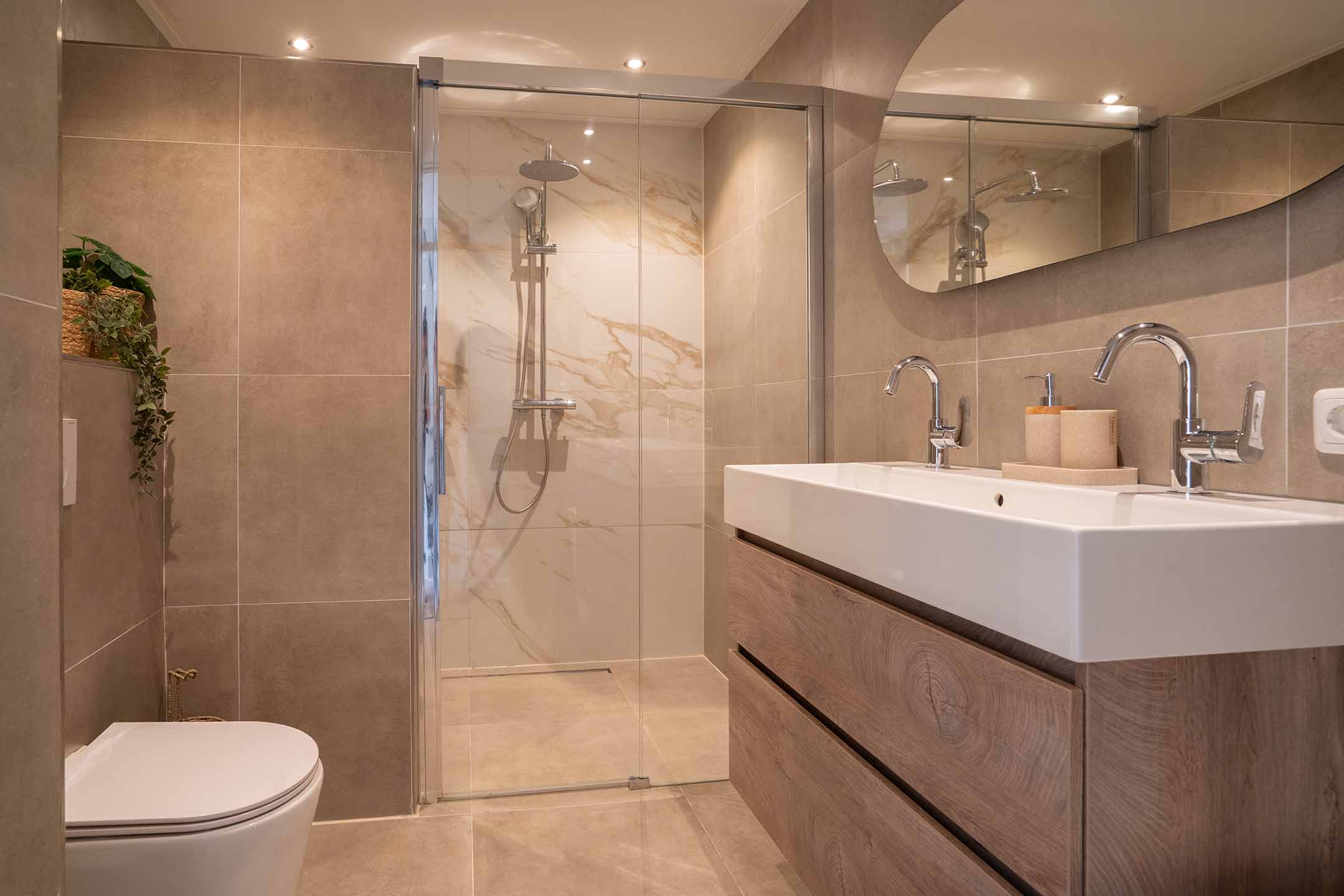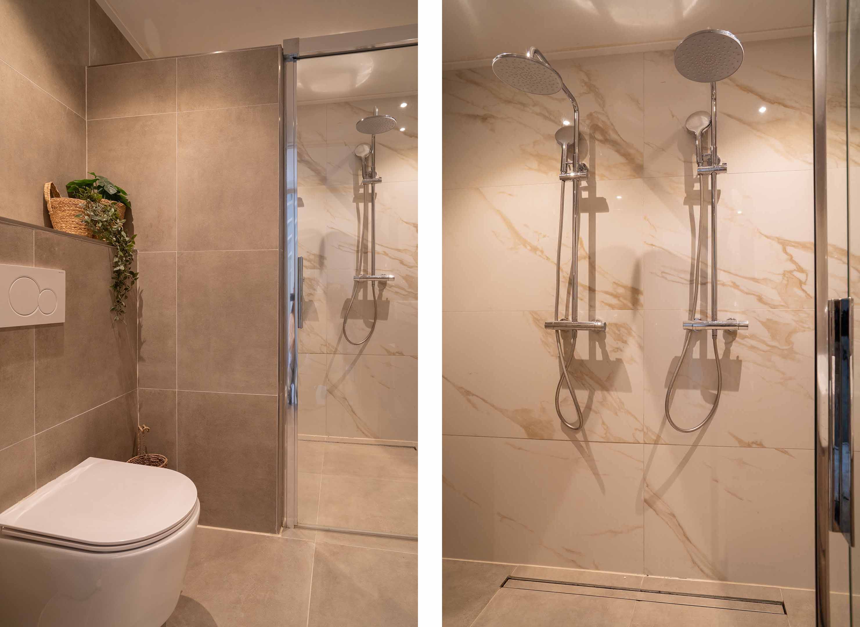 De in 2023 volledig vernieuwde badkamer is prachtig en modern en straalt luxe en comfort uit. De ruimte is praktisch ingedeeld en geheel betegeld en is uitgerust met een inloopdouche met dubbele regendouche en handdouche, een stijlvol wastafelmeubel met dubbele kraan, twee lades, een spiegel en een hangcloset.