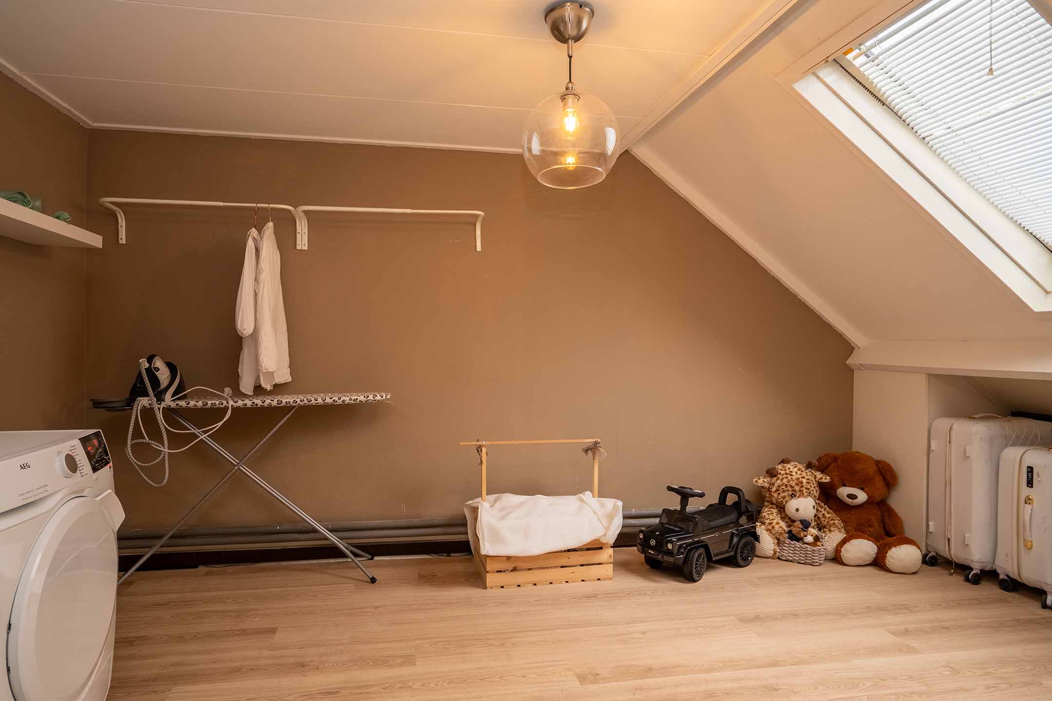 2e verdieping: Via een vaste trap bereik je de zolderverdieping. Deze verdieping biedt volop mogelijkheden en is keurig afgewerkt. Hier bevinden zich de aansluitingen voor de wasmachine en droger, evenals de cv-ketel.