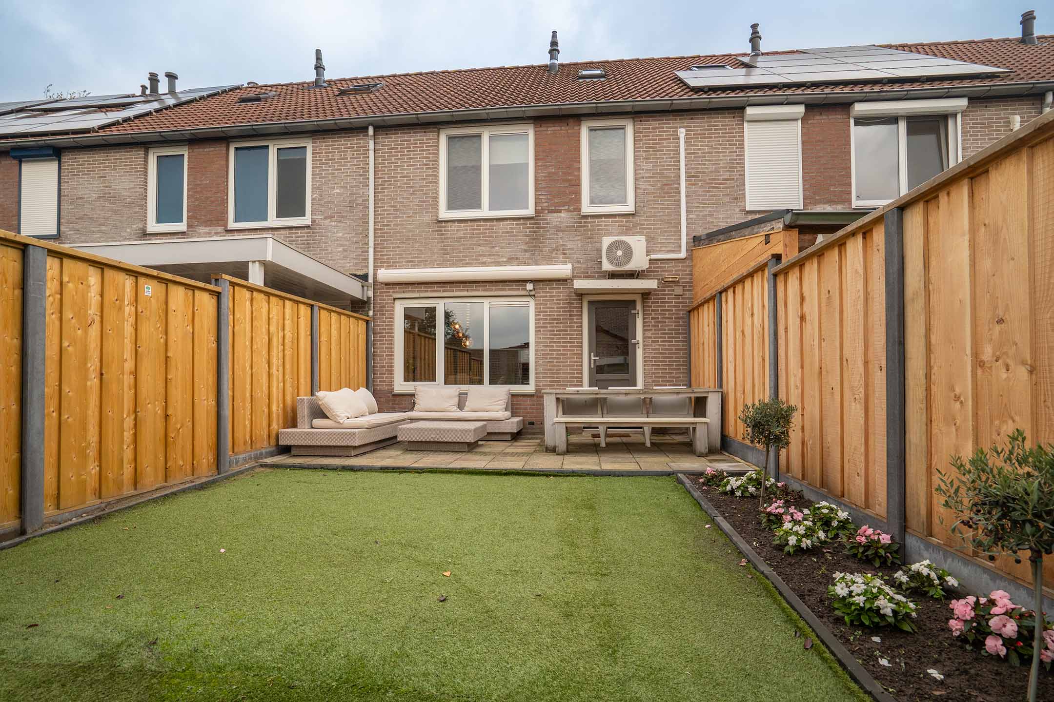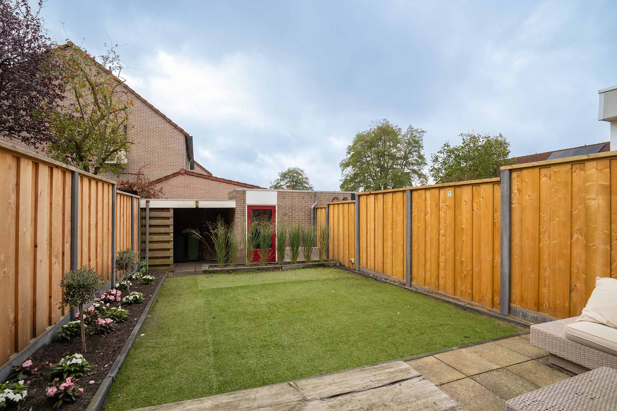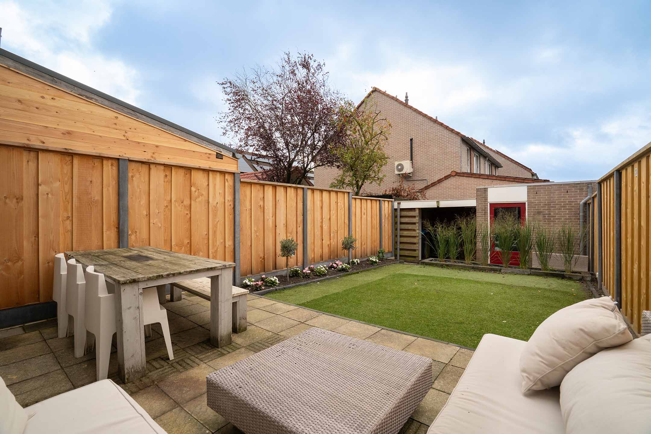 Tuin: De achtertuin is grotendeels opnieuw en onderhoudsvriendelijk aangelegd, met een combinatie van bestrating, kunstgras en een strakke plantenborder. Achter in de tuin bevindt zich een stenen berging met overkapping, ideaal voor het stallen van fietsen of het opbergen van tuingereedschap. Via de achterom is de tuin tevens goed bereikbaar.