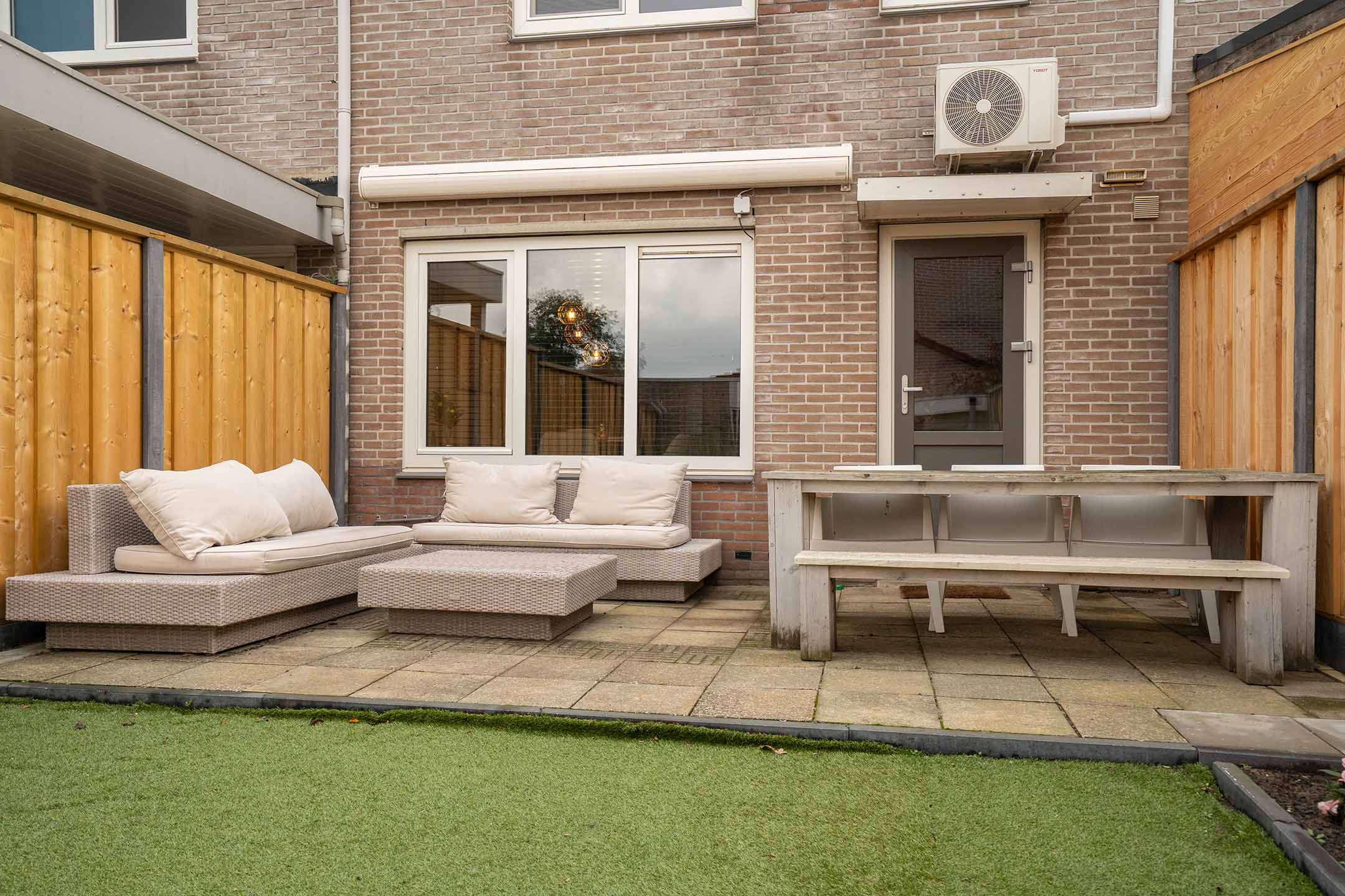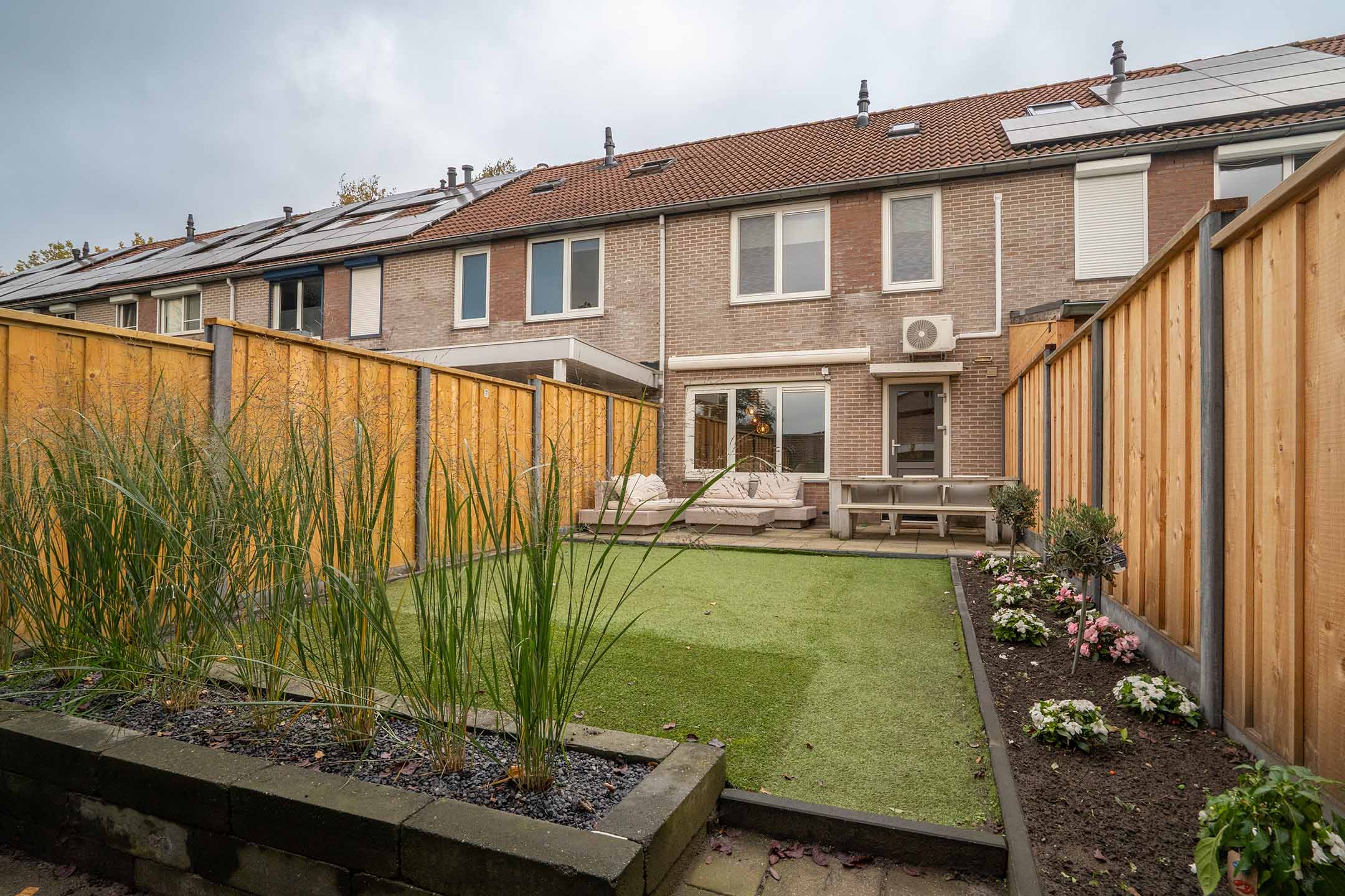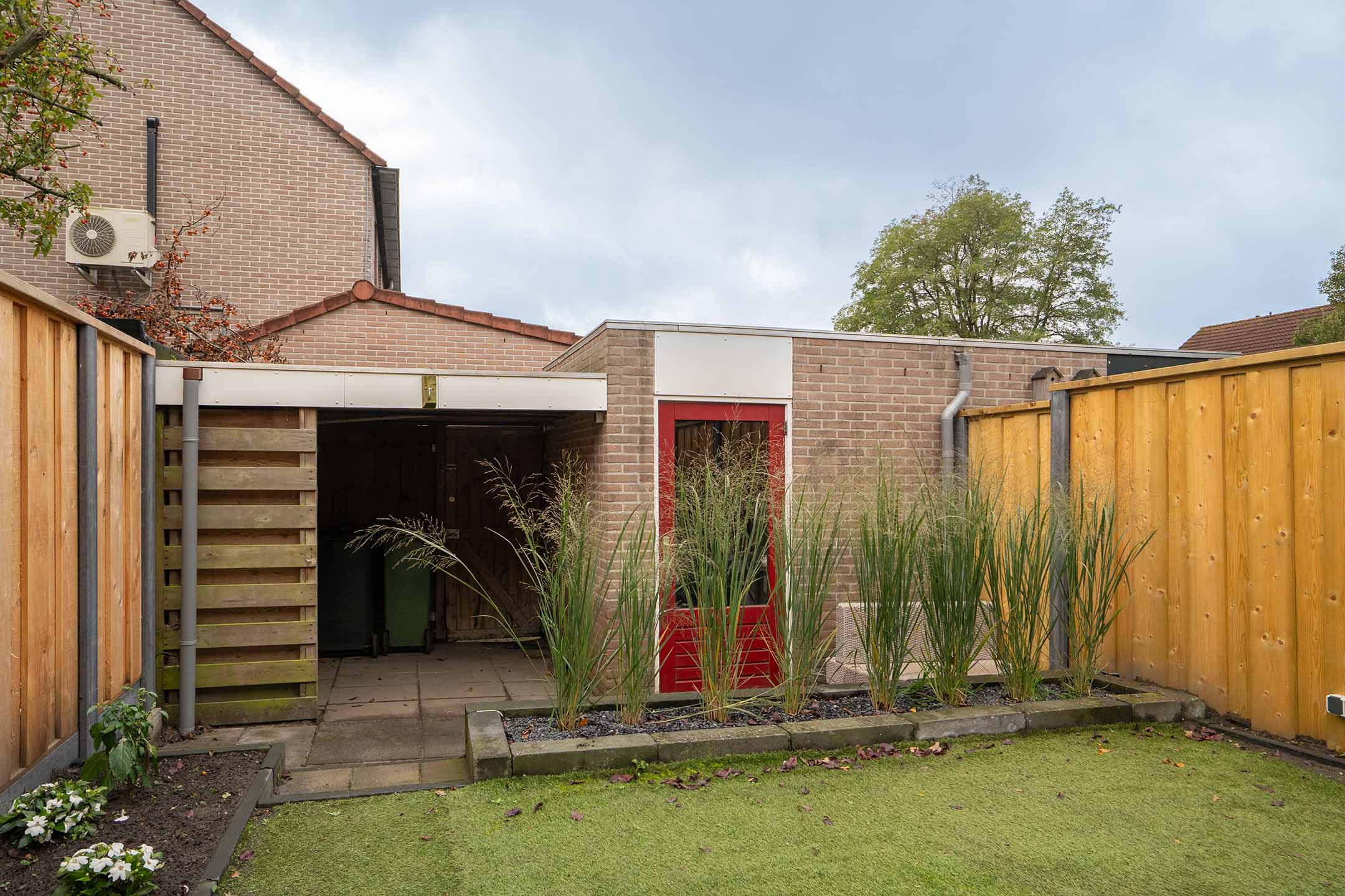 Tuin: De achtertuin is grotendeels opnieuw en onderhoudsvriendelijk aangelegd, met een combinatie van bestrating, kunstgras en een strakke plantenborder. Achter in de tuin bevindt zich een stenen berging met overkapping, ideaal voor het stallen van fietsen of het opbergen van tuingereedschap. Via de achterom is de tuin tevens goed bereikbaar.