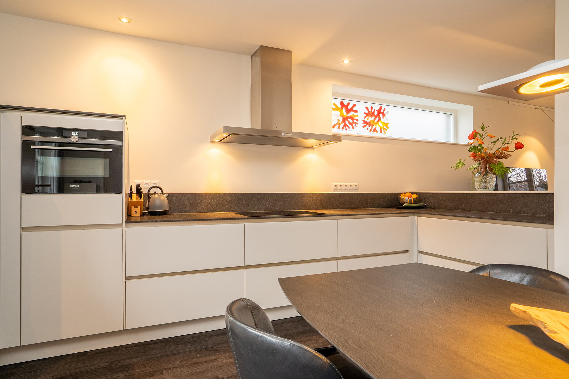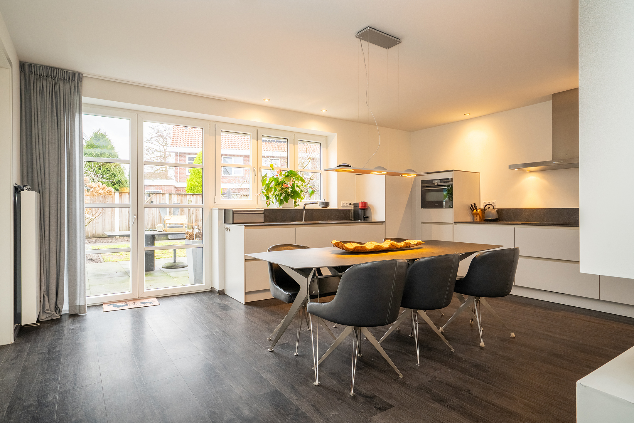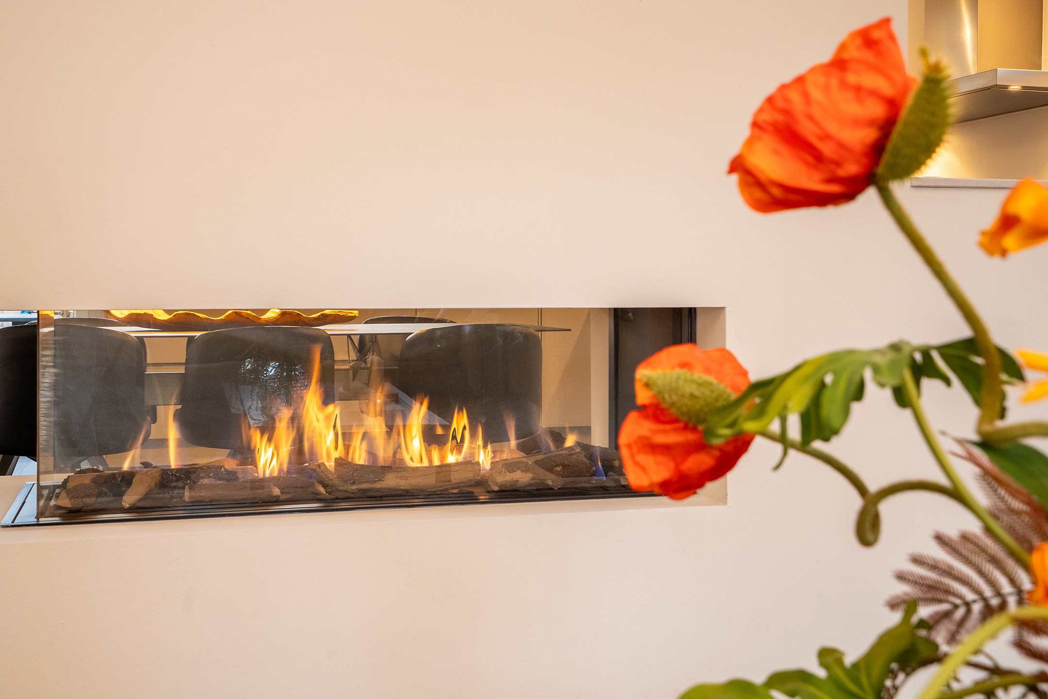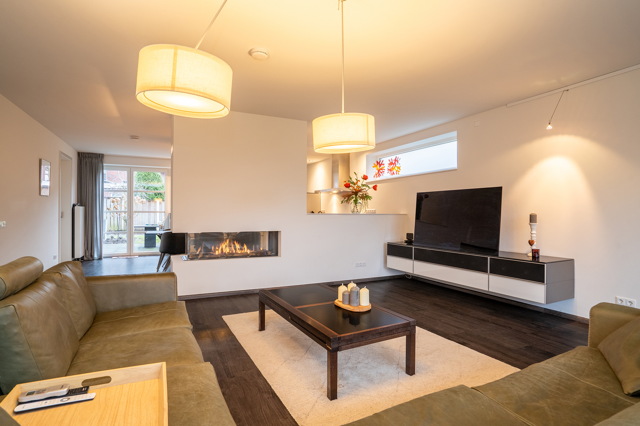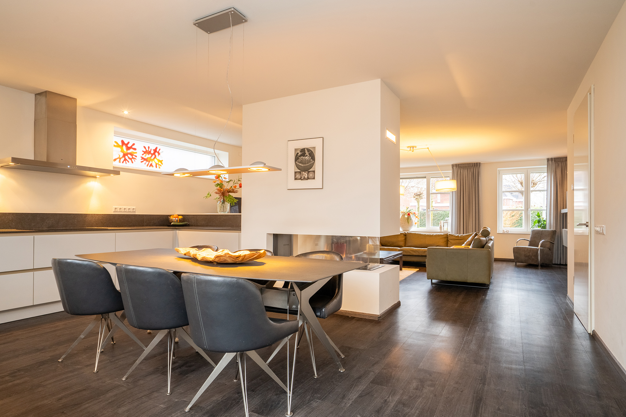 Bij binnenkomst ervaart u direct de ruimte en het prettige licht. De royale woonkamer is een heerlijke leefruimte met grote raampartijen en een open verbinding naar de keuken. Extra sfeer wordt gecreerd door de doorzichtige gashaard tussen keuken en woonkamer. De keuken is ruim opgezet, modern uitgevoerd en biedt volop werk- en bergruimte – ideaal voor zowel dagelijks gebruik als gezellige diners.