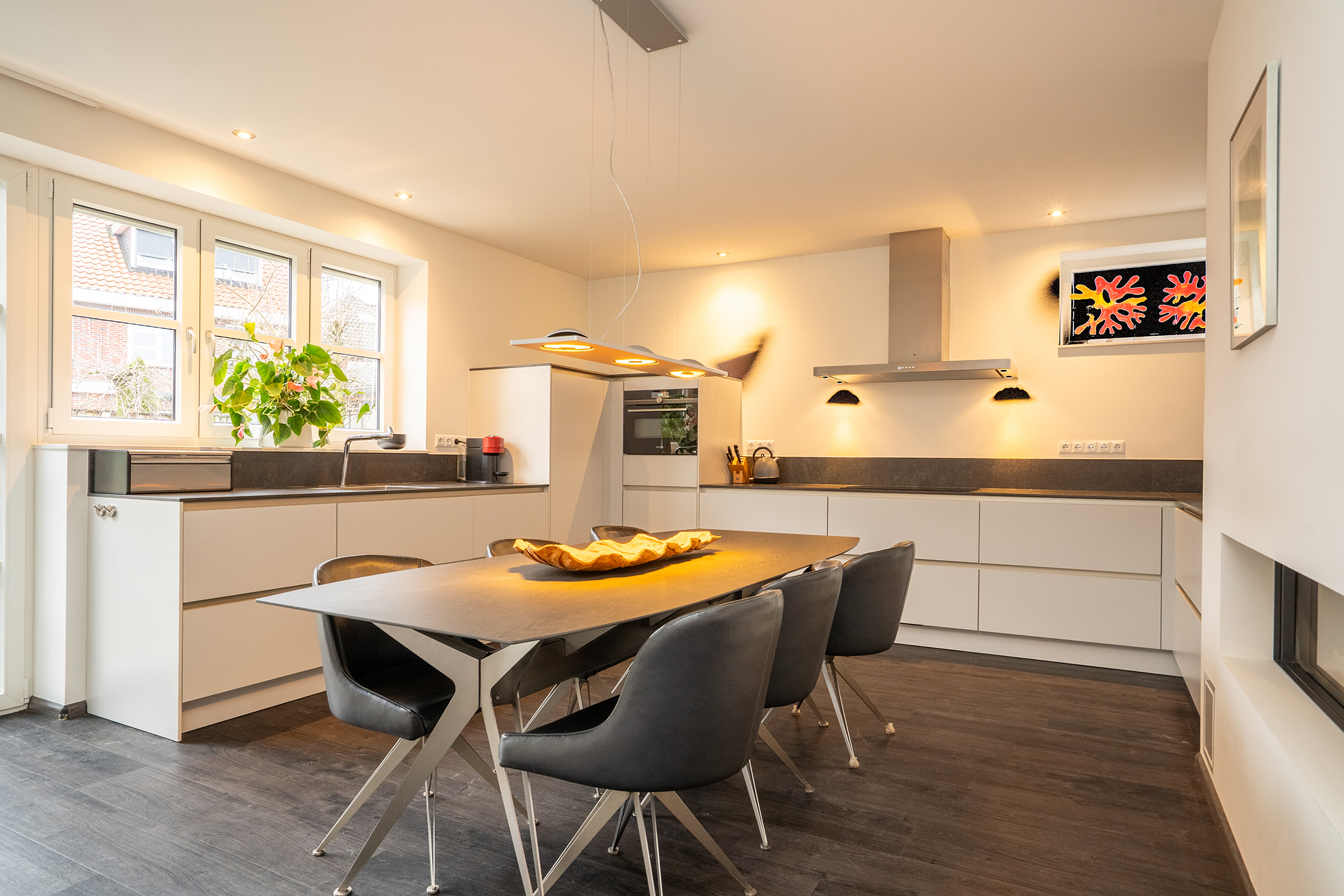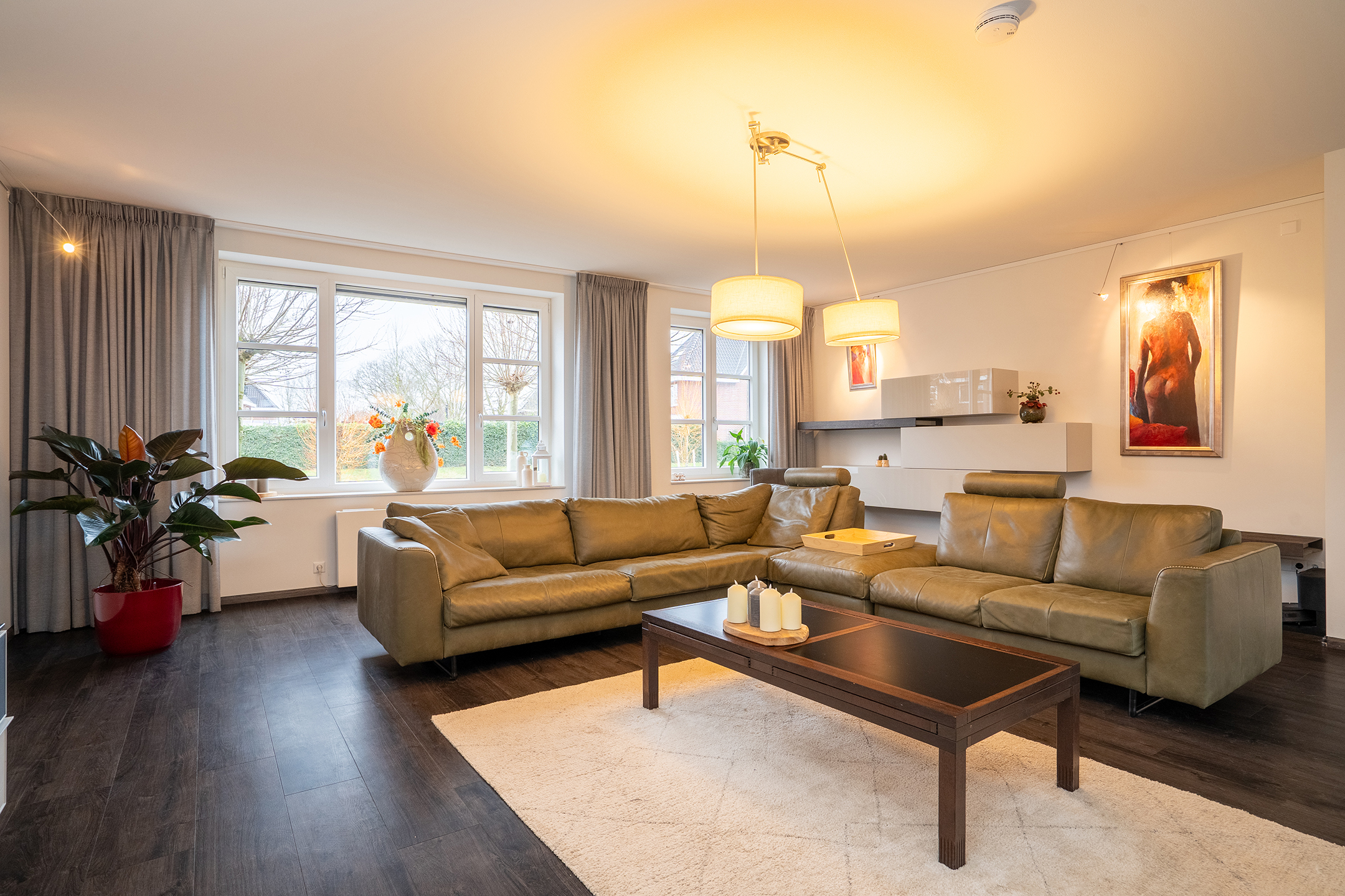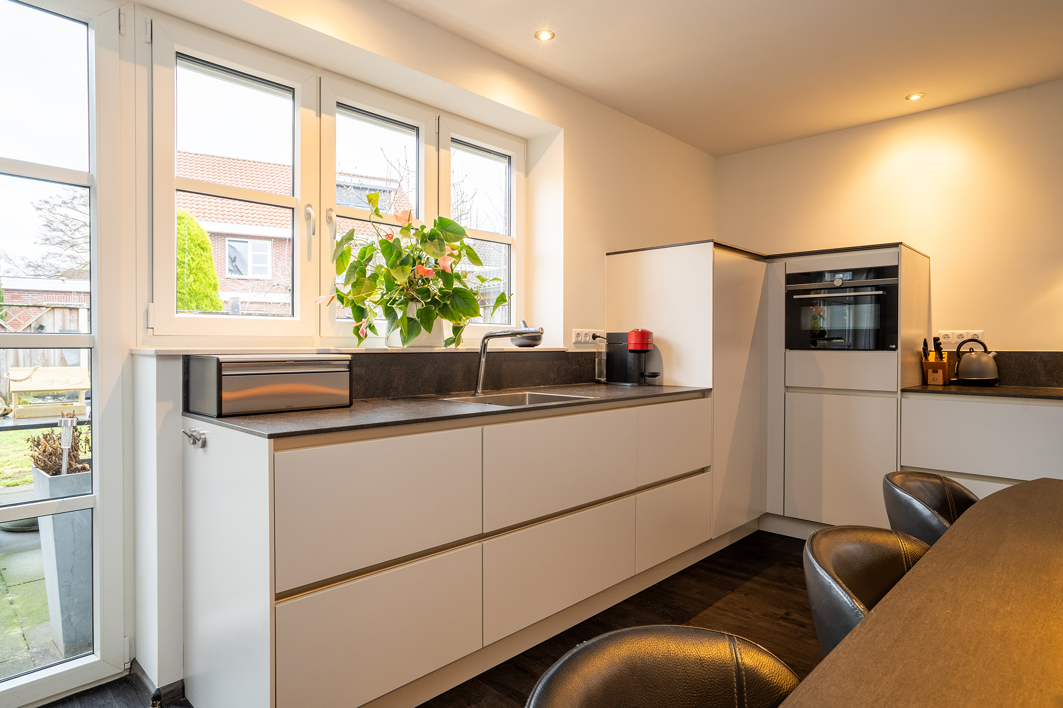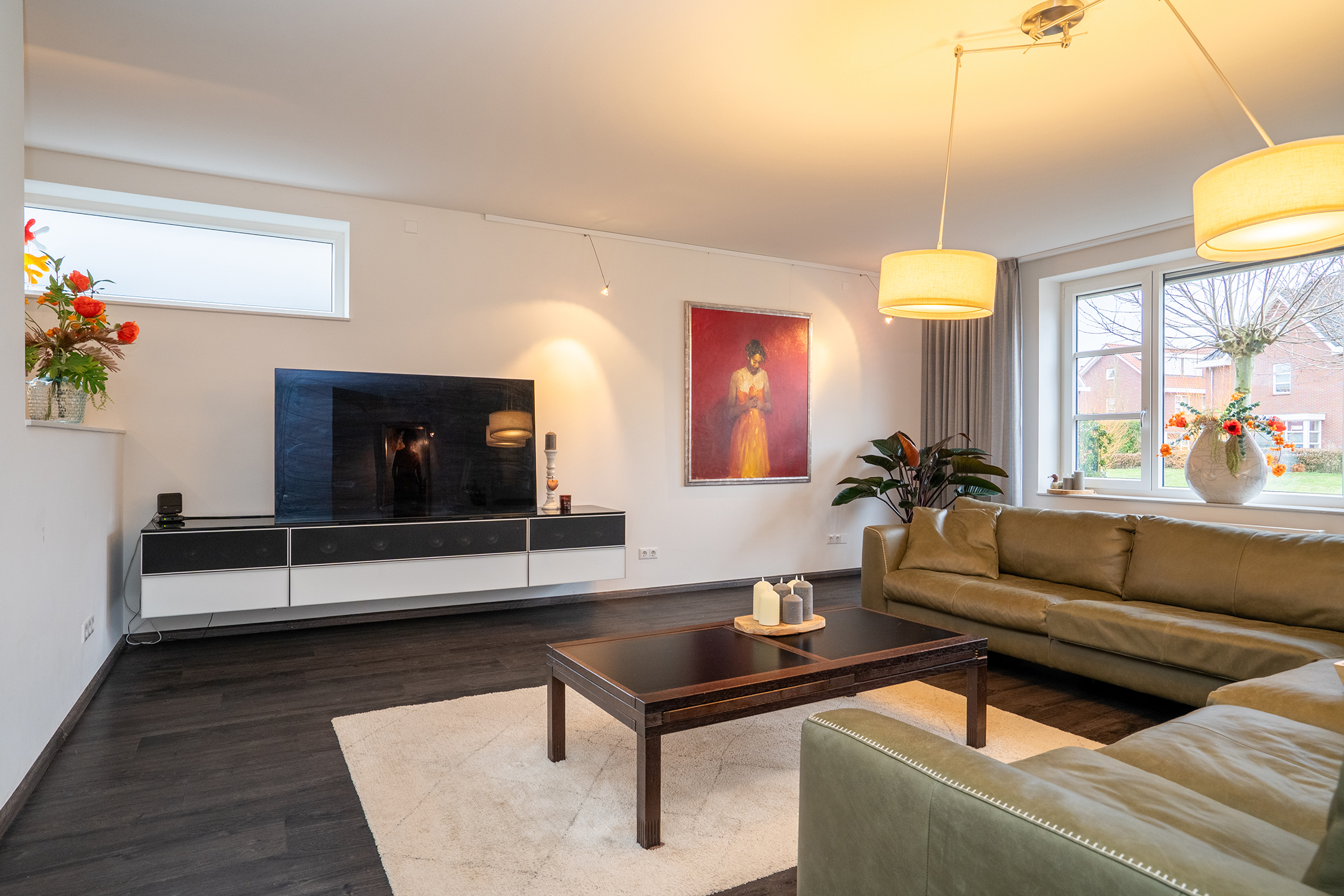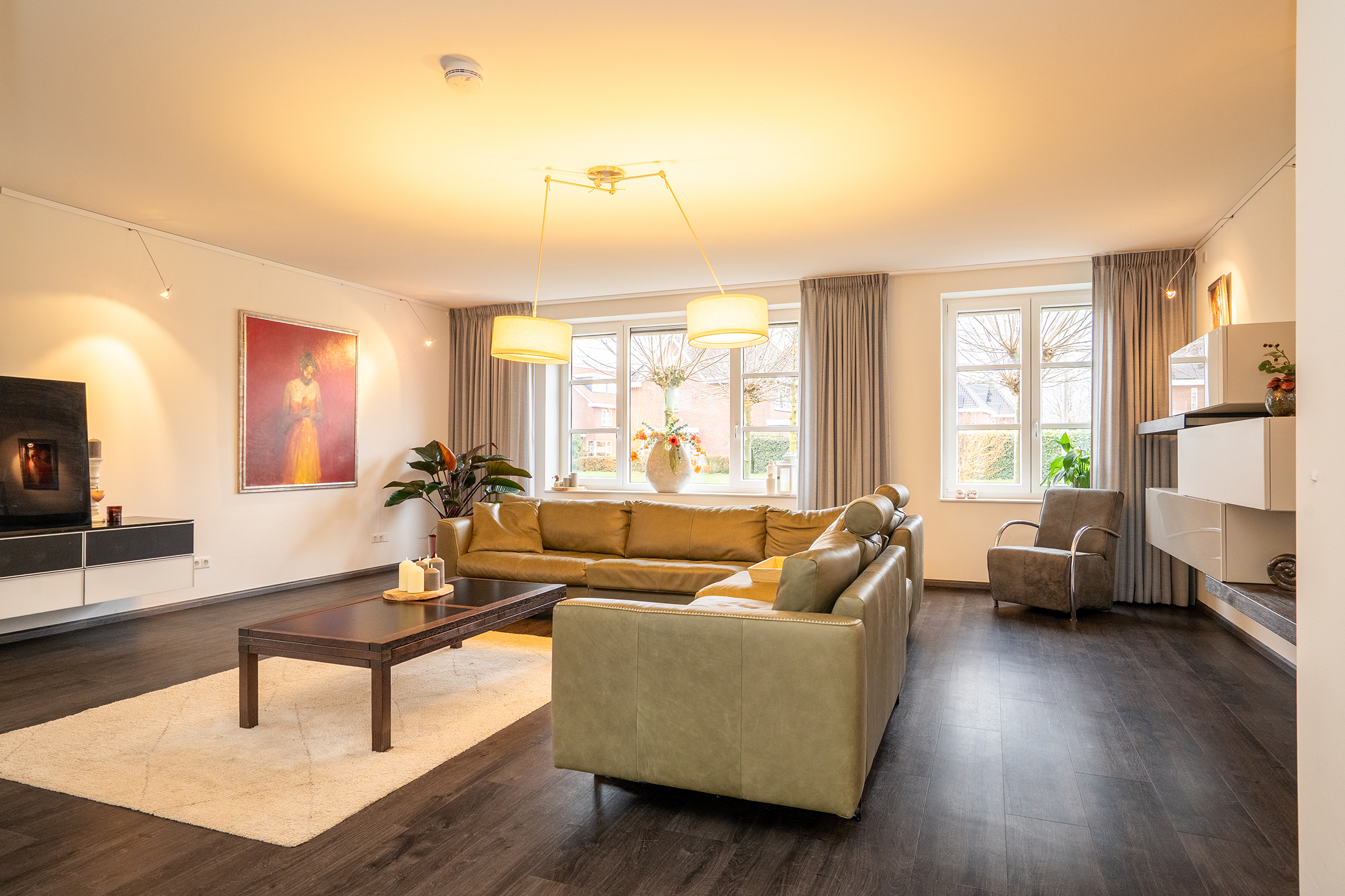 Bij binnenkomst ervaart u direct de ruimte en het prettige licht. De royale woonkamer is een heerlijke leefruimte met grote raampartijen en een open verbinding naar de keuken. Extra sfeer wordt gecreerd door de doorzichtige gashaard tussen keuken en woonkamer. De keuken is ruim opgezet, modern uitgevoerd en biedt volop werk- en bergruimte – ideaal voor zowel dagelijks gebruik als gezellige diners.