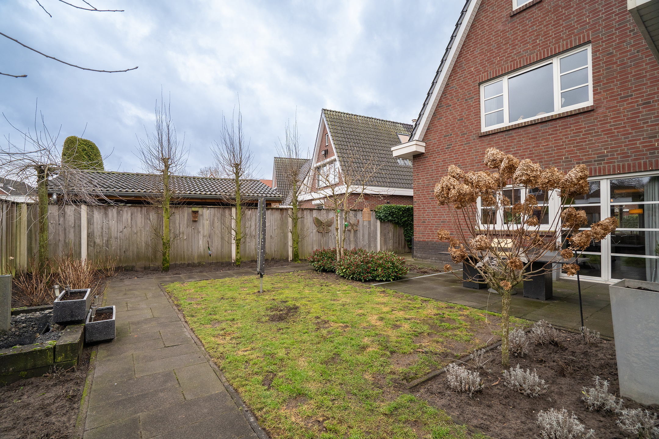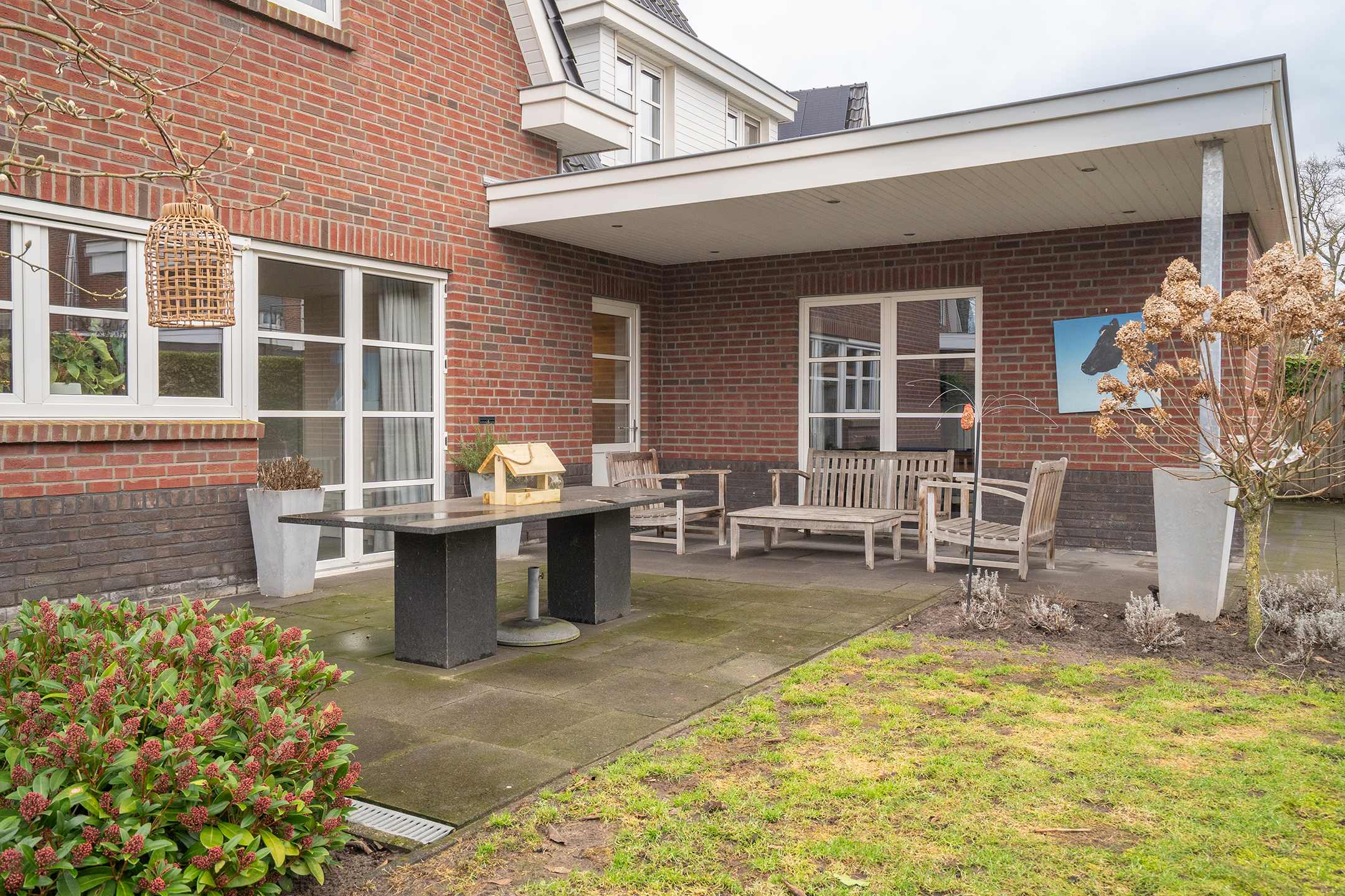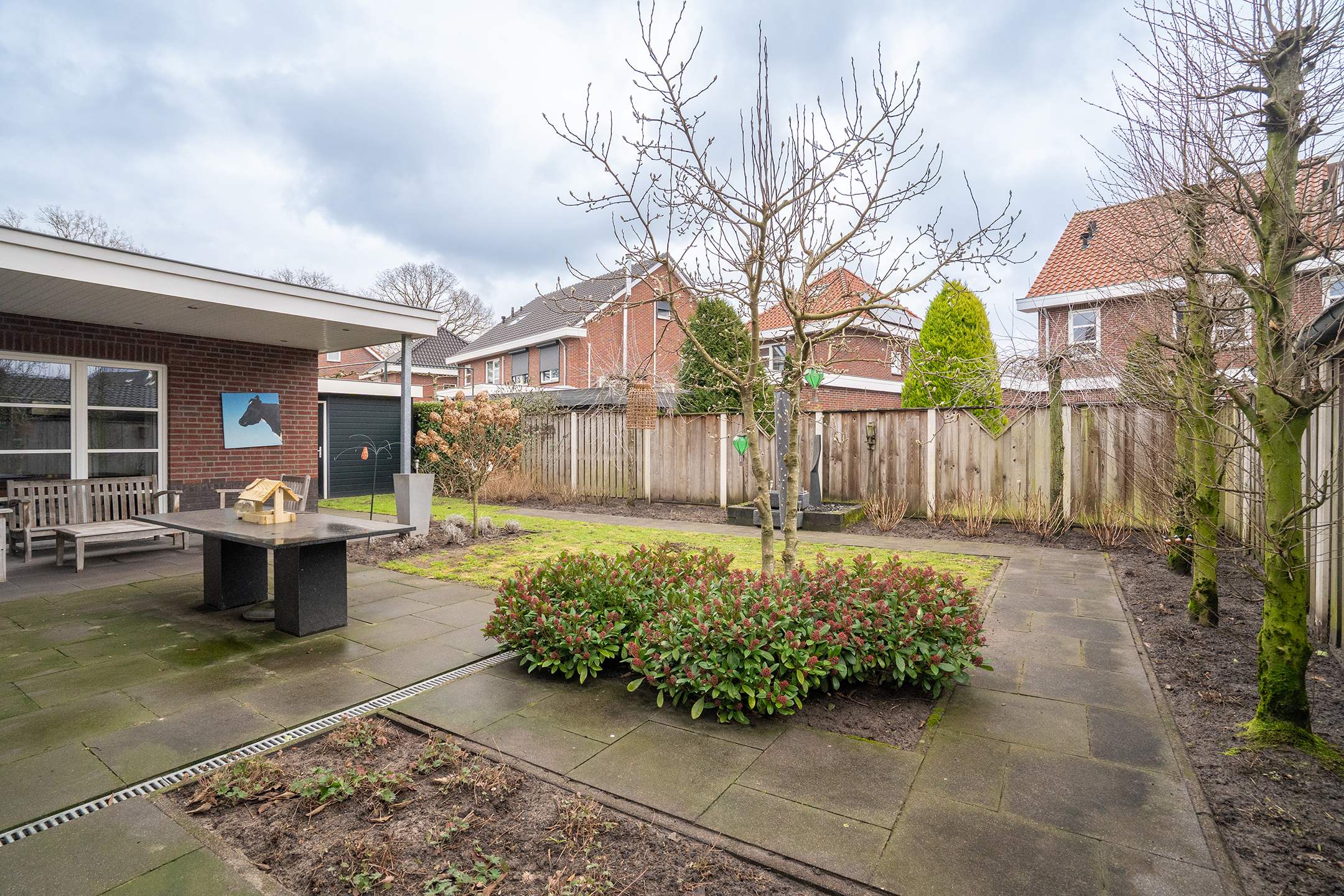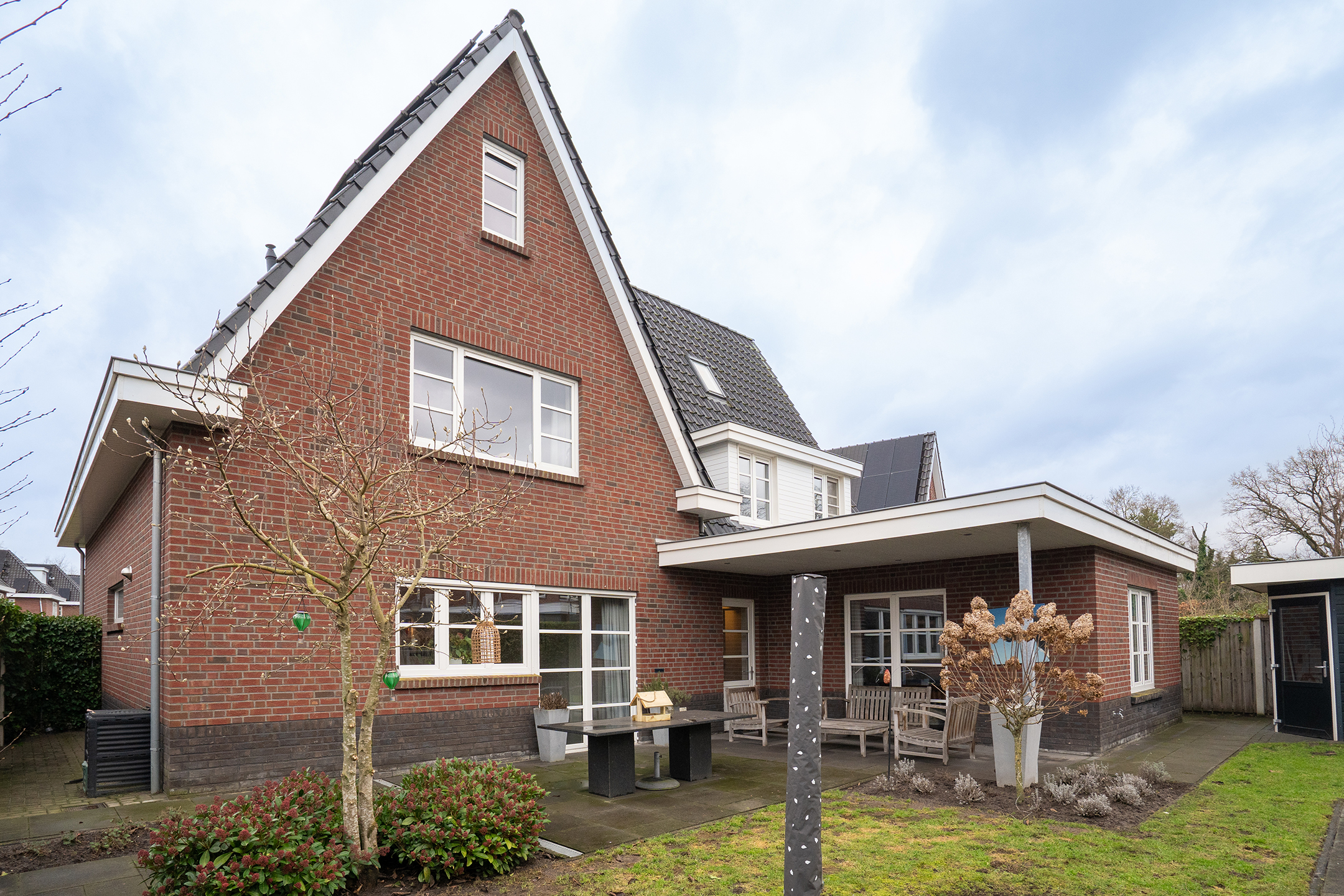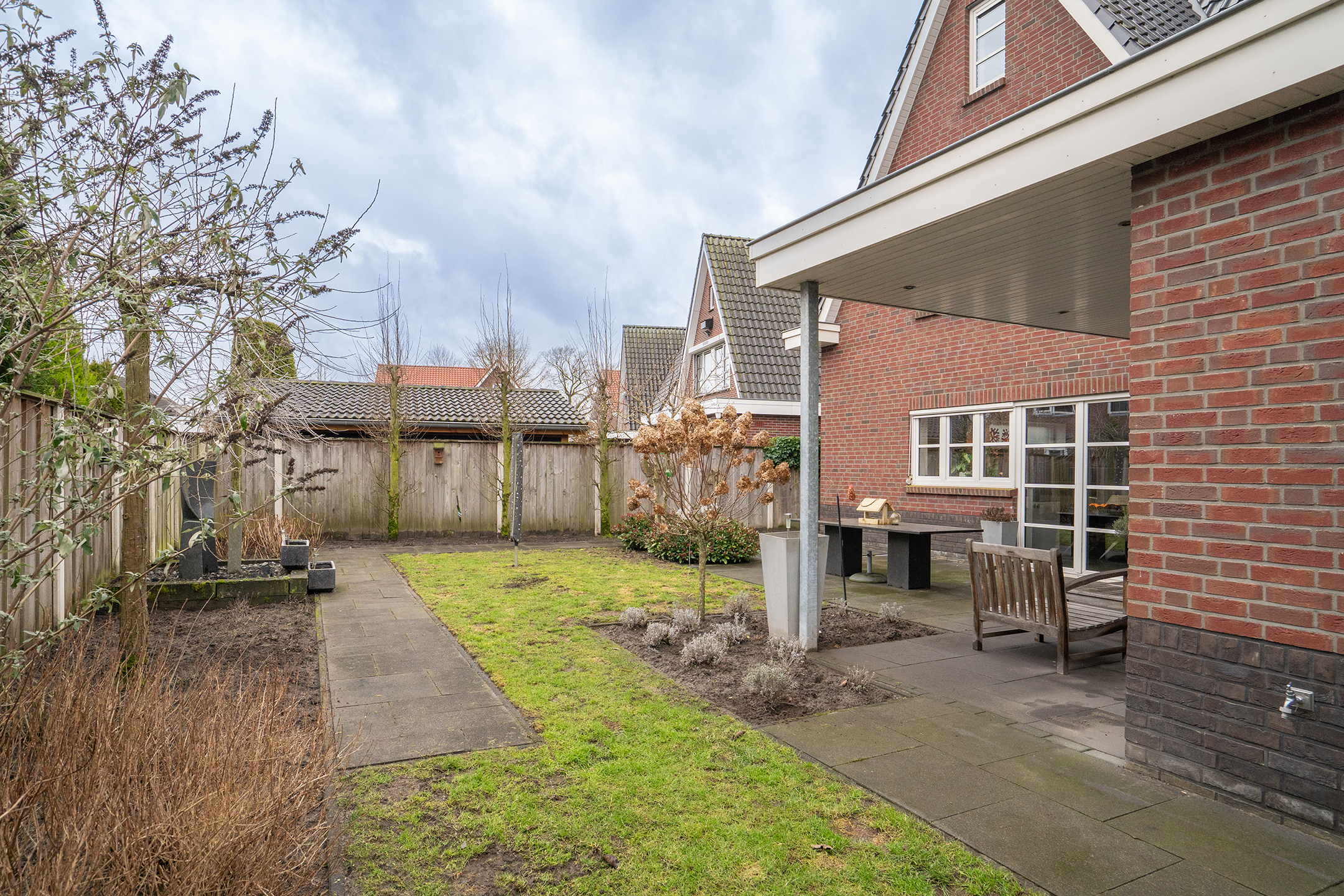 De tuin rondom de woning is verzorgd aangelegd en biedt voldoende privacy. Dankzij het perceel van 501 m² is er altijd een plek in de zon of schaduw te vinden. De overkapping en terrassen maken het buitenleven hier compleet.