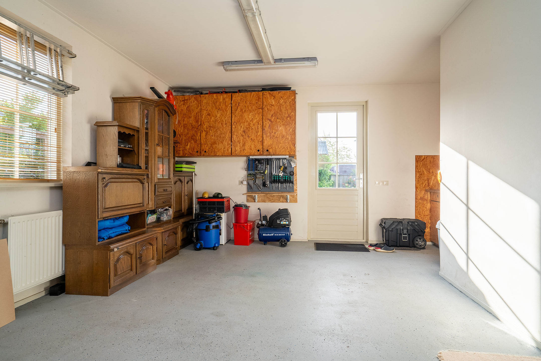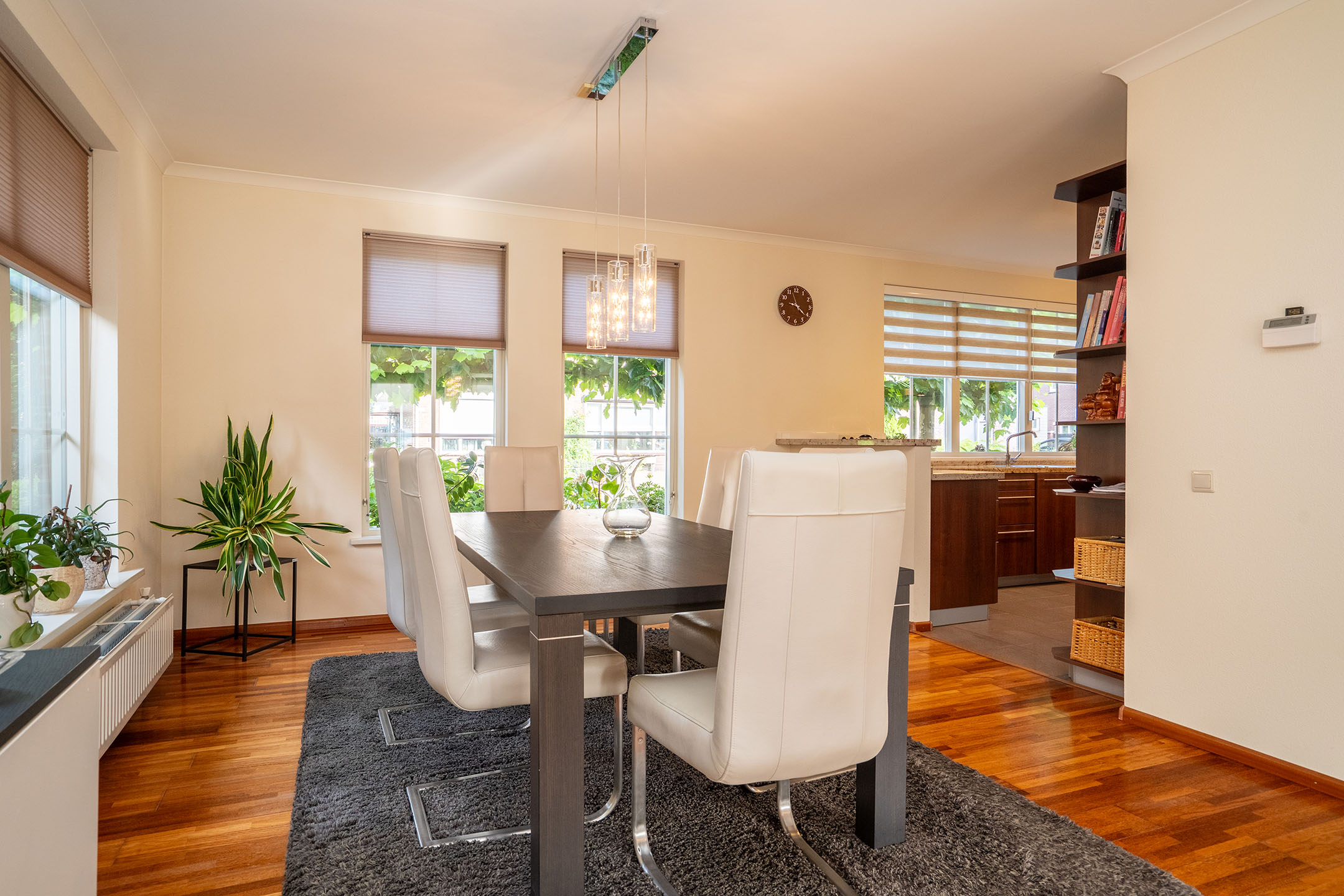 Begane grond: De entree is uitnodigend en geeft toegang tot de ruime woonkamer. Dankzij de vele raampartijen valt er volop daglicht binnen en geniet je van een prachtig uitzicht op de tuin. Via de dubbele tuindeuren verbind je binnen moeiteloos met buiten. De keuken met eetkamer is ruim opgezet: dé plek waar koken en gezelligheid samenkomen. Met familie of vrienden aan de lange tafel is dit de ideale ruimte om samen te genieten. Aangrenzend bevindt zich de inpandige garage, praktisch voor de auto, fietsen of extra opslag.