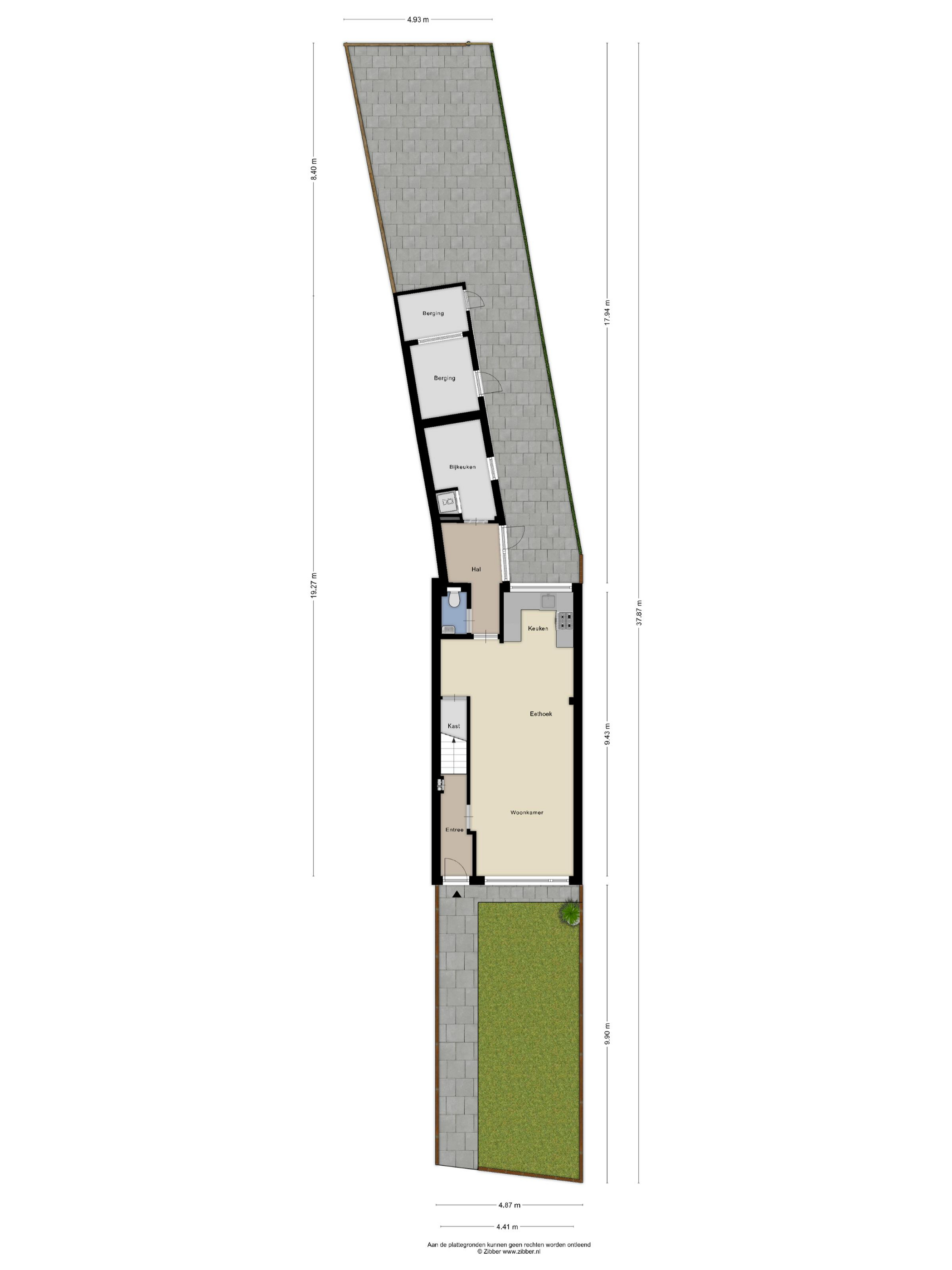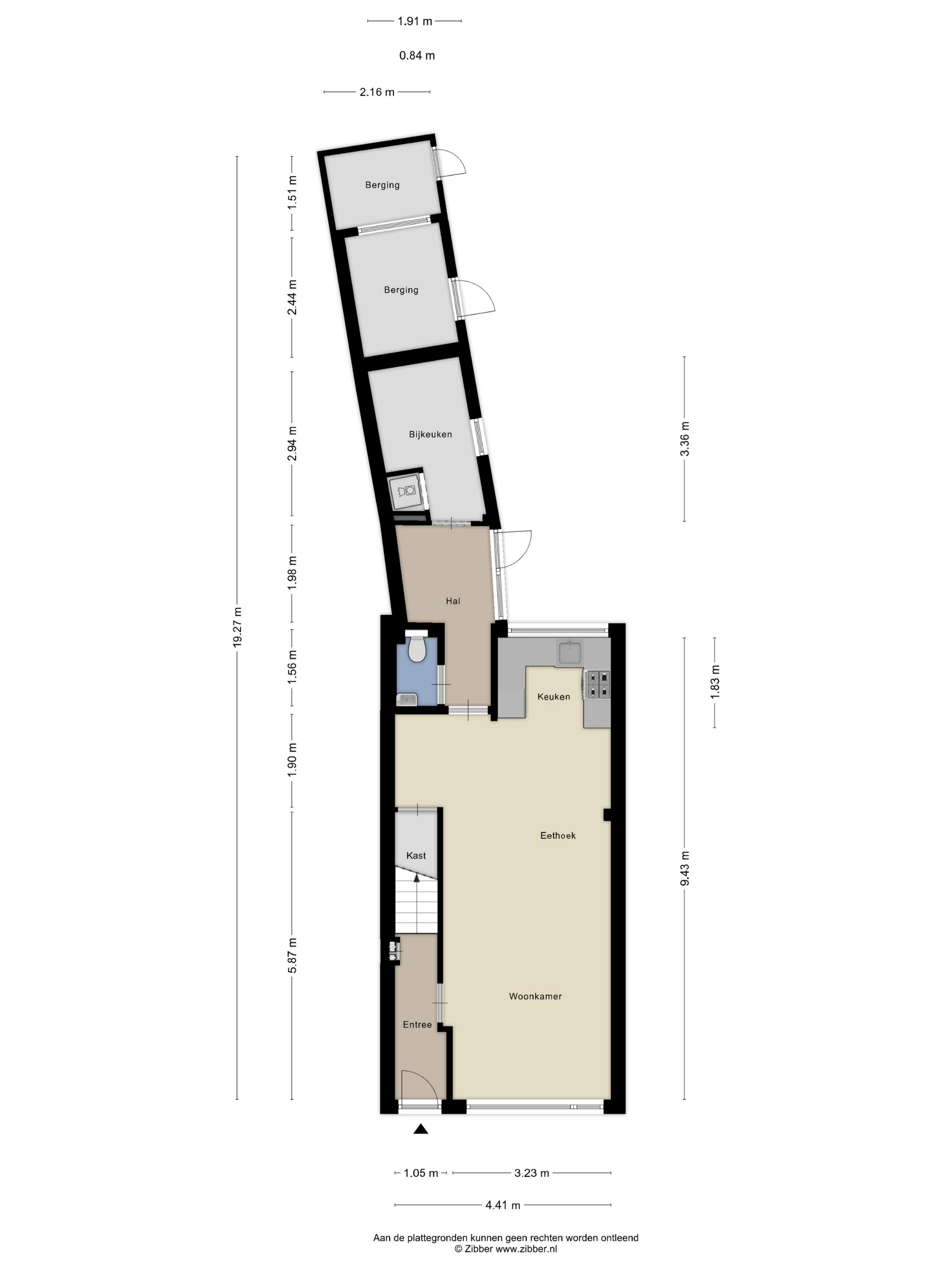 Begane grond indeling: Via de entree kom je binnen in de lange hal met meterkast, trapopgang en toegang tot de woonkamer.